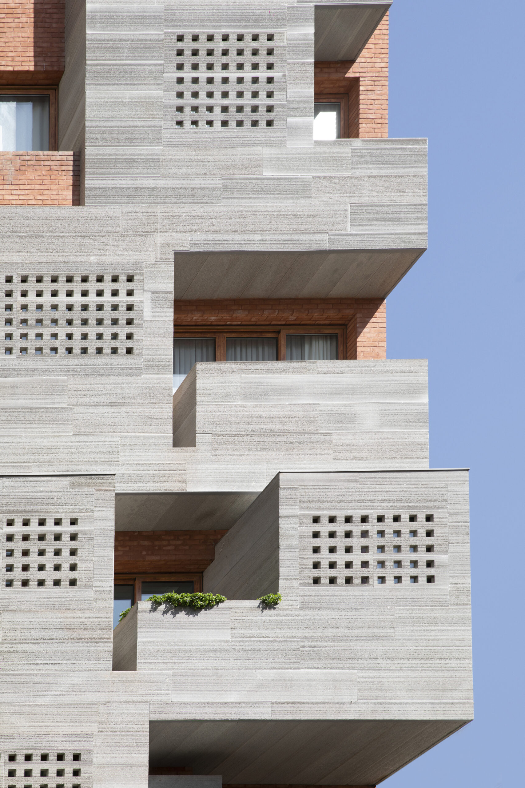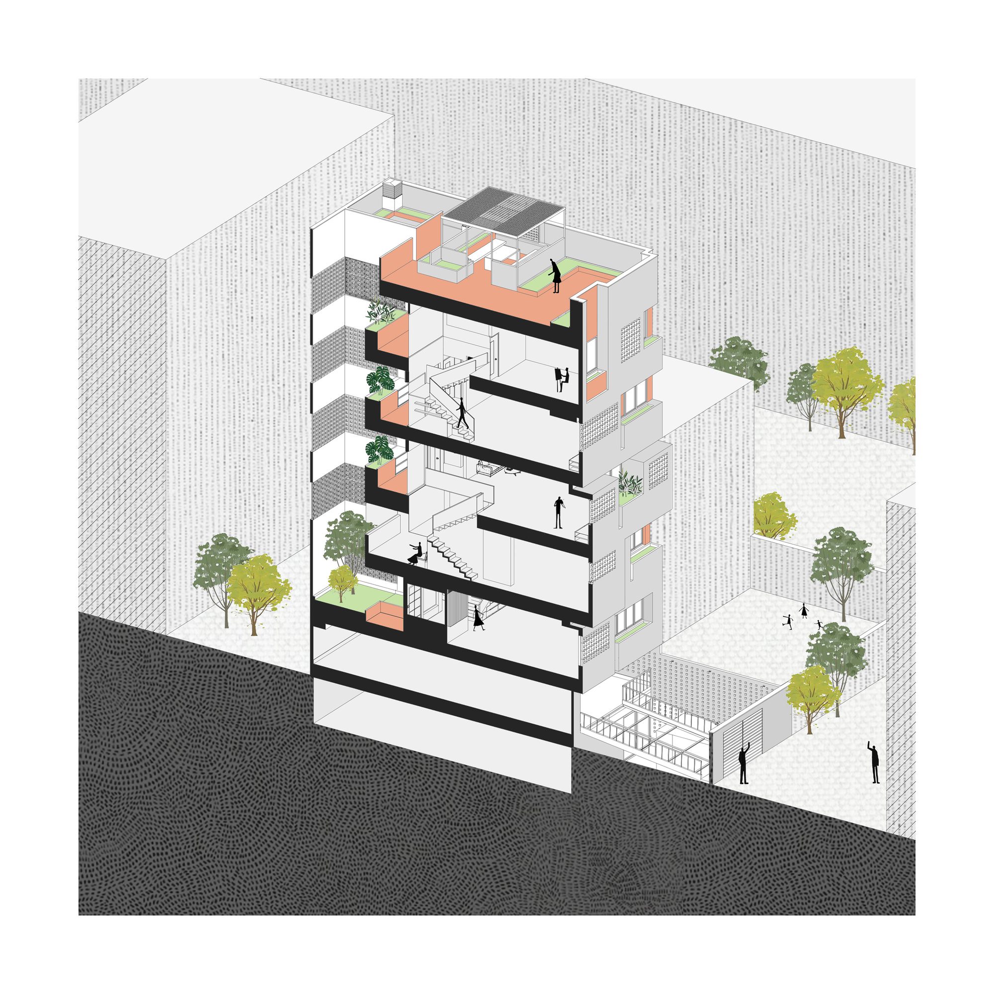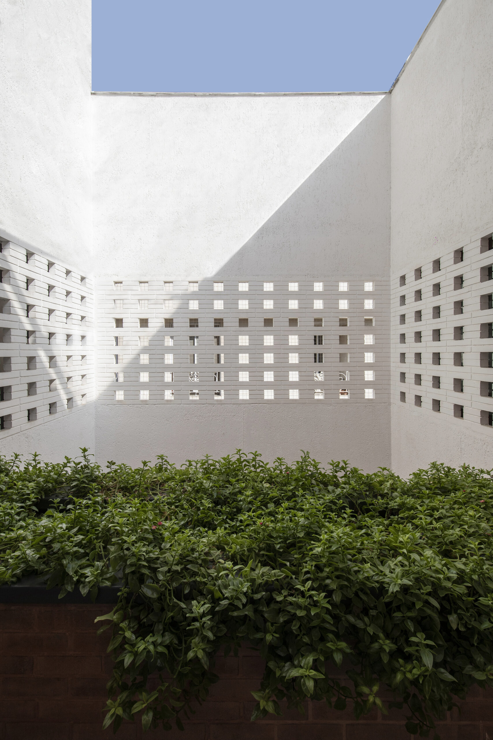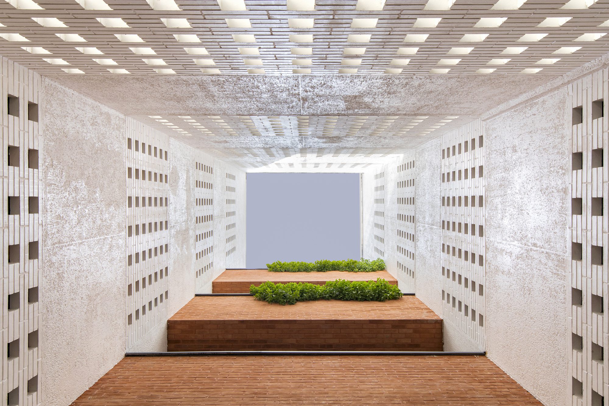 The project faces a common neighborhood space that is hidden from the view of the southern alley, which means the units use the south side only to benefit from the south light but in terms of quality, they have turned towards an inner yard that offers most of the interior spaces a view. A brick-mesh wall is between the yard and the staircase, and each floor’s semi-open entrance makes this inner yard easily accessible for all levels.