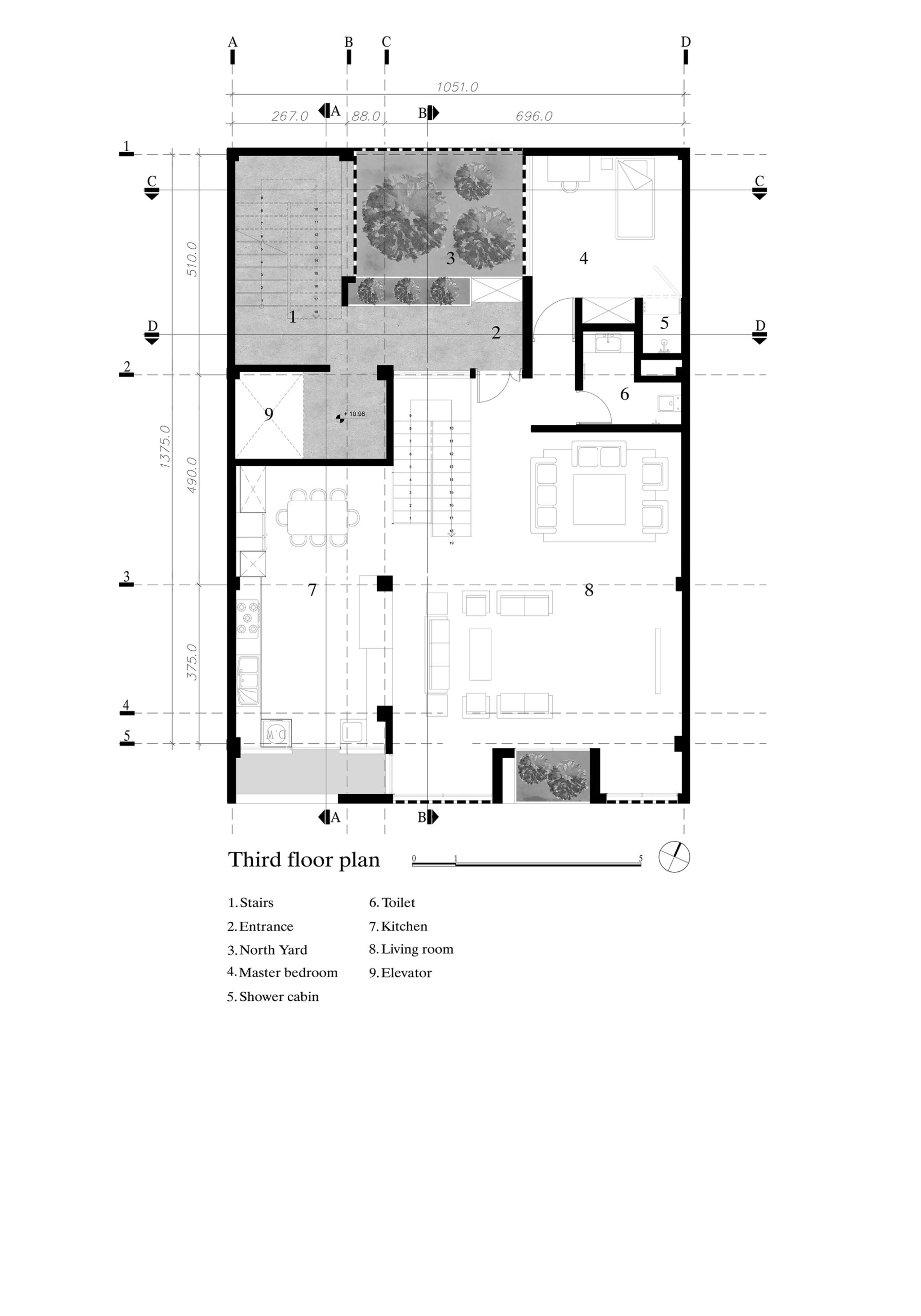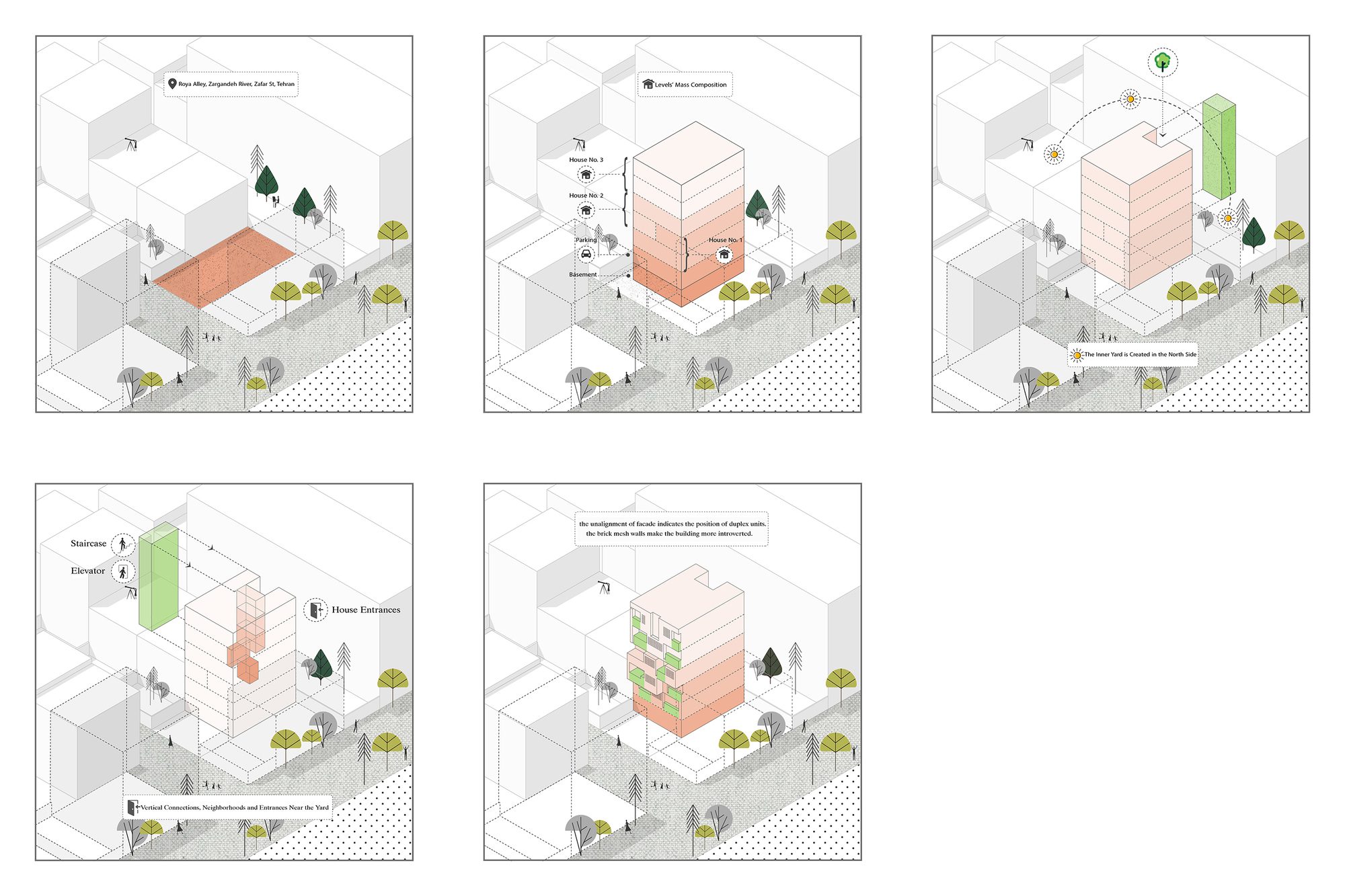 The main entrance of the parents’ unit is through the fourth floor where there is a guest room, a salon, and a kitchen. On the last floor, there are three rooms, a bathroom, a toilet, a laundry, and the main living room where the whole family gathers, facing the inner yard. The volume of each duplex unit is indicative and separated from the adjacent unit in the south façade. The rough gray mesh skin is the outermost part of the façade. The inner yard’s skin including windows and the intimate color and texture of the brick emphasizes the introverted nature of the houses. Finally, it can be said that in this project, the concept of a staircase and vertical connection, the concept of a patio, and the concept of a south façade have been changed with the aim of increasing the quality and creating common spaces for a family living in three houses of plate No 1 residential complex.