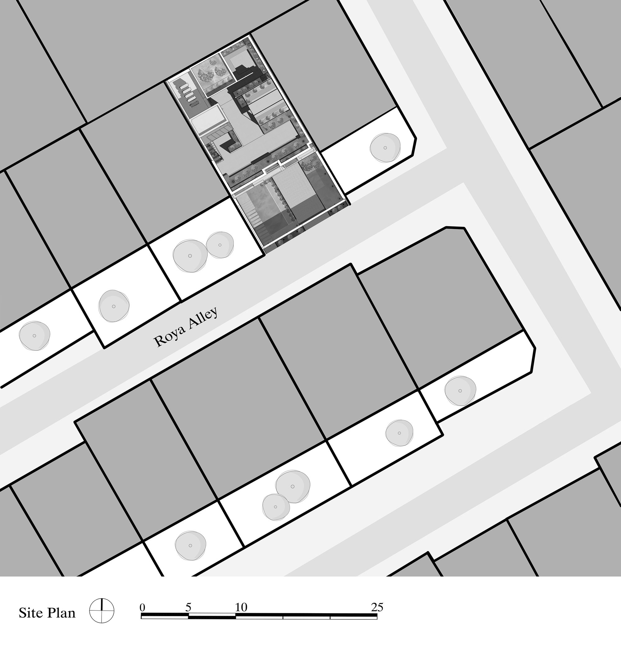 The parking and lobby are located on the ground floor. One of the duplex units is located on the first floor and the east side of the second floor. The guest room, salon, and kitchen are on the first floor. From the east side, a staircase leads to the second floor which includes two bedrooms with separate bathrooms and a small hall that overlooks the inner yard. The third floor and the west side of the second floor are allocated to the other duplex unit. This unit’s main entrance is through the third floor. This level includes the guest room, salon, and kitchen. Two bedrooms and a small hall are on the lower floor overlooking the inner yard.