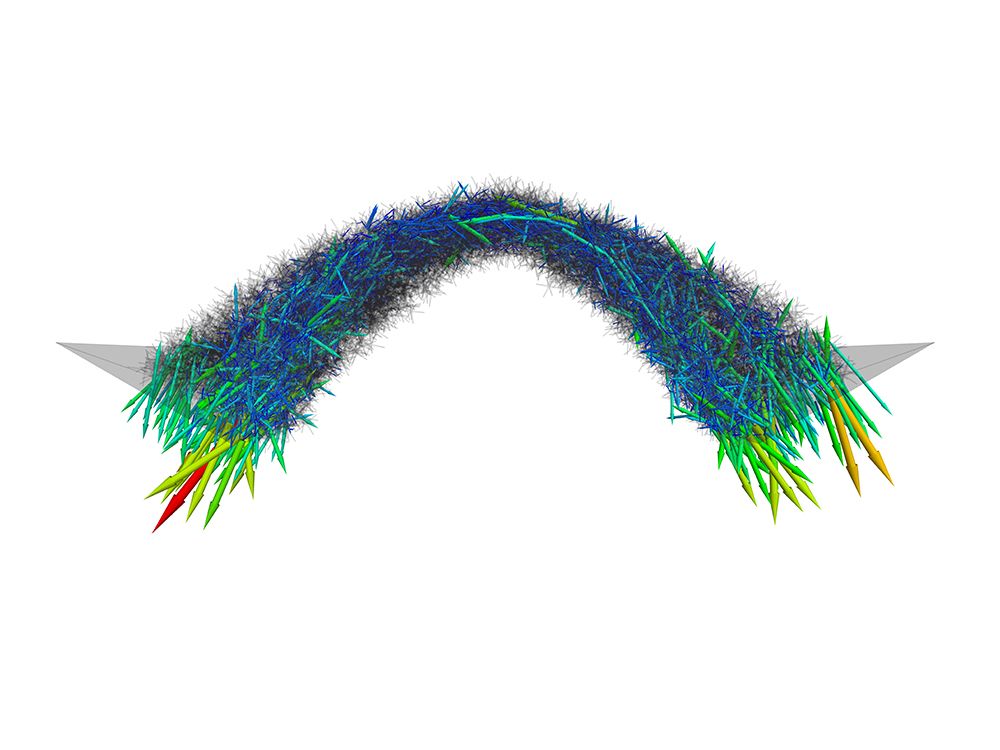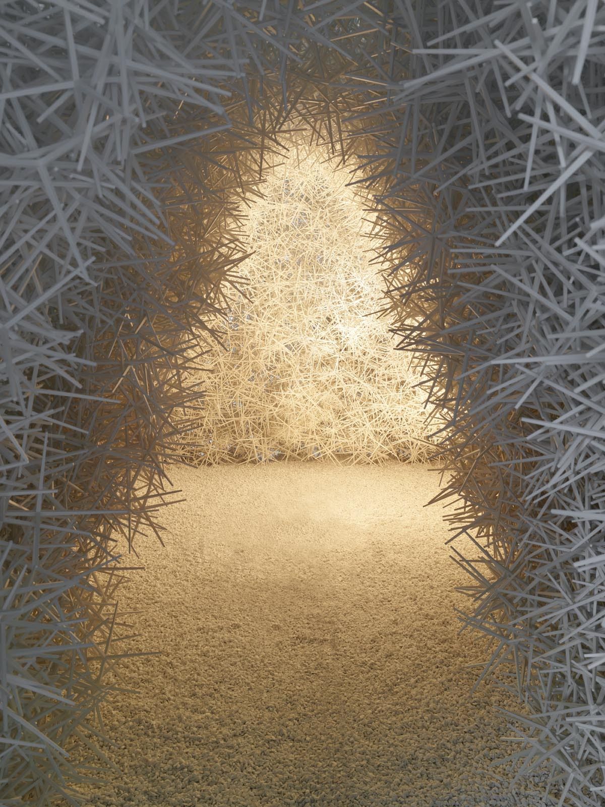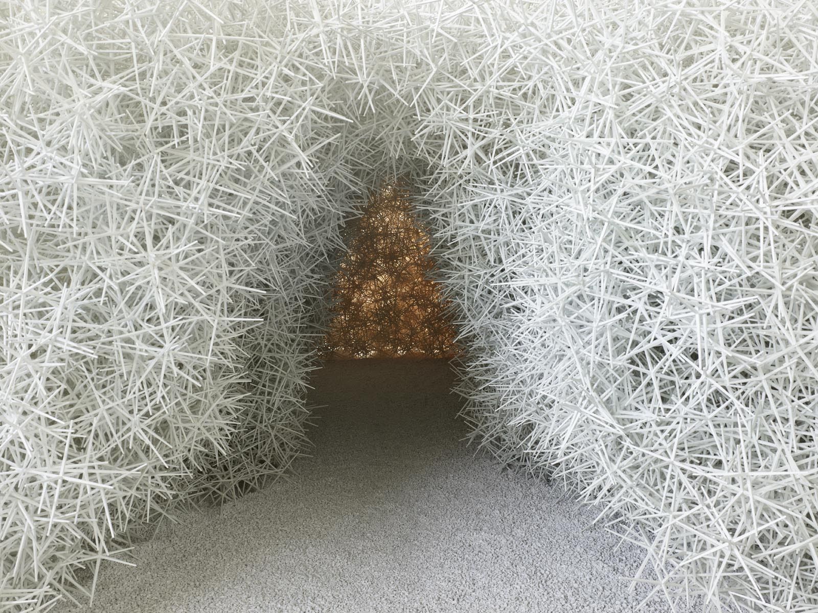 The Institute for Computational Design and Construction’s Aggregate Pavilion 2018 is the first fully enclosed architectural space that is entirely constructed from designed parts that are only in loose frictional contact with each other. The enclosed pavilion, composed of star-like particles, showcases the results of 10 years of research done on granular materials for architecture.