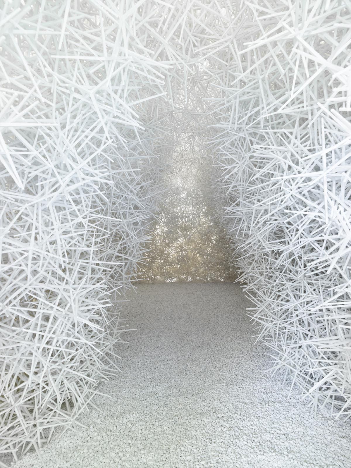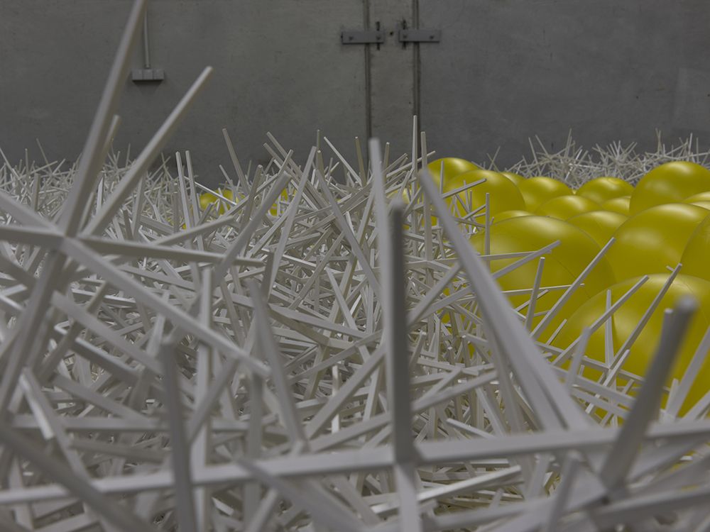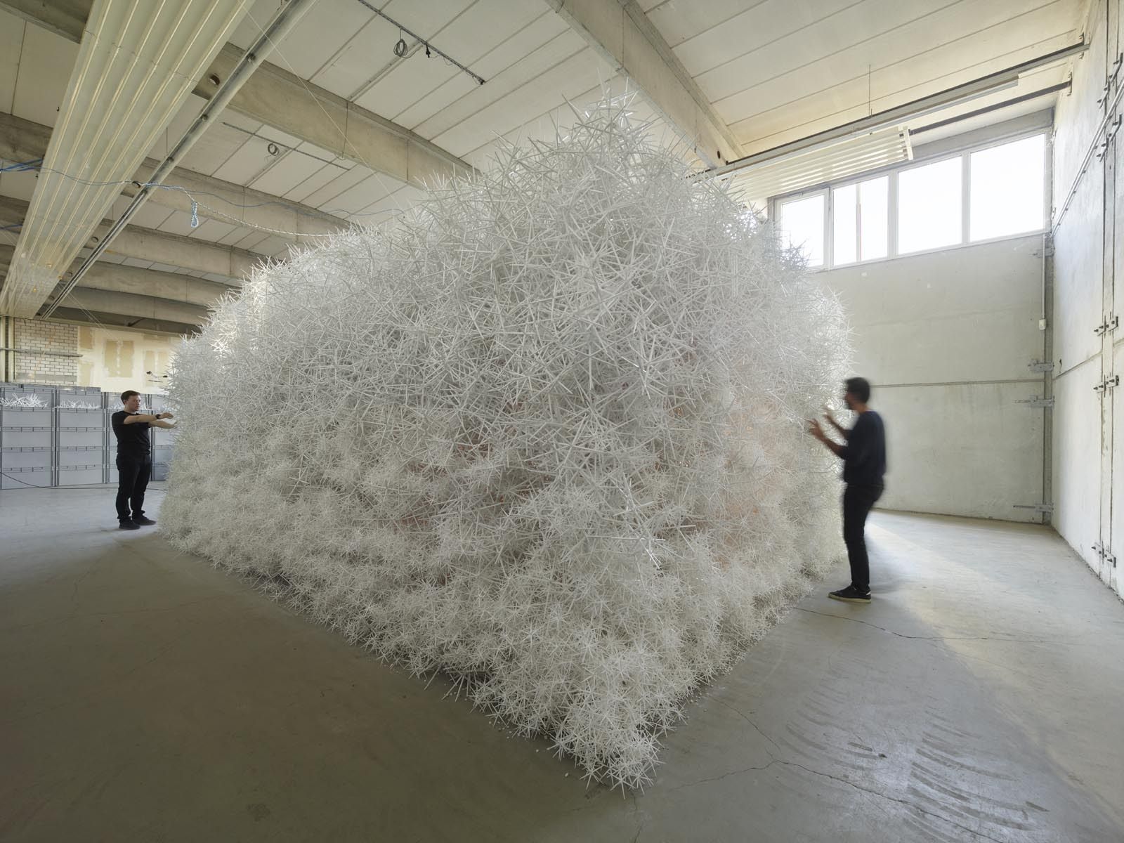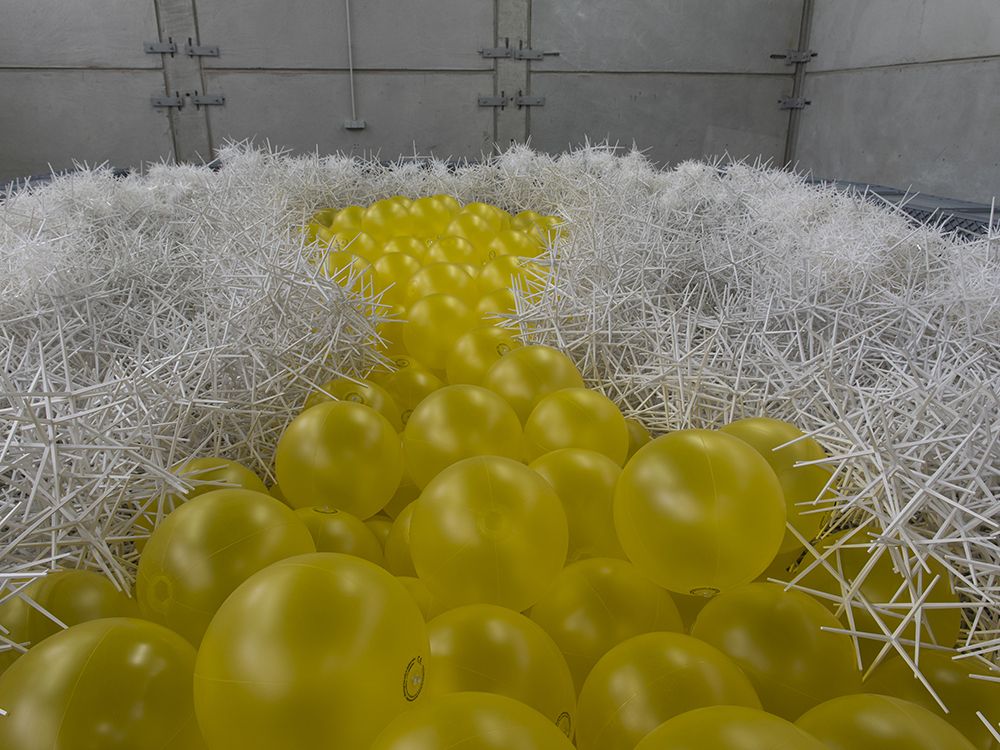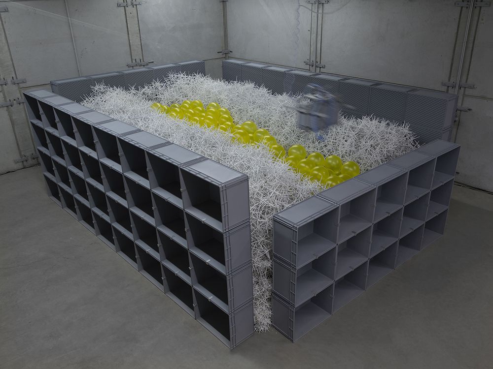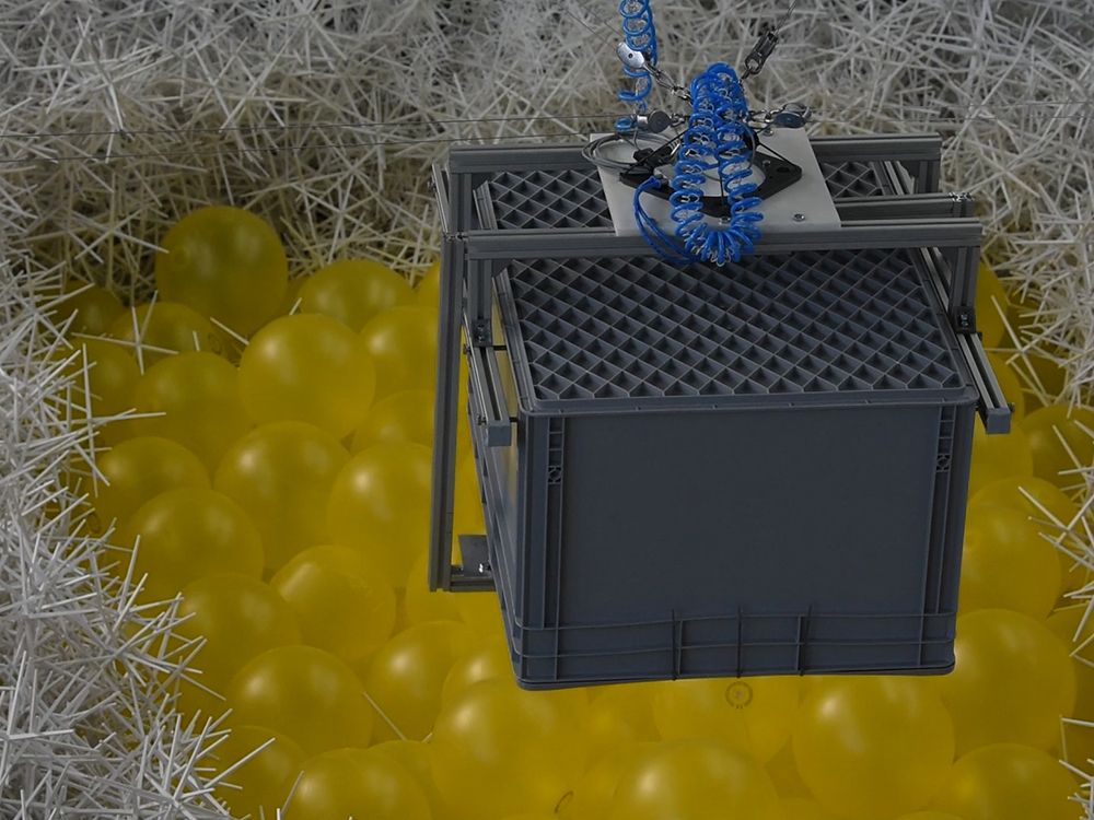 Karola Dierichs and Achim Menges led the team at the ICD University Stuttgart to create the 70,000 star-shaped particles. The Hexapods and the Dekapods were made in-situ using injection-molded recycled plastic, while the convex spheres are ready-made inflatables. An added benefit of the convex spheres being inflatable is that they have a low packing volume but a high deployable volume. The construction of the pavilion was done within a space of 9×10 meters. The team used a cable driven parallel robot—fixed at four points onto the wall and the supporting beam structure of the space. The limits of the enclosure were demarcated using storage boxes. The enclosure kept growing as the robot dropped the granular material into it, at particular points, defined by a custom-written interface. Within the pavilion, two interconnected vaults were created entirely from the unbounded granular material.This self-supporting spatial enclosure can be reused and all the particles can make new iterations and reconfigurations of the space.