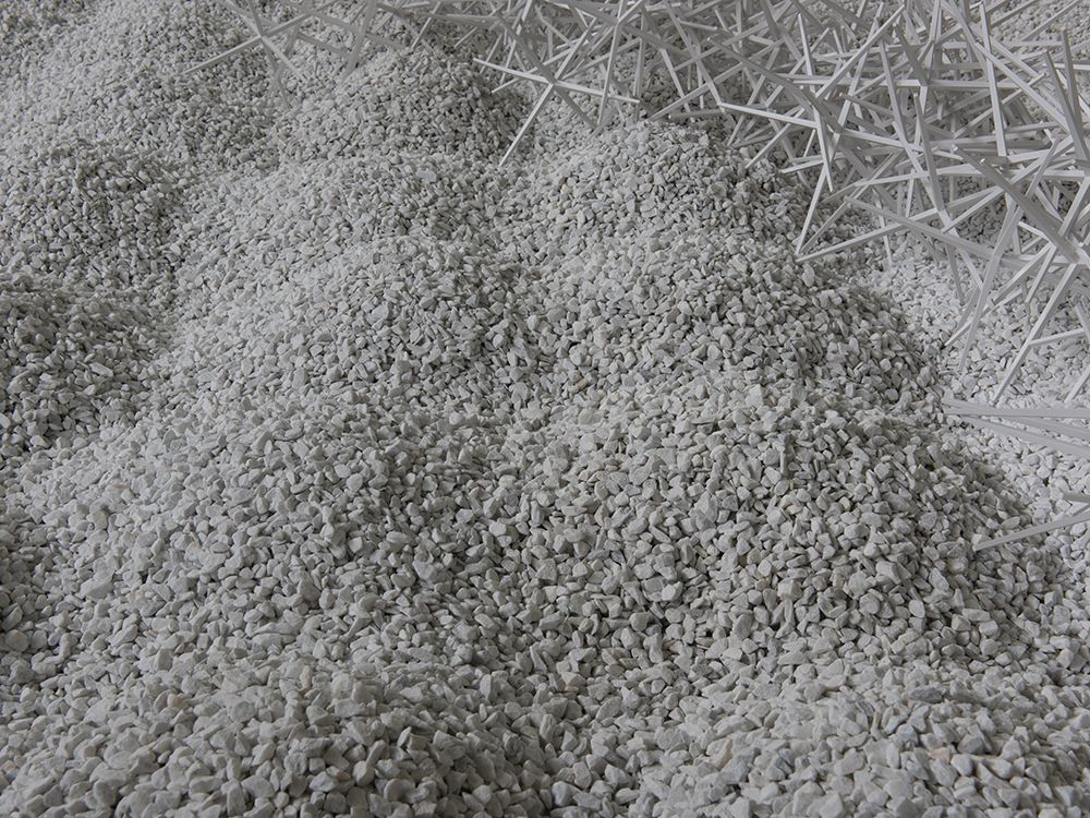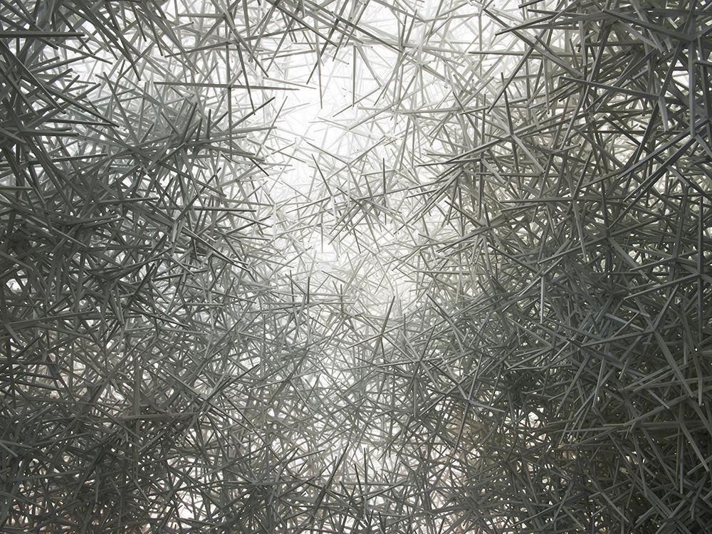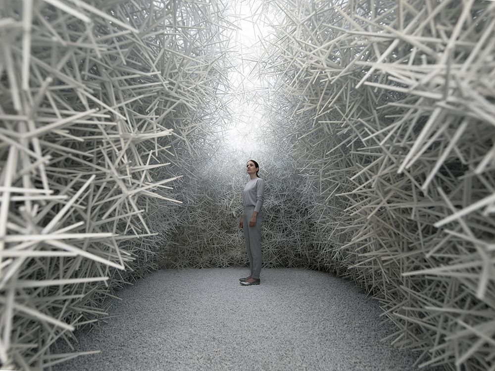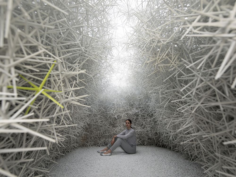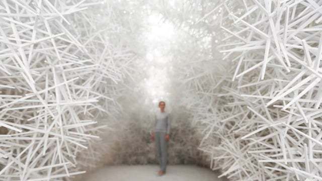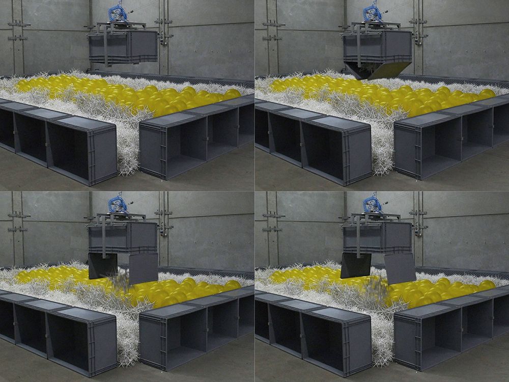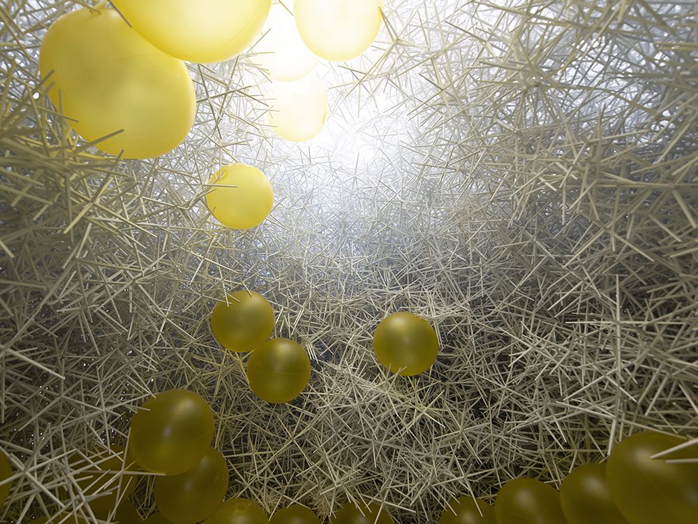 Karola Dierichs and Achim Menges led the team at the ICD University Stuttgart to create the 70,000 star-shaped particles. The Hexapods and the Dekapods were made in-situ using injection-molded recycled plastic, while the convex spheres are ready-made inflatables. An added benefit of the convex spheres being inflatable is that they have a low packing volume but a high deployable volume. The construction of the pavilion was done within a space of 9×10 meters. The team used a cable driven parallel robot—fixed at four points onto the wall and the supporting beam structure of the space. The limits of the enclosure were demarcated using storage boxes. The enclosure kept growing as the robot dropped the granular material into it, at particular points, defined by a custom-written interface. Within the pavilion, two interconnected vaults were created entirely from the unbounded granular material.This self-supporting spatial enclosure can be reused and all the particles can make new iterations and reconfigurations of the space.