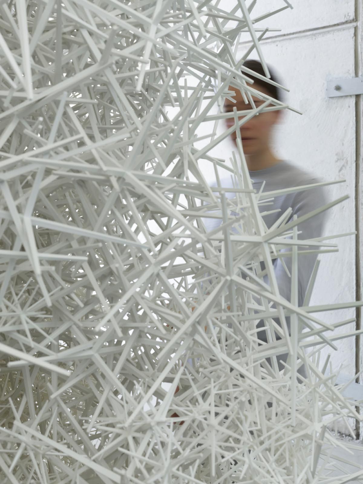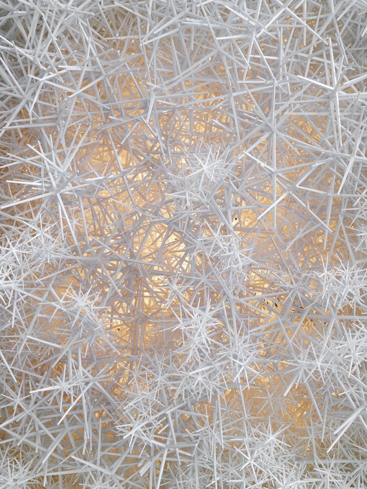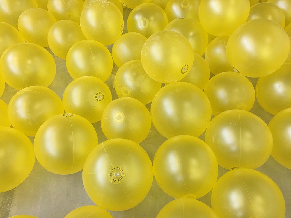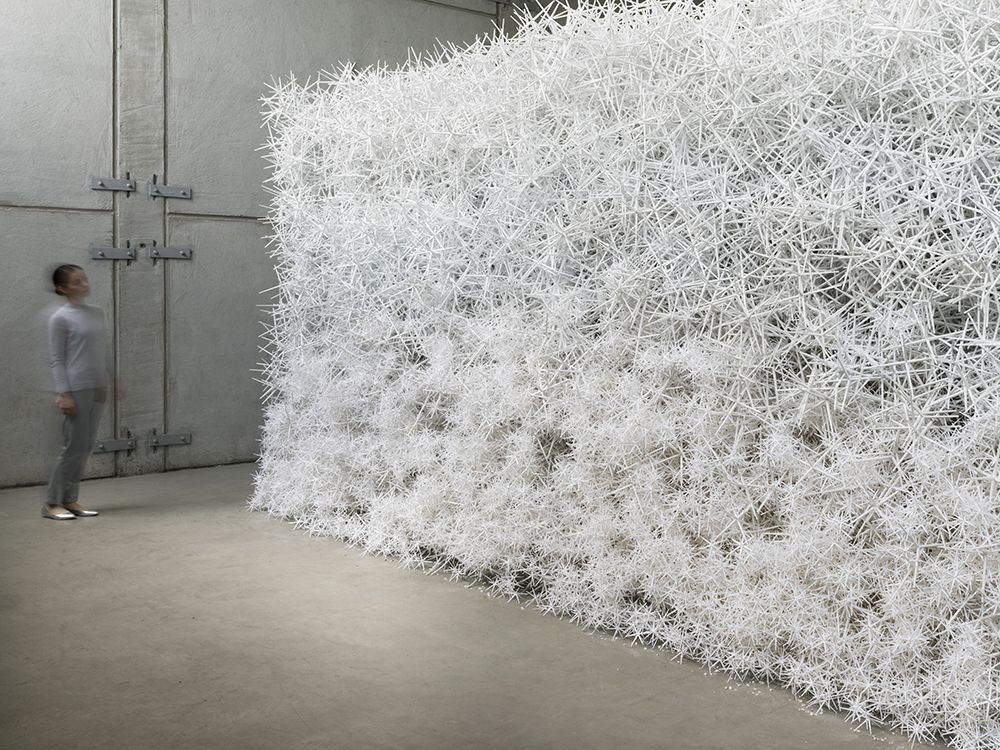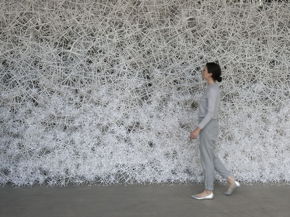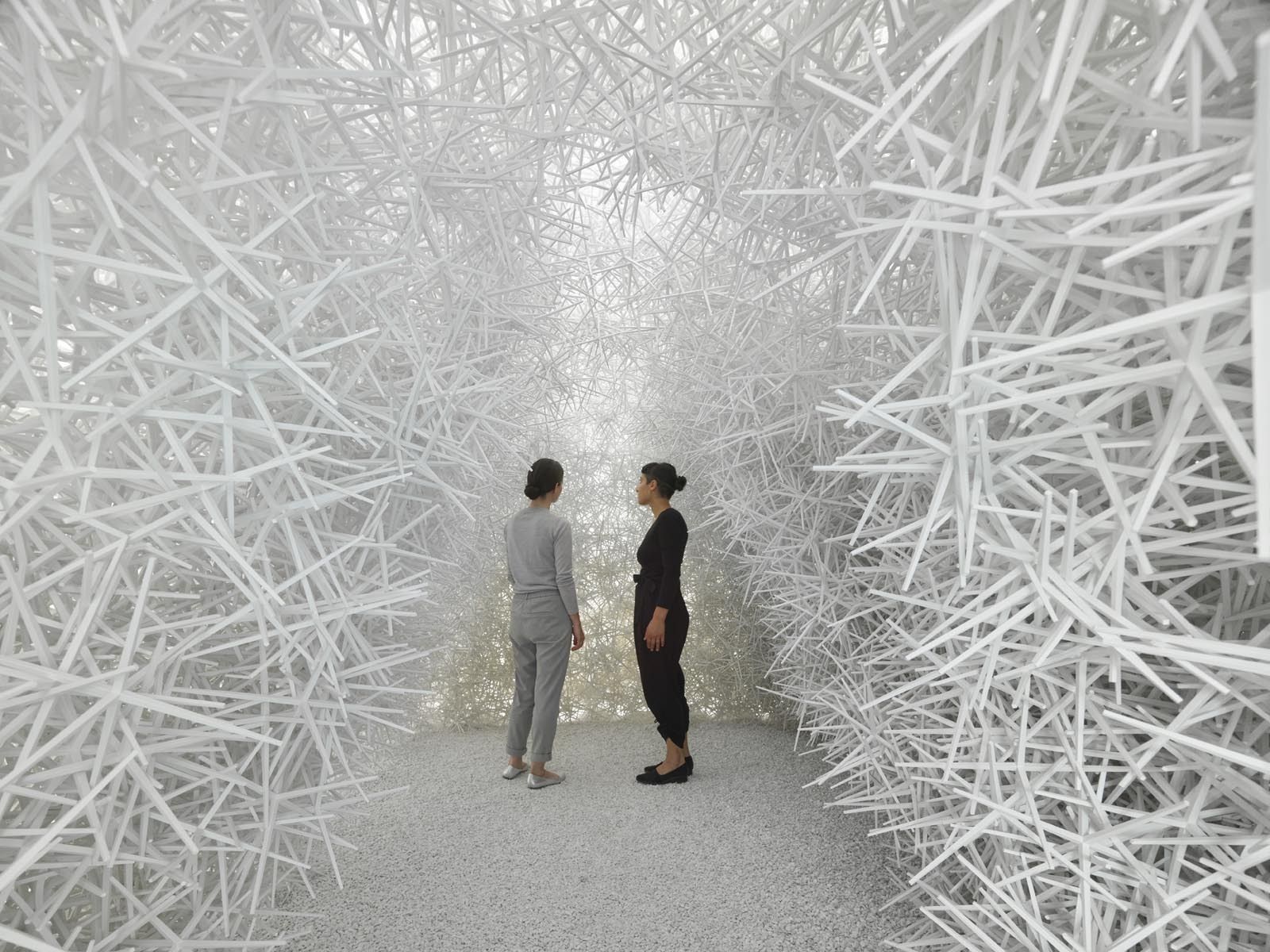 Karola Dierichs and Achim Menges led the team at the ICD University Stuttgart to create the 70,000 star-shaped particles. The Hexapods and the Dekapods were made in-situ using injection-molded recycled plastic, while the convex spheres are ready-made inflatables. An added benefit of the convex spheres being inflatable is that they have a low packing volume but a high deployable volume. The construction of the pavilion was done within a space of 9×10 meters. The team used a cable driven parallel robot—fixed at four points onto the wall and the supporting beam structure of the space. The limits of the enclosure were demarcated using storage boxes. The enclosure kept growing as the robot dropped the granular material into it, at particular points, defined by a custom-written interface. Within the pavilion, two interconnected vaults were created entirely from the unbounded granular material.This self-supporting spatial enclosure can be reused and all the particles can make new iterations and reconfigurations of the space.