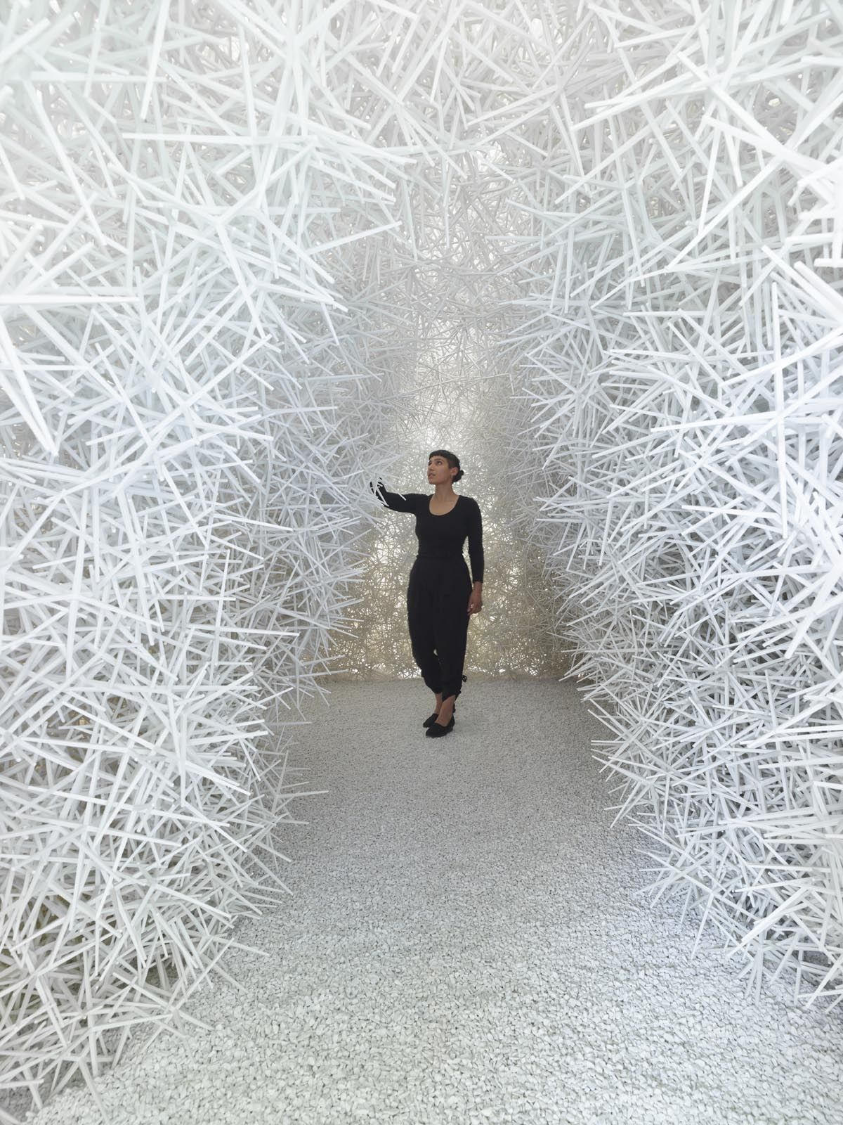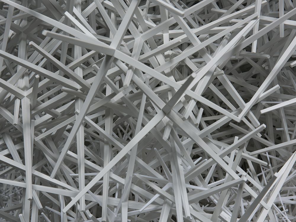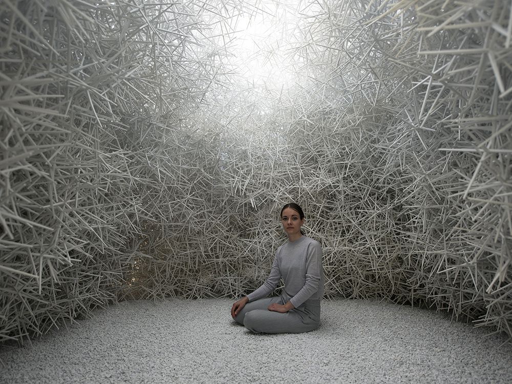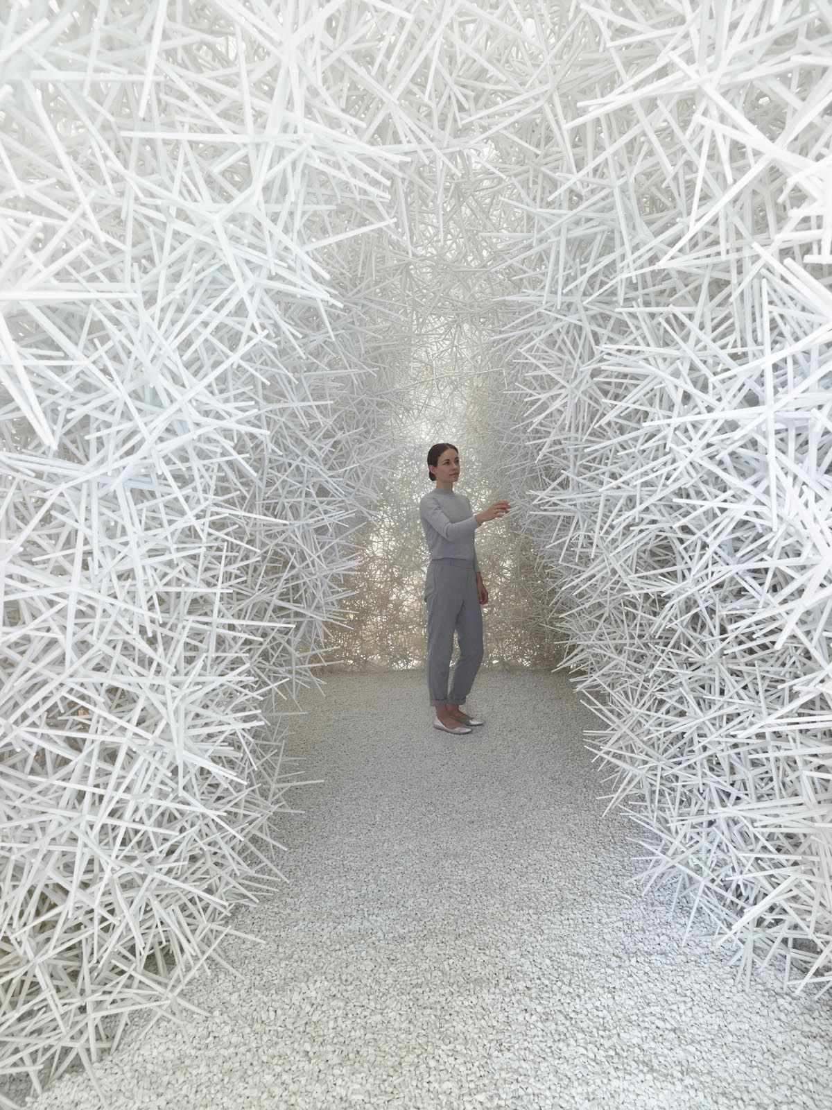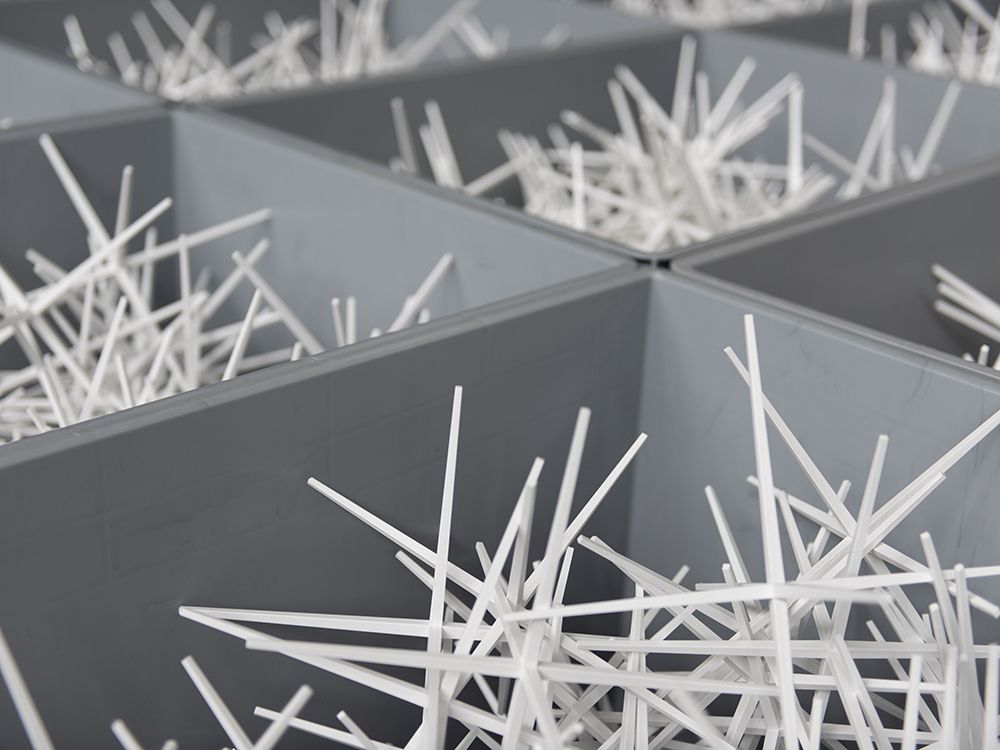 Karola Dierichs and Achim Menges led the team at the ICD University Stuttgart to create the 70,000 star-shaped particles. The Hexapods and the Dekapods were made in-situ using injection-molded recycled plastic, while the convex spheres are ready-made inflatables. An added benefit of the convex spheres being inflatable is that they have a low packing volume but a high deployable volume. The construction of the pavilion was done within a space of 9×10 meters. The team used a cable driven parallel robot—fixed at four points onto the wall and the supporting beam structure of the space. The limits of the enclosure were demarcated using storage boxes. The enclosure kept growing as the robot dropped the granular material into it, at particular points, defined by a custom-written interface. Within the pavilion, two interconnected vaults were created entirely from the unbounded granular material.This self-supporting spatial enclosure can be reused and all the particles can make new iterations and reconfigurations of the space.