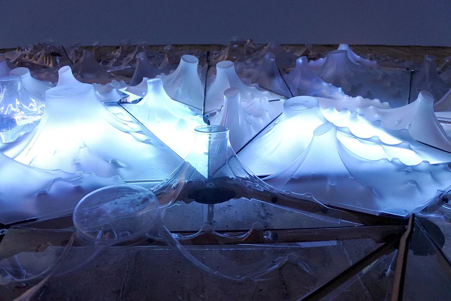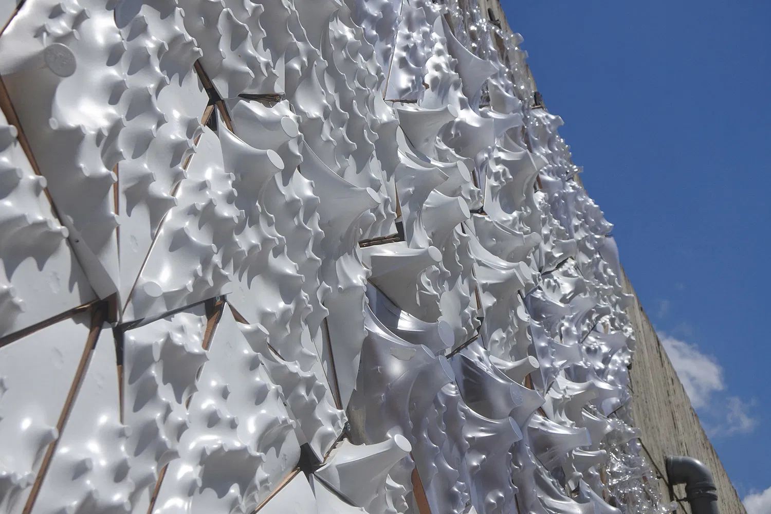 Physical material investigations have been based on the use of vacuum-forming techniques with an innovative approach, whereby the principles of vacuum forming have been transformed into design inputs. This approach has enabled the simultaneous inter-relation of digital and physical experiments. For the fabrication of the facade installation, design explorations focused on form-finding techniques with PVC, a material which is durable for external weather conditions, through the implementation of vacuum-forming processes. The changes in the material behaviour of PVC due to various vacuum and temperature settings were analysed and catalogued. This information served as design parameters for digital design variations.