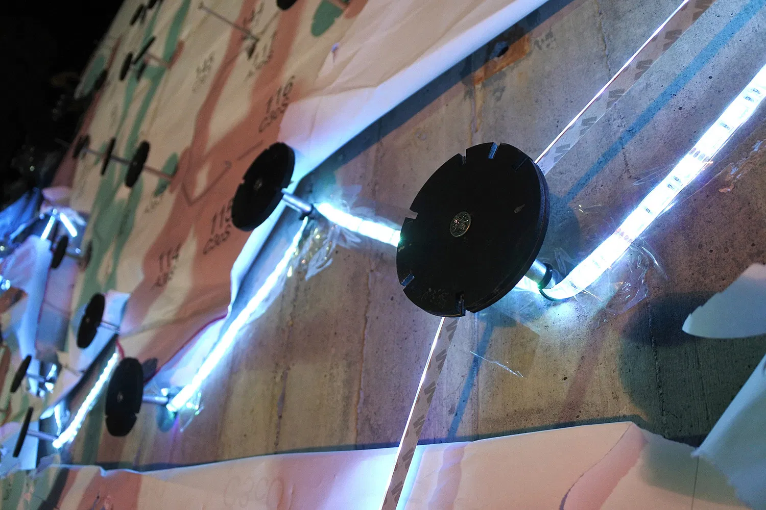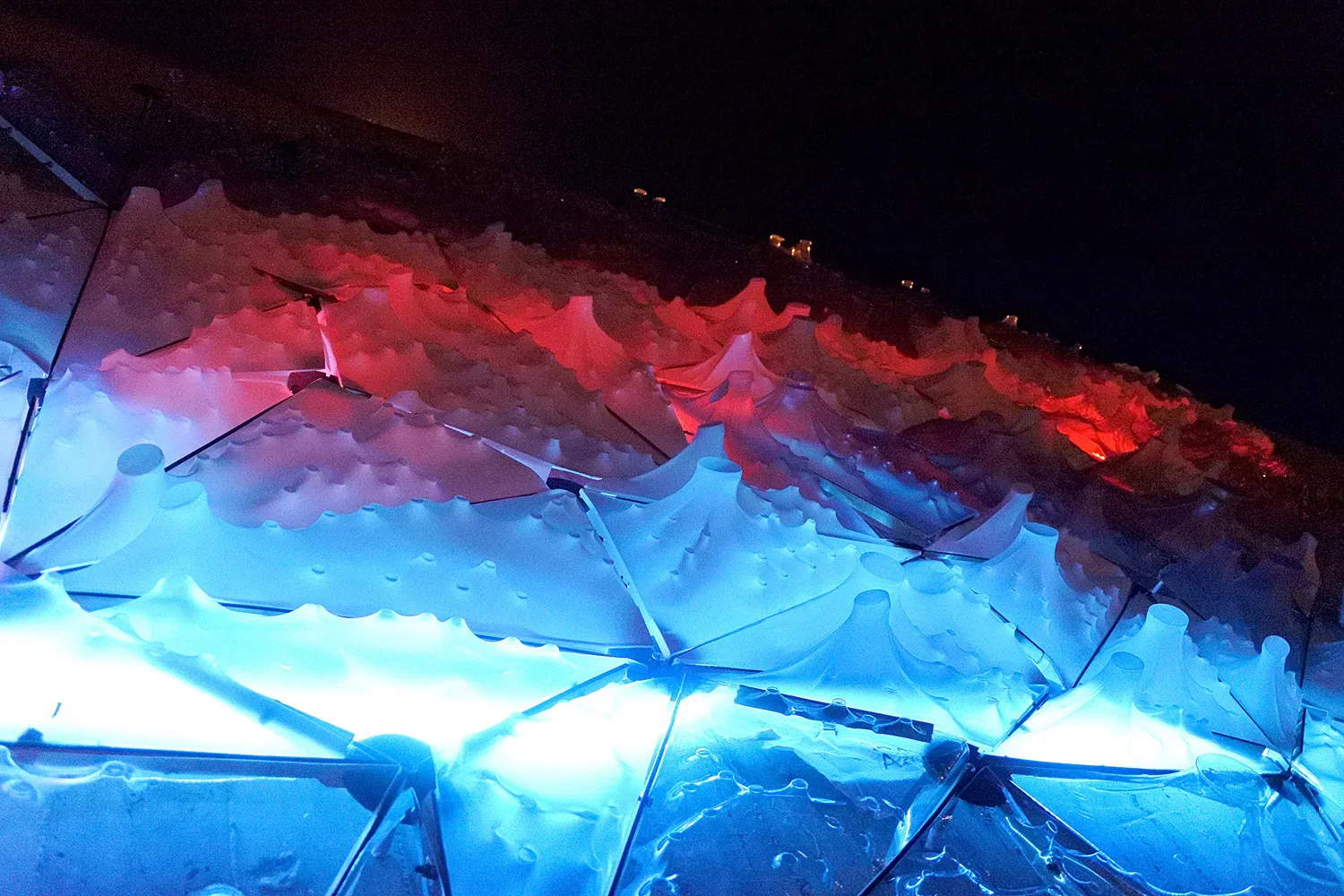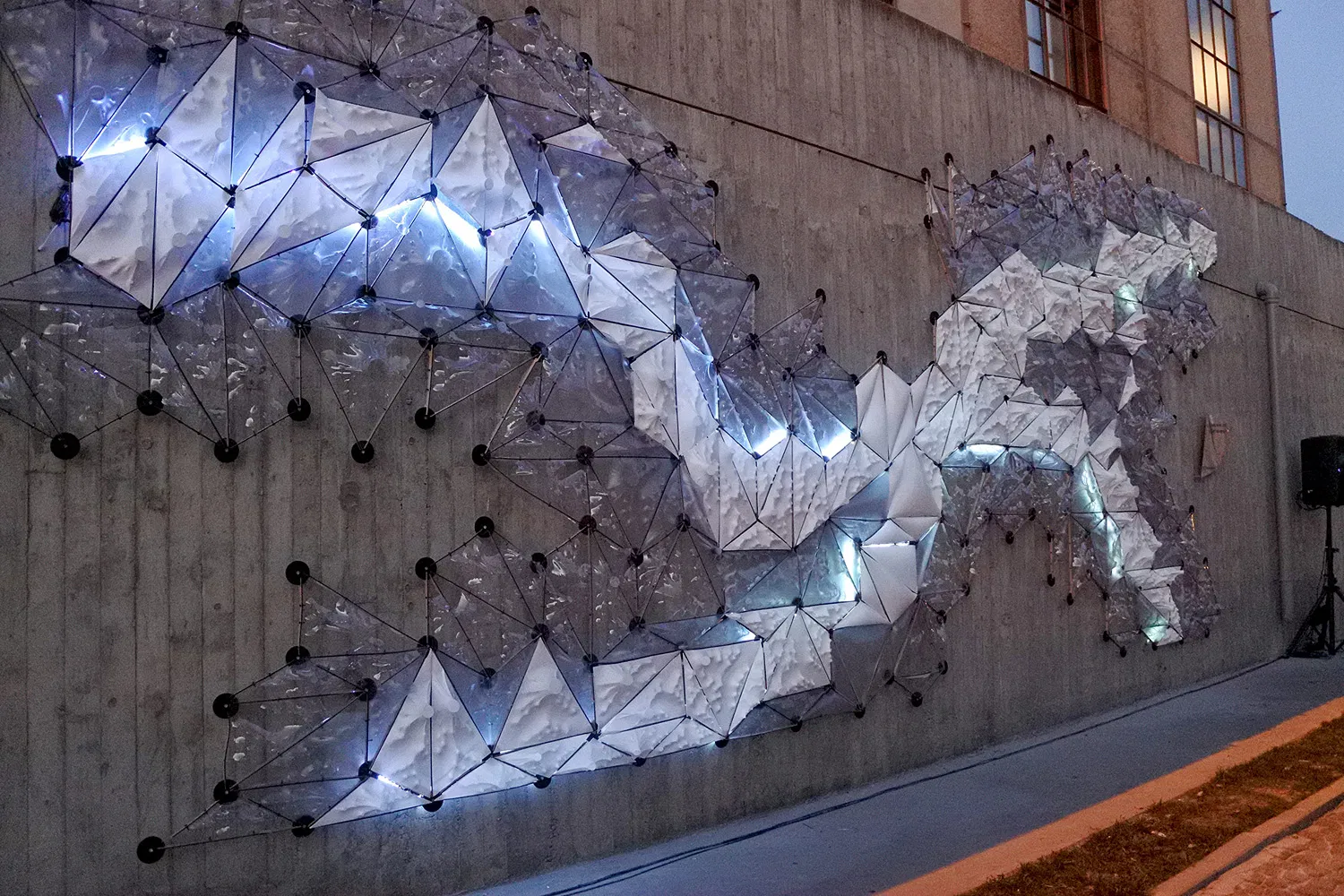 The final installation, with dimensions of 9 meters in length and 3 meters in height, integrates basic design parameters such as texture, light, shadows, colours, and light transmittance. While the installation acts a secondary skin during the day, at night it becomes imbued with varying patterns of light, exposing the varying levels of transparency and shadow among its individual elements.