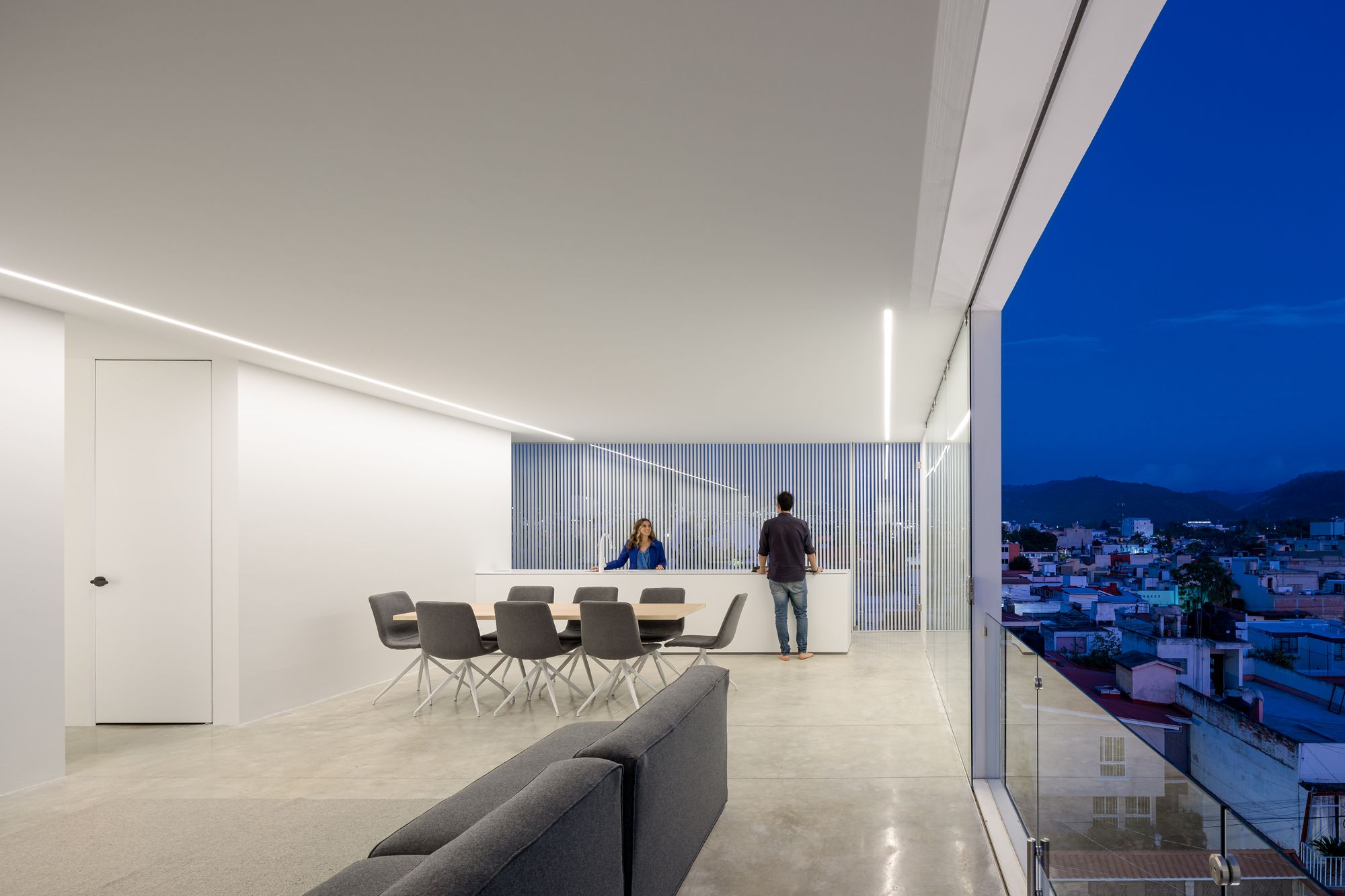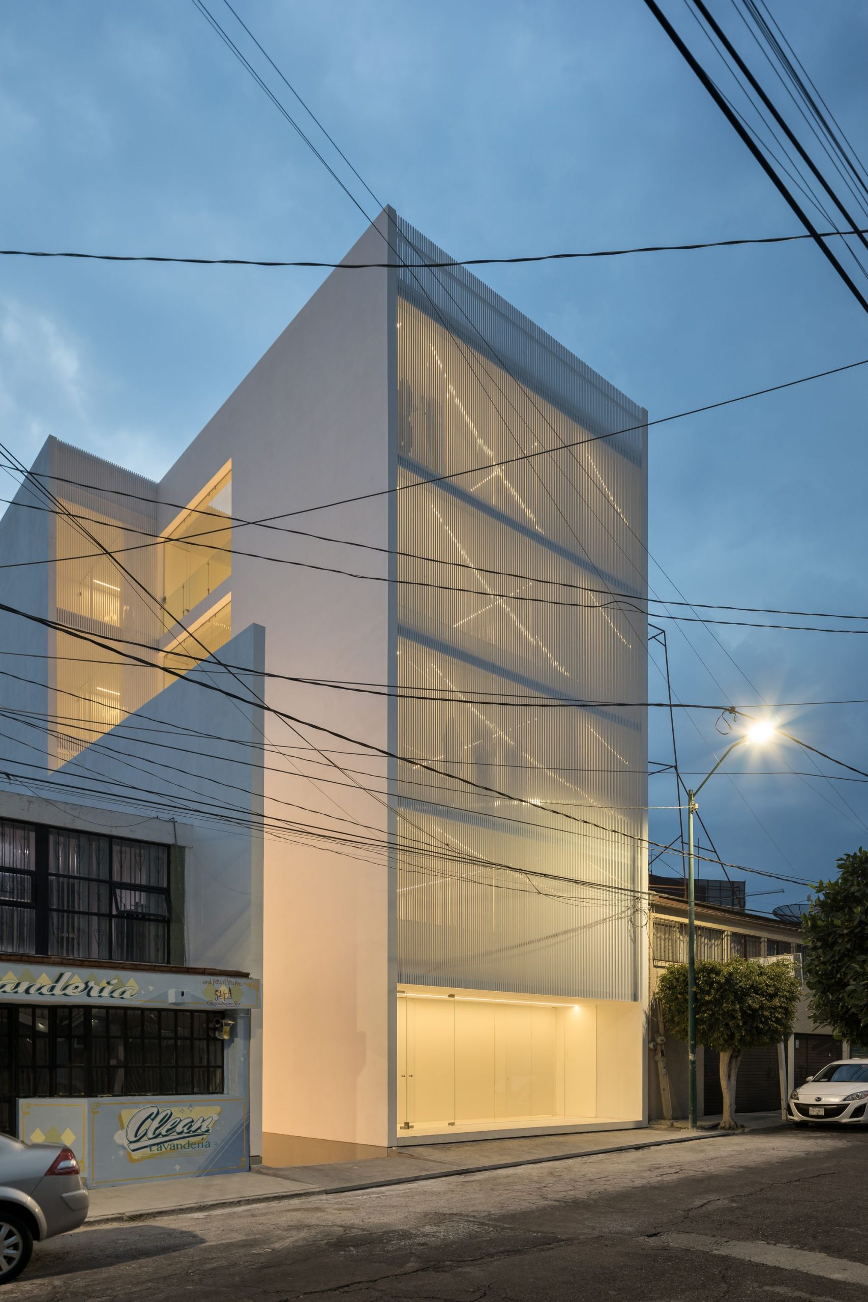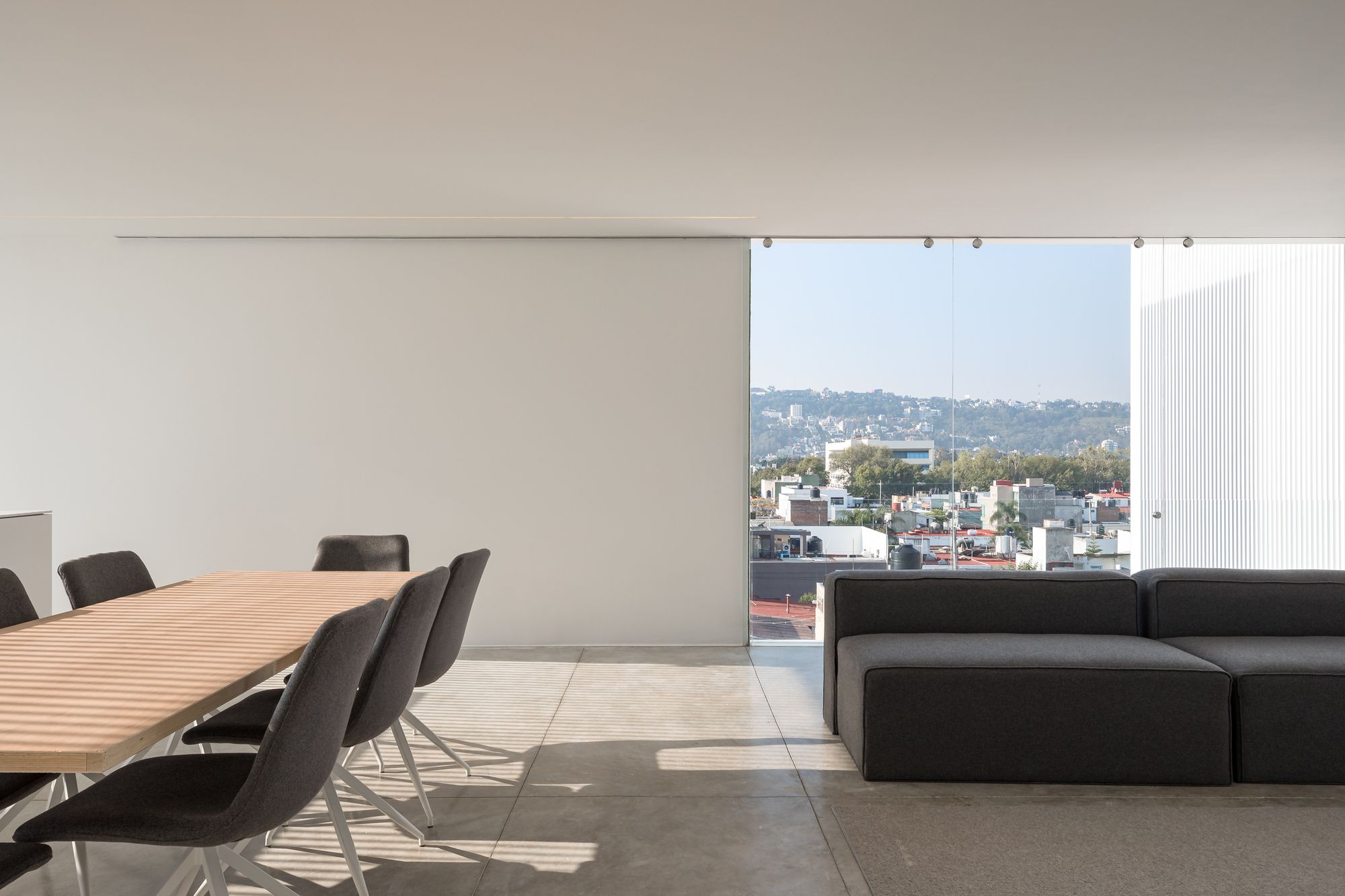 The orientation of the facade towards the east generated sunshine issues in the morning. For that reason, and because of the lack of nice views towards the street, we proposed an aluminum shutter that allowed a dimmed light through in the morning and diffused the views from the inside to the outside and back.
