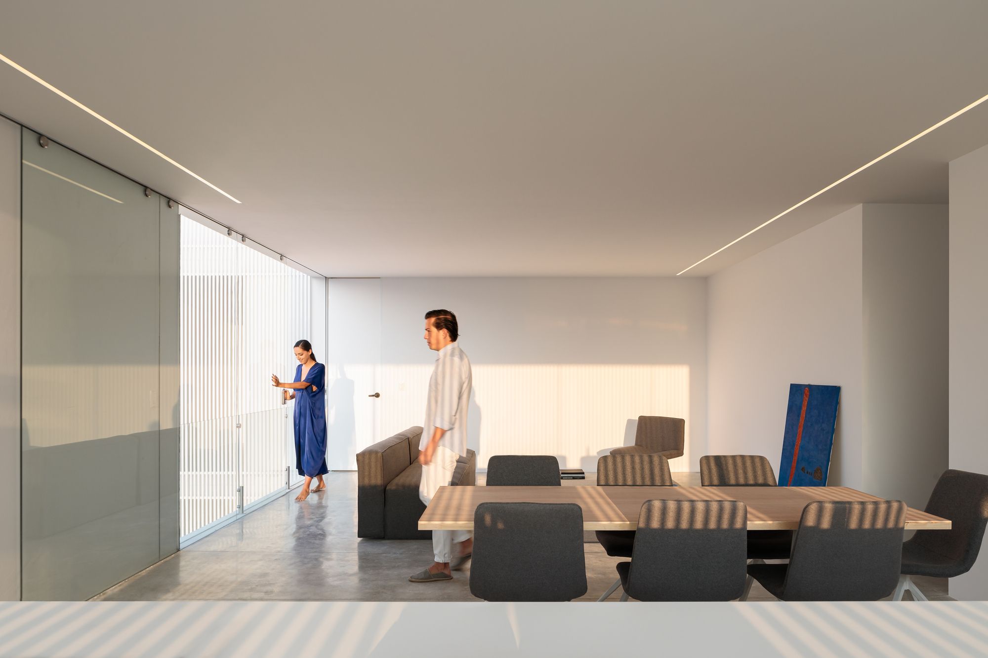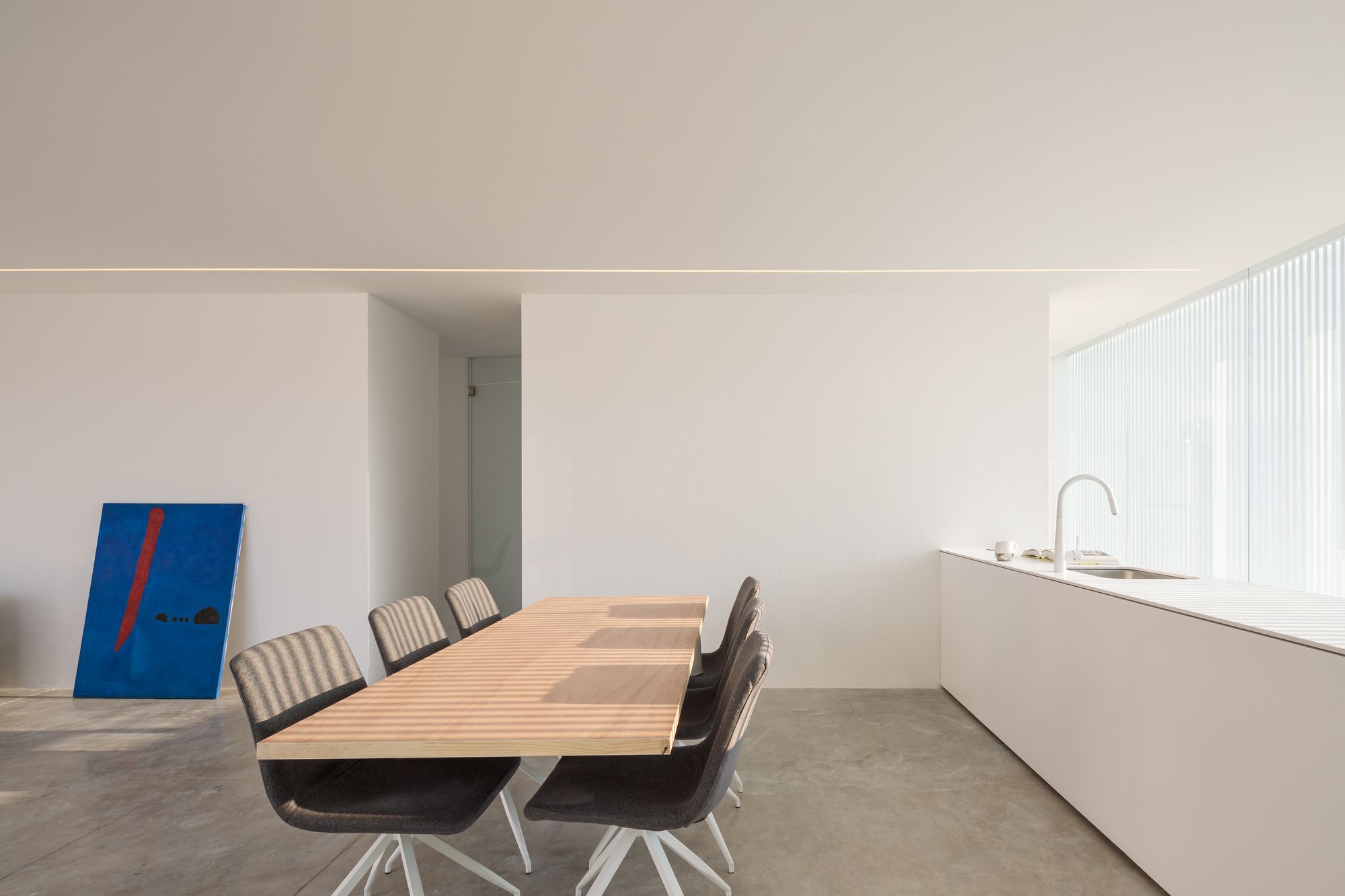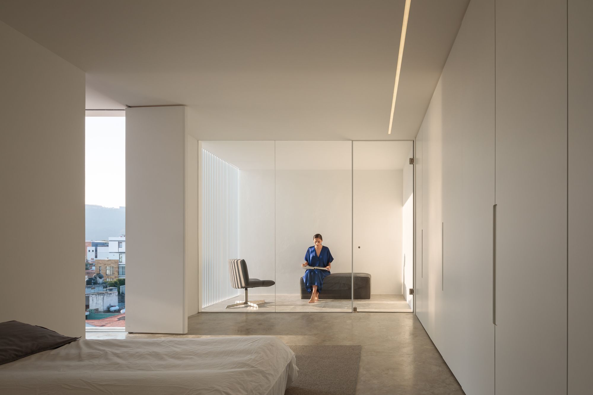 The orientation of the facade towards the east generated sunshine issues in the morning. For that reason, and because of the lack of nice views towards the street, we proposed an aluminum shutter that allowed a dimmed light through in the morning and diffused the views from the inside to the outside and back.
