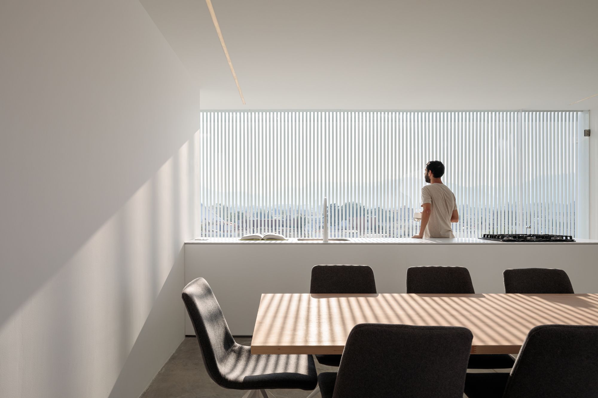 These windows open completely to allow the fresh air coming down from that very mountain, connecting the user to it in many different ways.