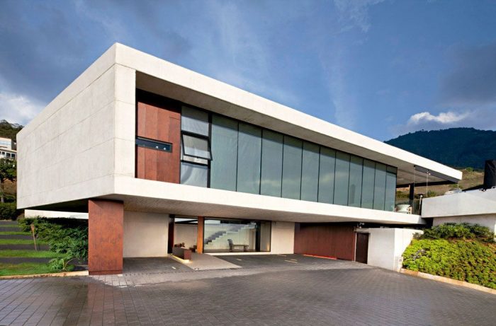 Air & Glass House designed by López Montoya Arquitectos, Located in the middle of a hillside, at 1900 meters above sea level on the eastern hills of Medellin, the House of Air & Glass sits delicately on a small promontory, which is accessed from a path that reaches the garage, where a one stretch ladder breaks a solid volume expanding it off the soil, to generate a fissure that allows light thru and a visual glimpse of the courtyard, accentuating the sensation of lightness.