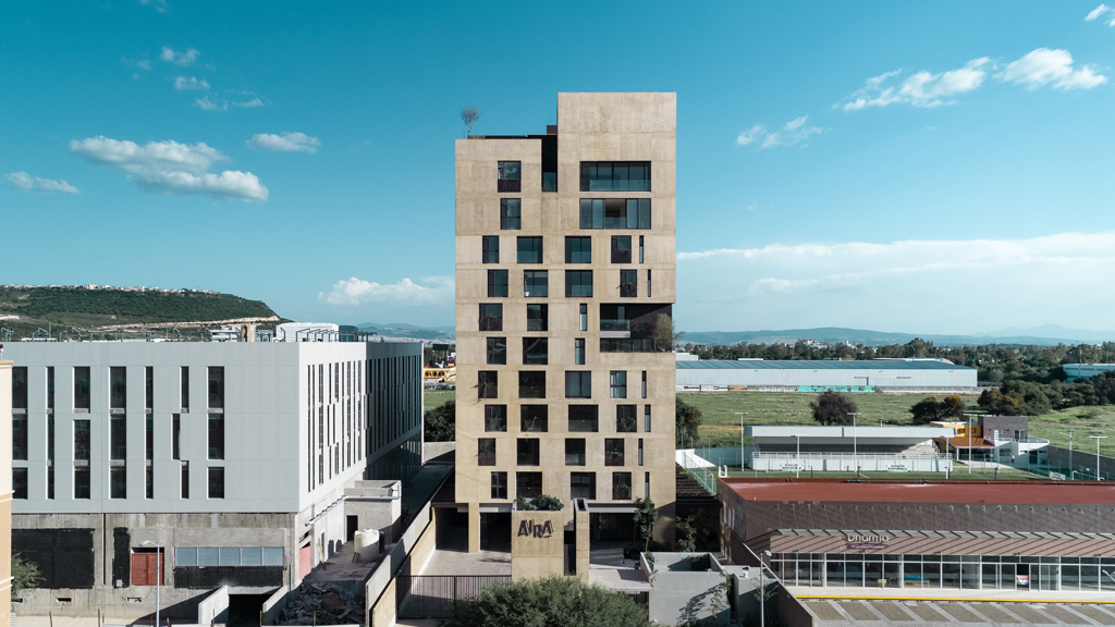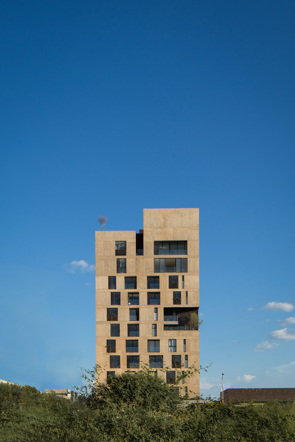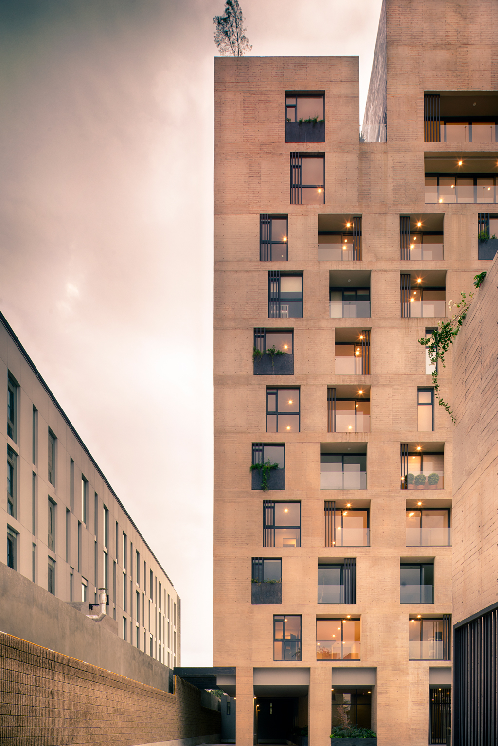 The pigmented concrete in sandy tones was the basis for shaping the composition of the building, while double-height compositions form the top of the tower. The rhythm and movement of the openings are inspired by the fact that each person and each family have unique needs and tastes, meaning that no level is the same, even if they are standard floor plans. The terraces or the separation between the abutments serve to dramatize the volumetry, and deep cracks appear that are announced on all four facades, inviting the air and light to tour the building.