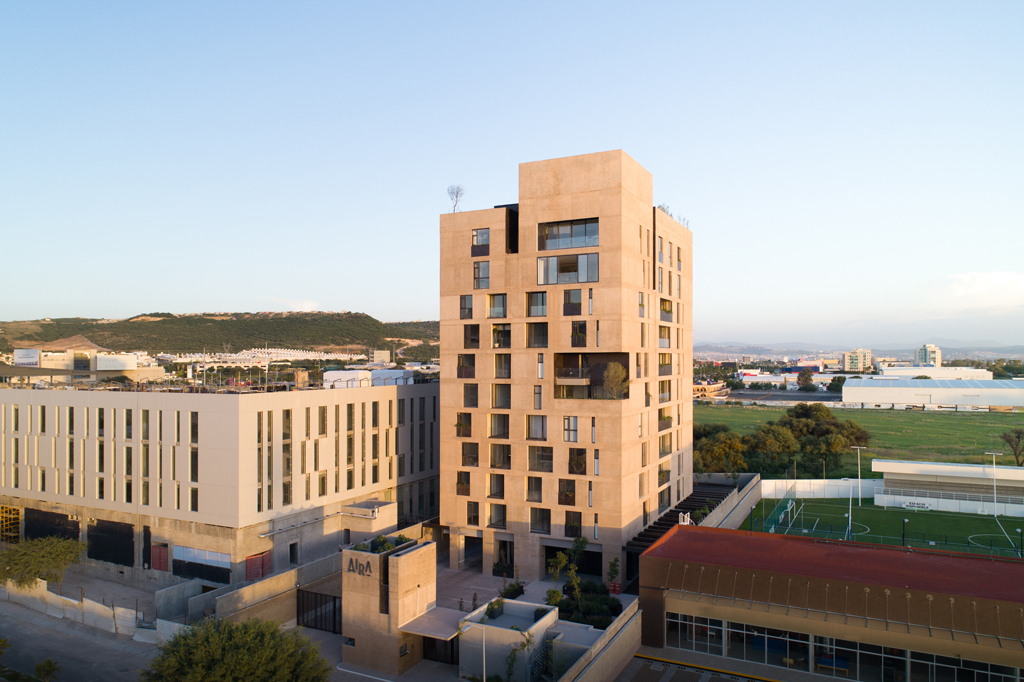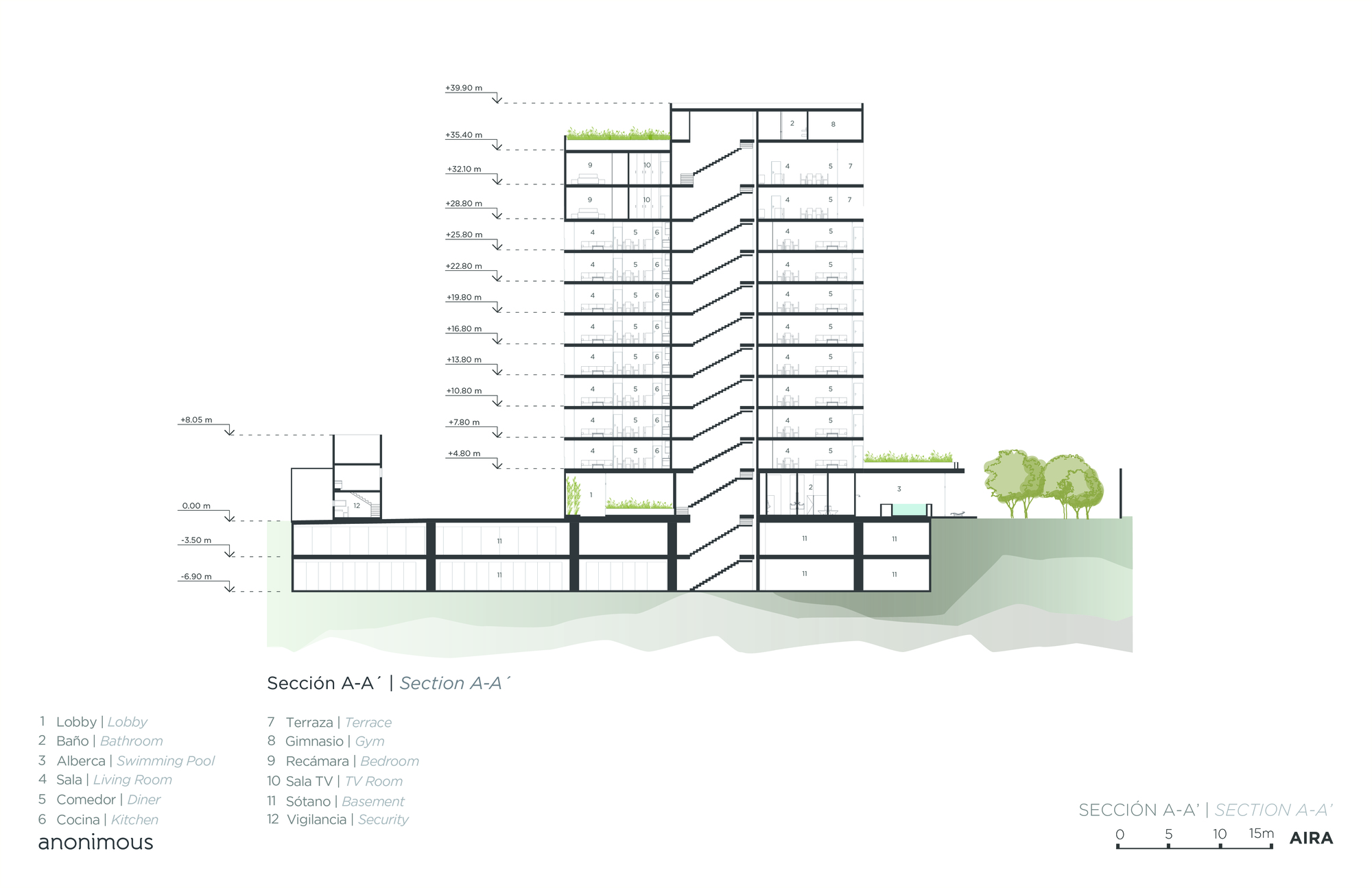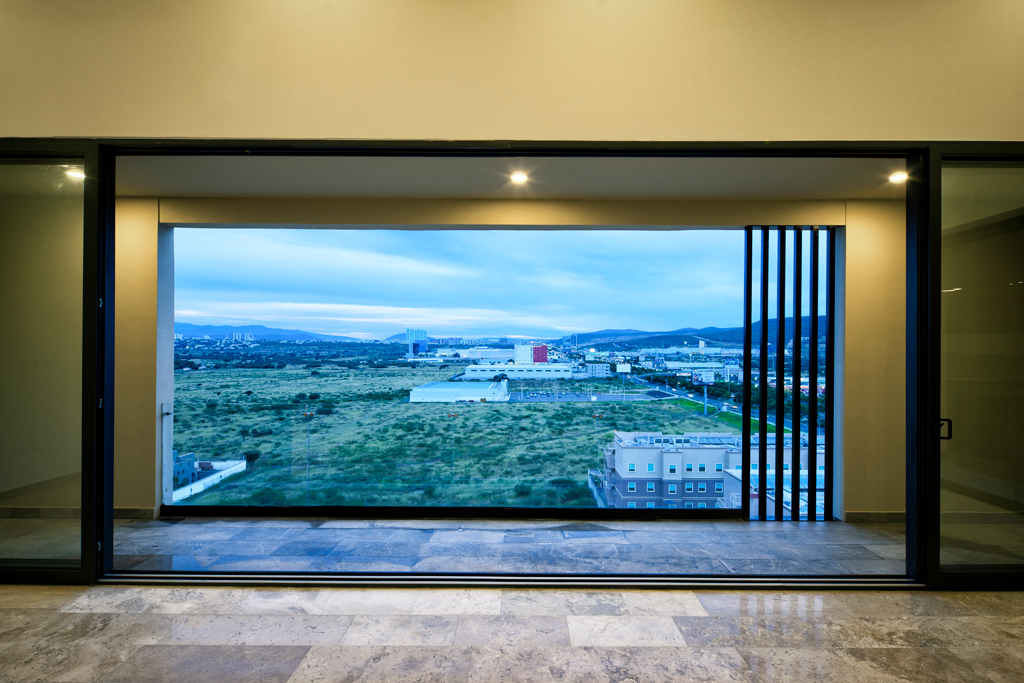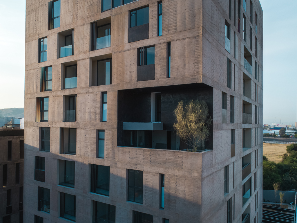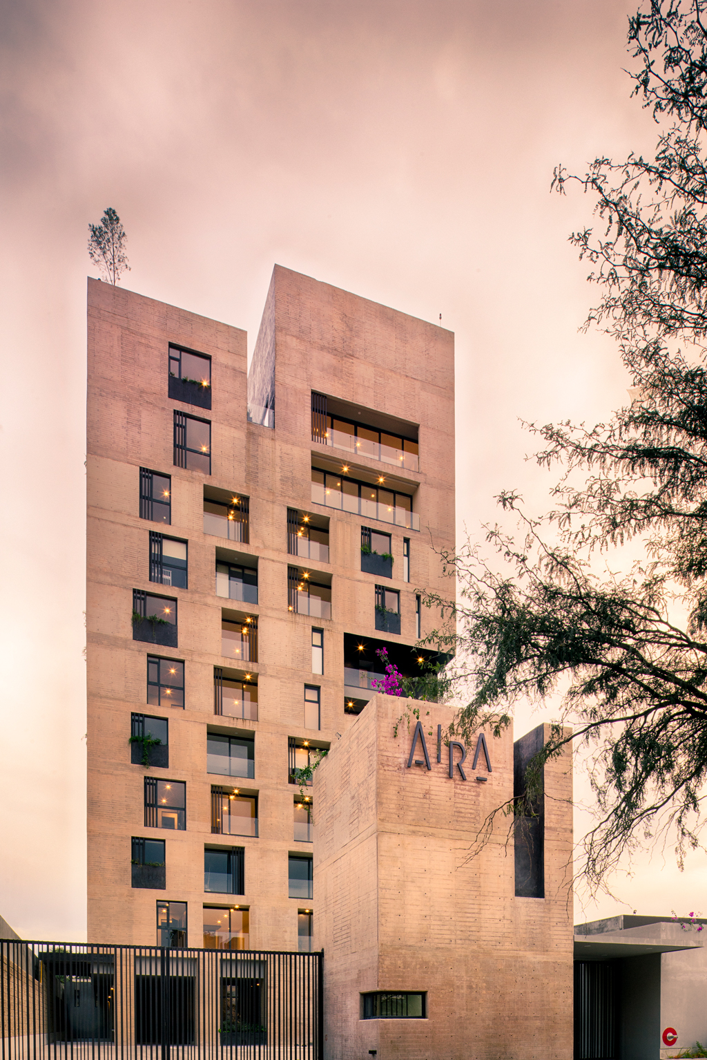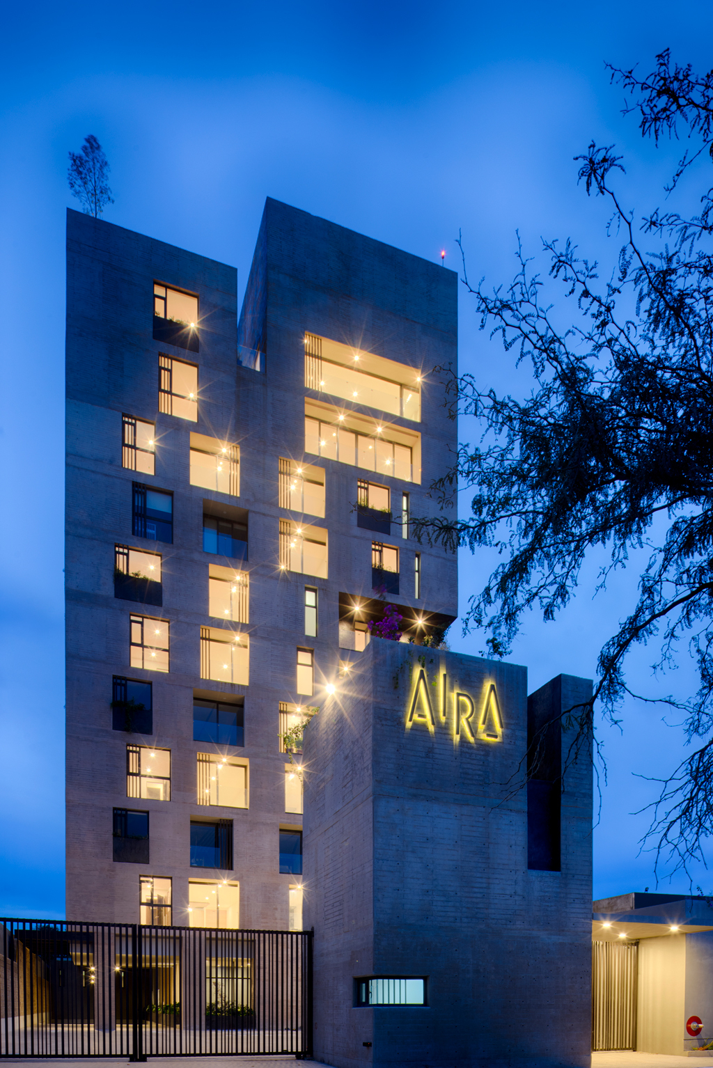 AIRA Located in one of the most extensively developed areas in the north of the city of Querétaro, and 100m from one of the principal avenues, AIRA is a tower of 35 apartments. The project is located on a narrow and deep site measuring 2,100 m2. Its compact volumetry reflects the intention to generate open space and to create green areas and offers a forceful vertical response to an area dominated by horizontal architecture.