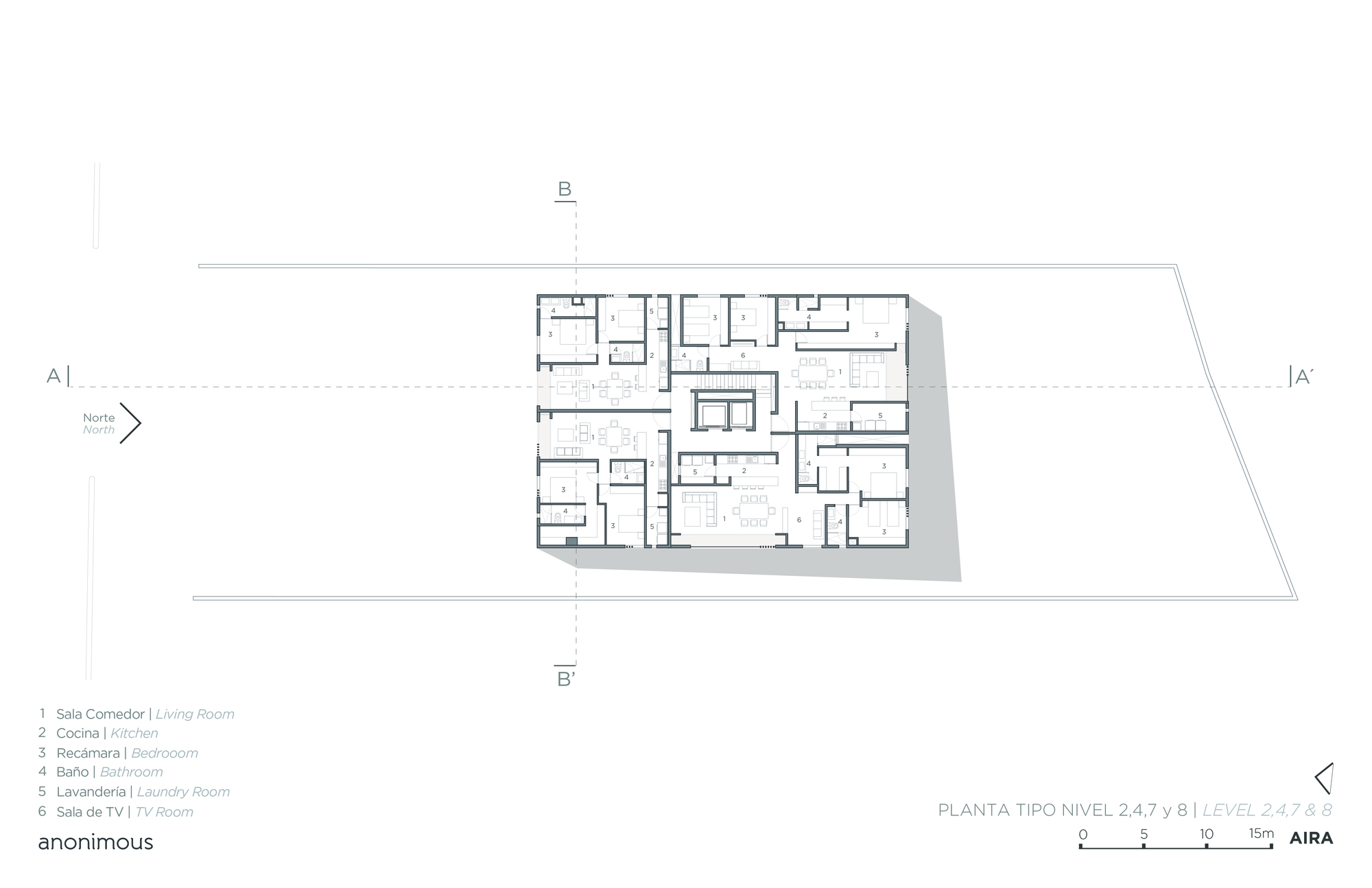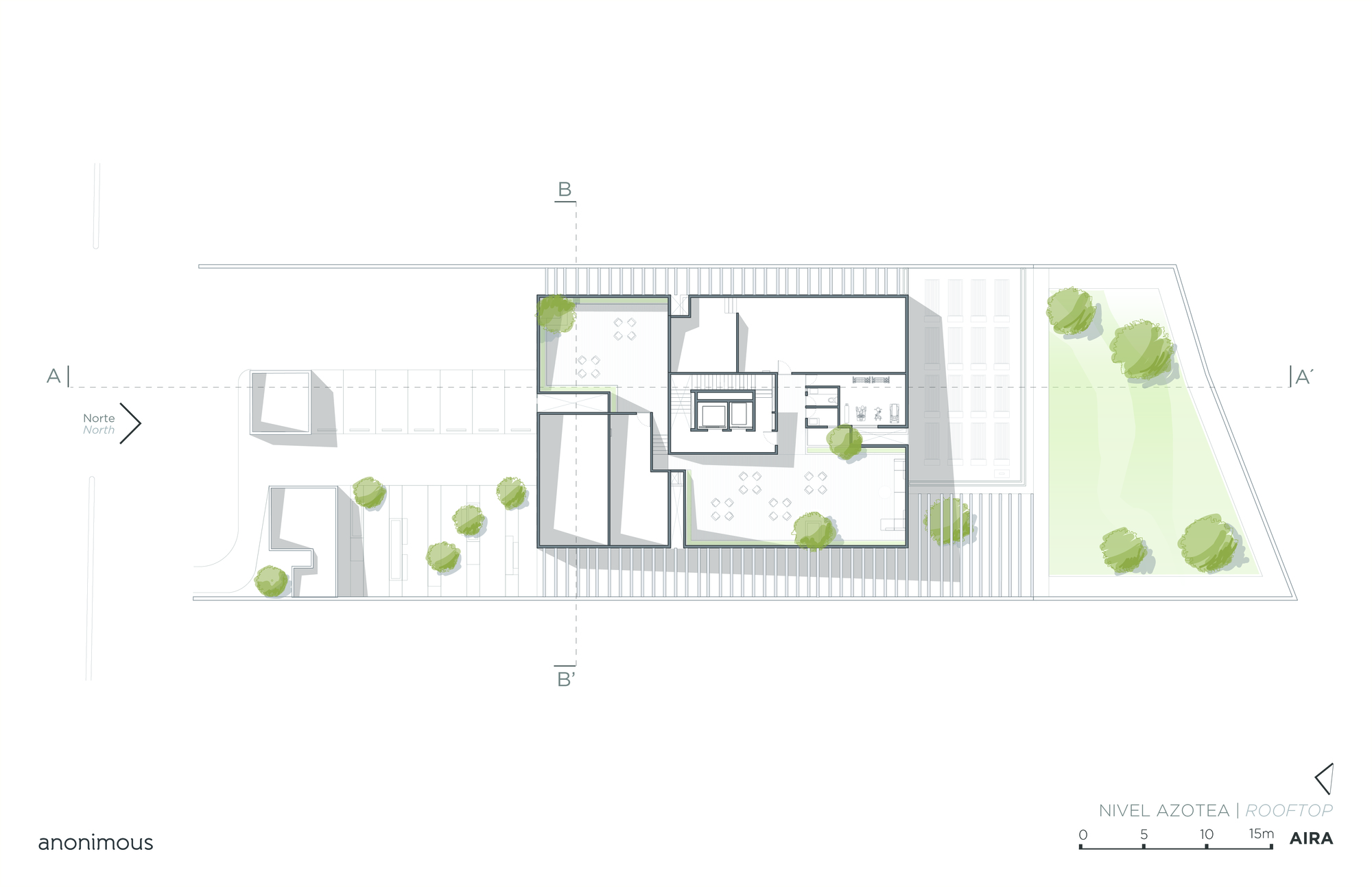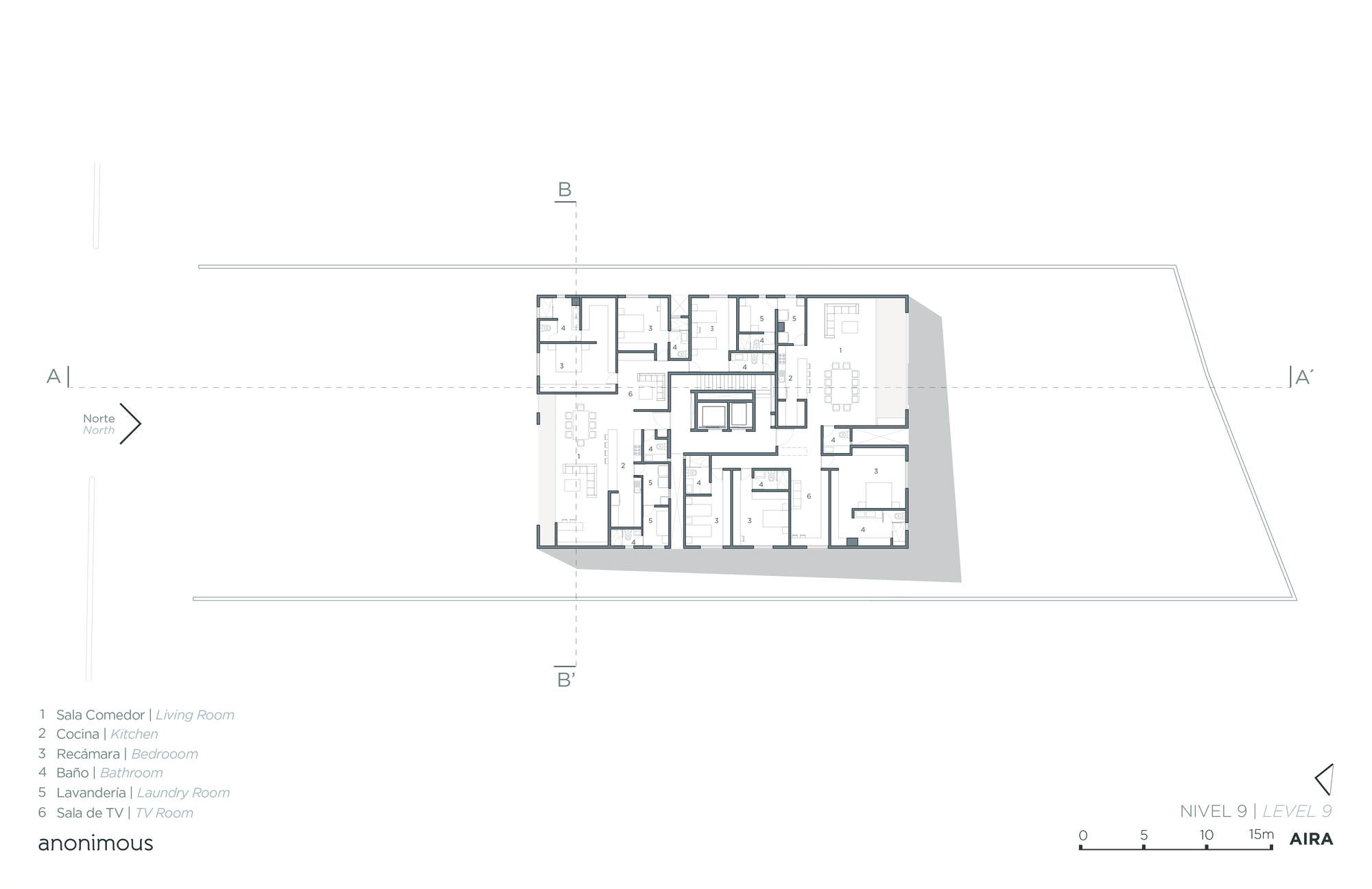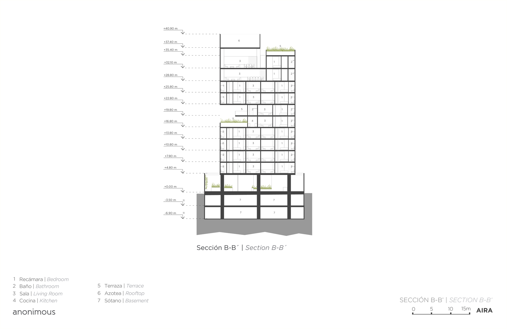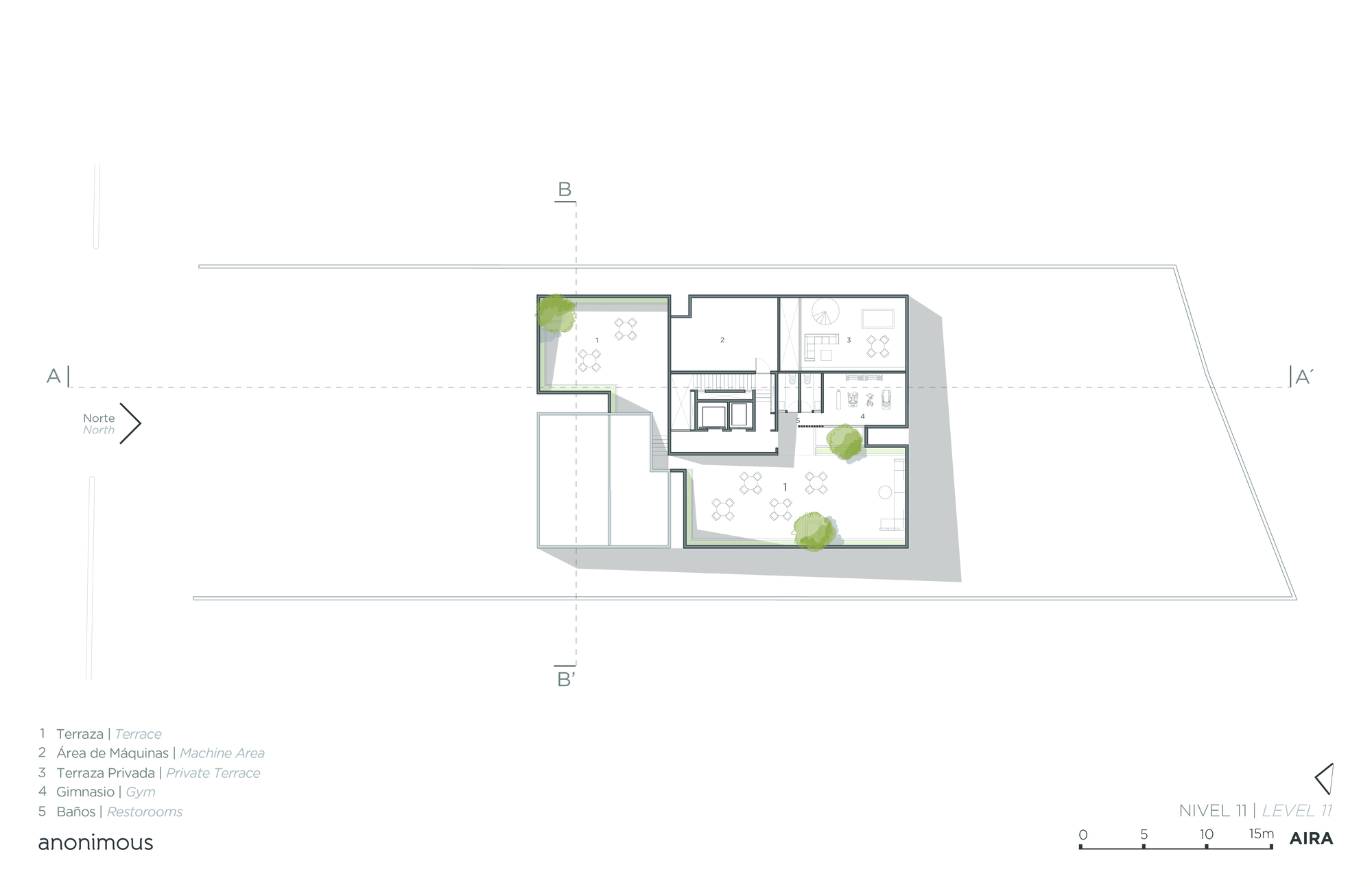 AIRA Located in one of the most extensively developed areas in the north of the city of Querétaro, and 100m from one of the principal avenues, AIRA is a tower of 35 apartments. The project is located on a narrow and deep site measuring 2,100 m2. Its compact volumetry reflects the intention to generate open space and to create green areas and offers a forceful vertical response to an area dominated by horizontal architecture.