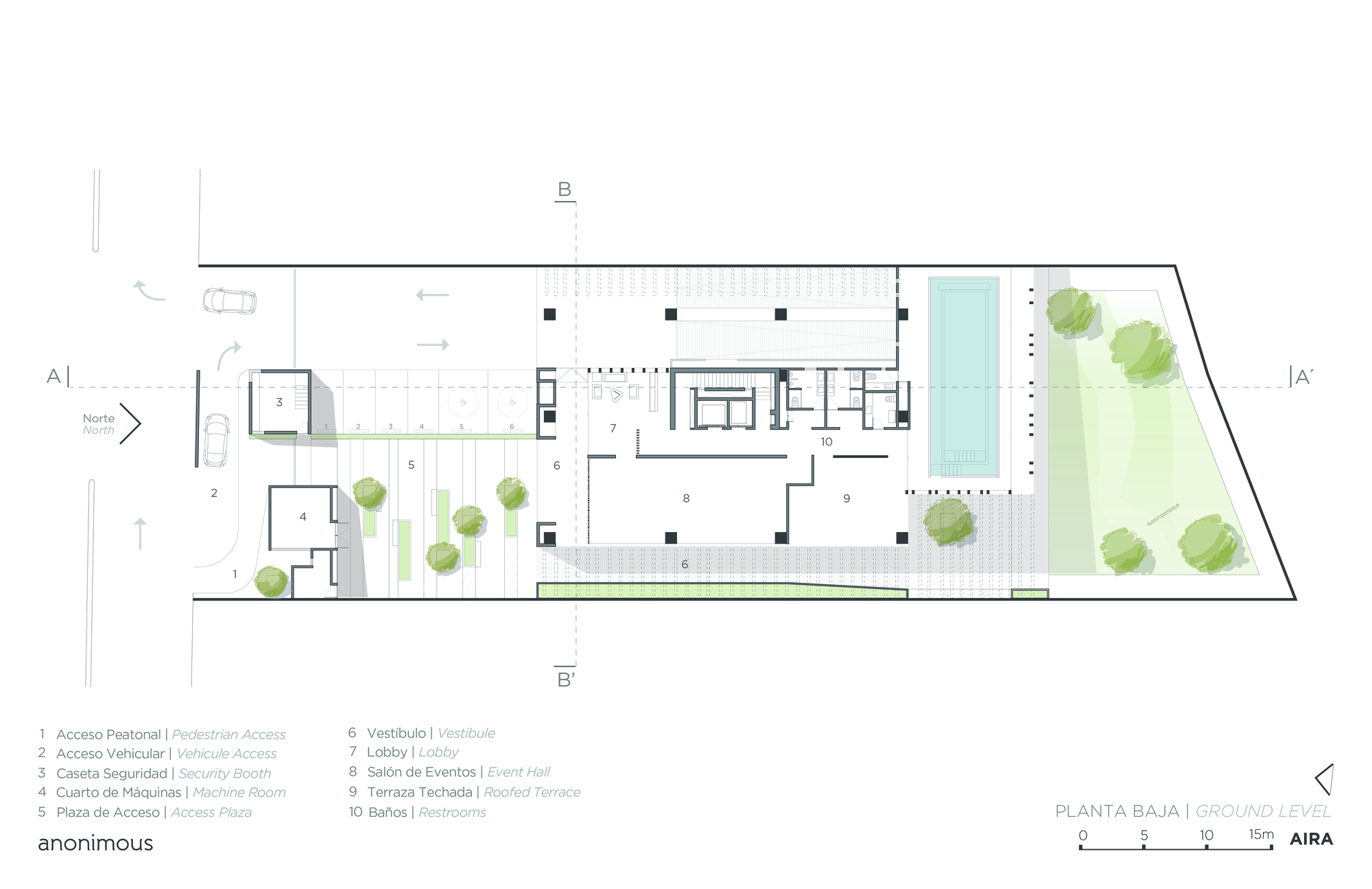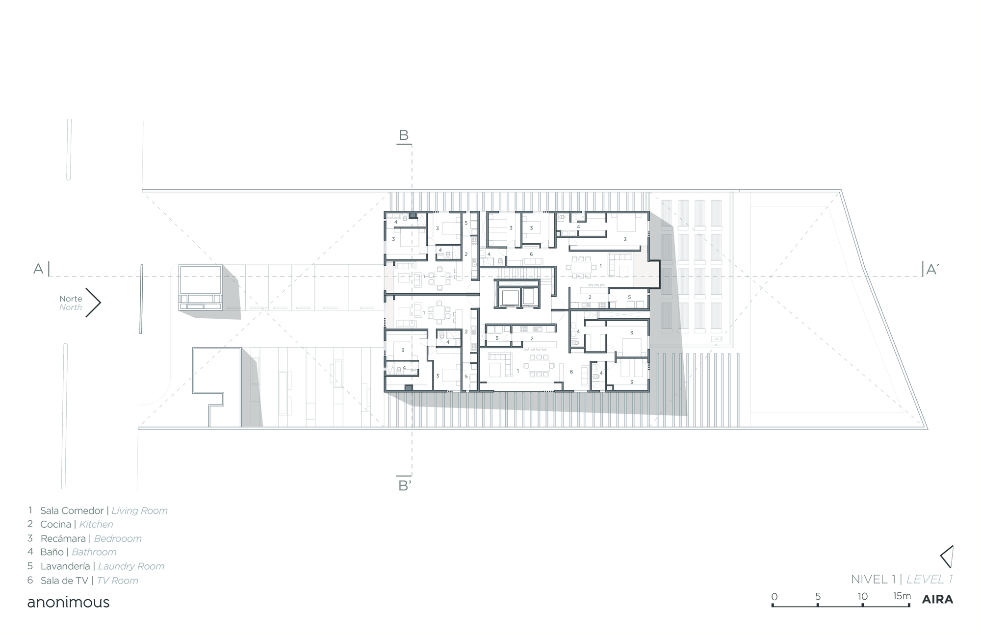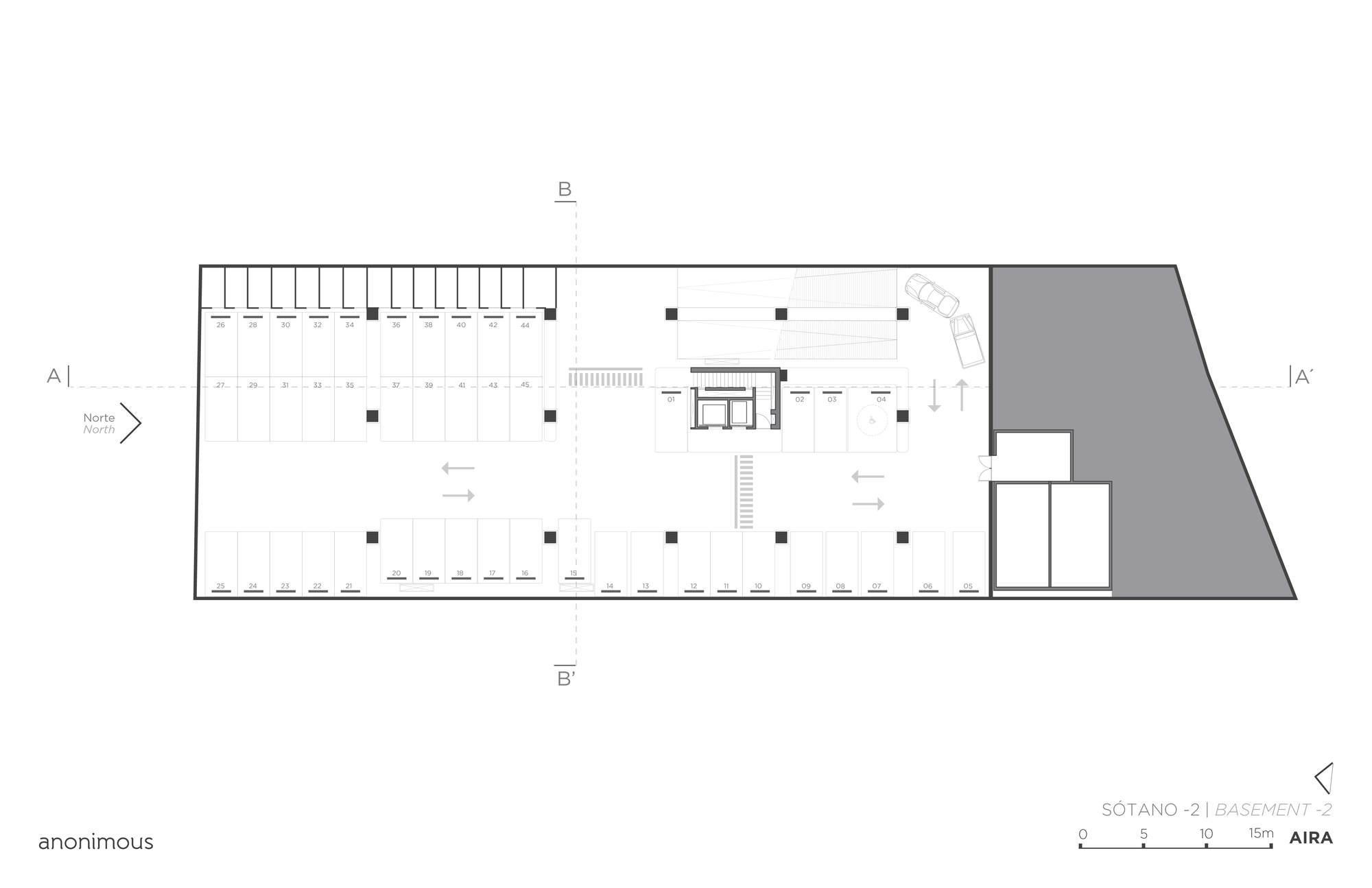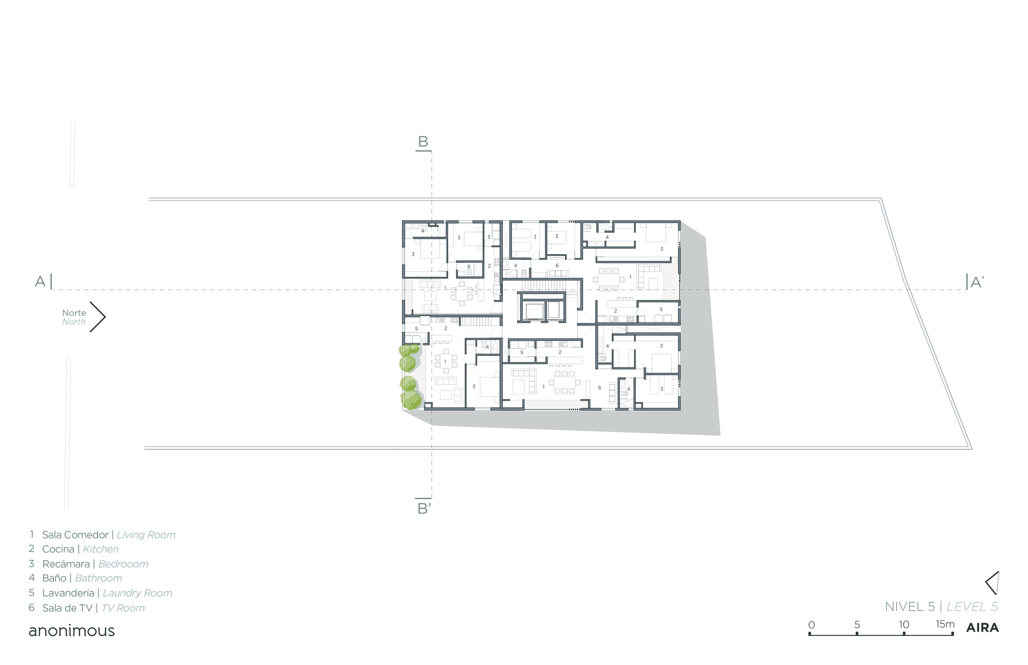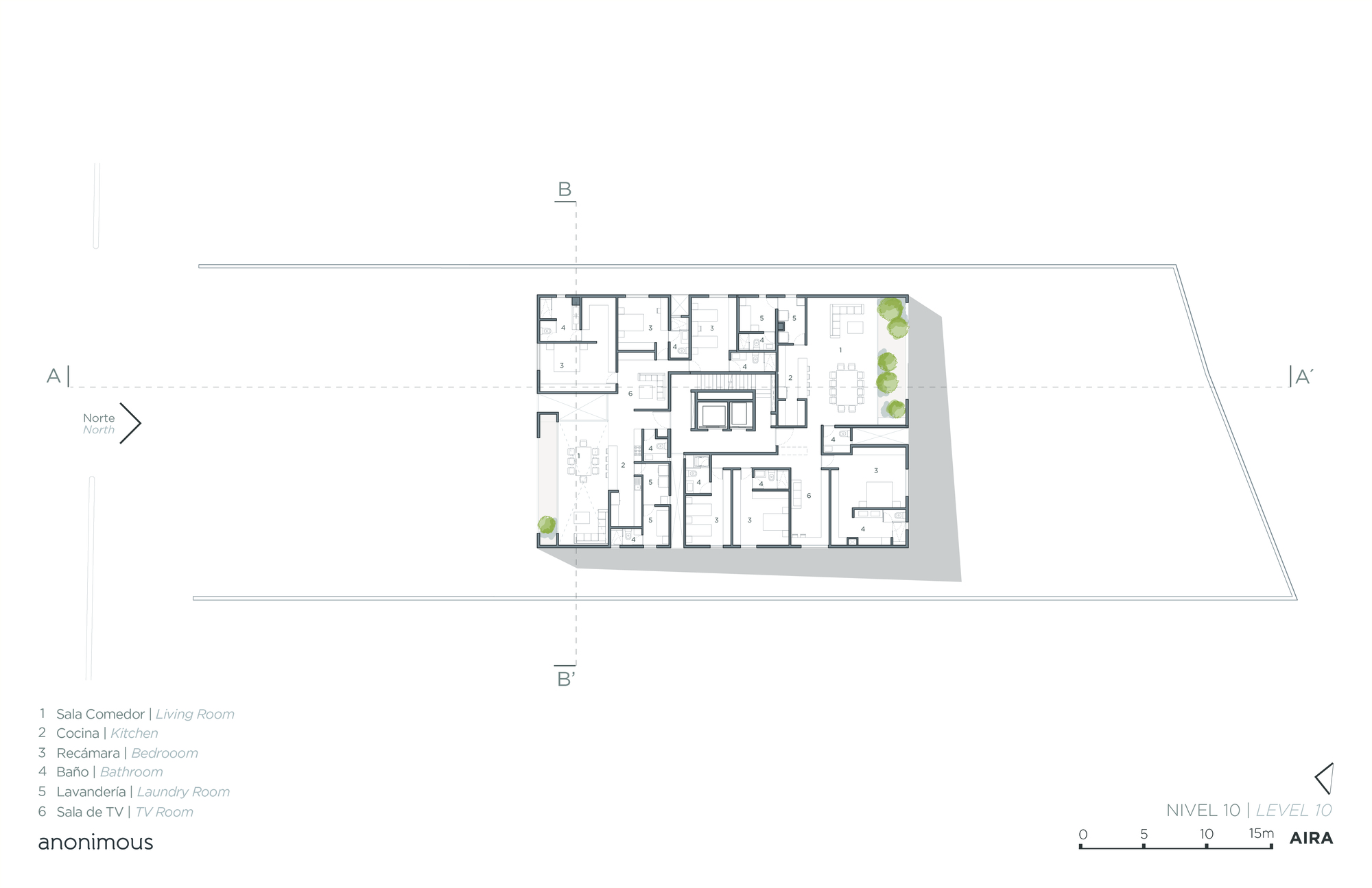 AIRA Located in one of the most extensively developed areas in the north of the city of Querétaro, and 100m from one of the principal avenues, AIRA is a tower of 35 apartments. The project is located on a narrow and deep site measuring 2,100 m2. Its compact volumetry reflects the intention to generate open space and to create green areas and offers a forceful vertical response to an area dominated by horizontal architecture.