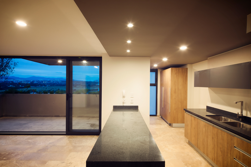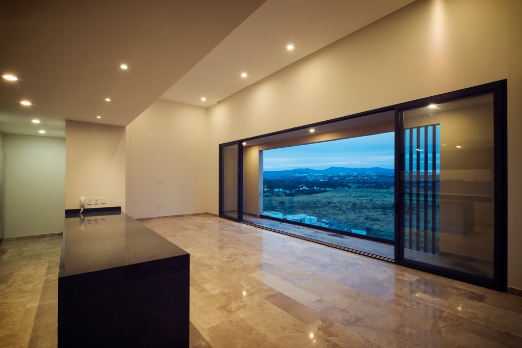 To one side, the event room extends to the pergola terrace, fostering time spent outdoors, and to the other, the roofed pool and terrace, which are complemented by the barbecue area and gardens. Rising from the abutment, the west façade seeks privileged views of a wooded residential area and the imposing Querétaro sunset. To the north are views of the distant mountain range that divides the states of Querétaro and Guanajuato.