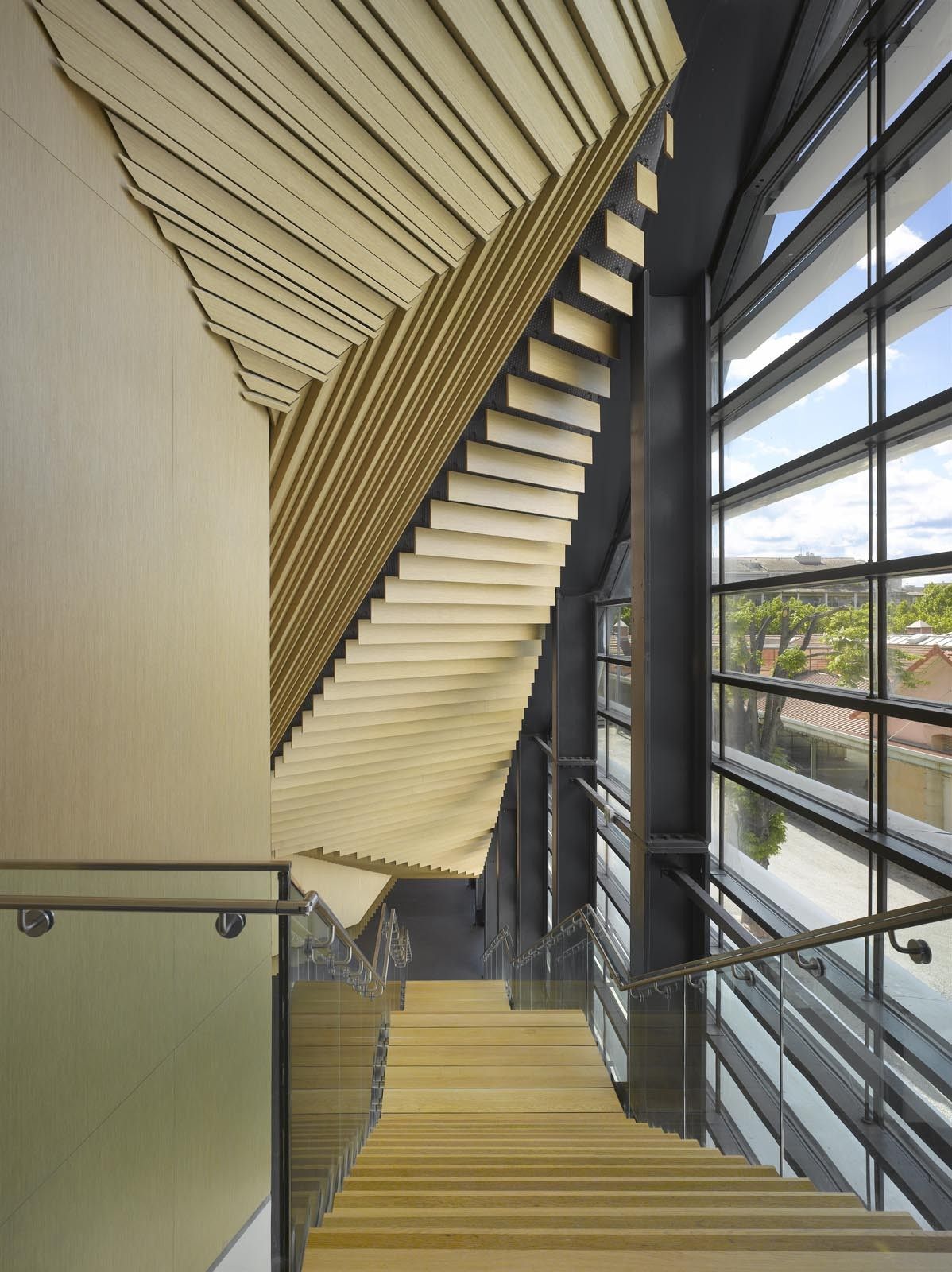 Many of the surfaces in the rooms of the institute are made out of timber, which are broken down to smaller surfaces of different sizes and shapes, places at different angles and depths. The most important element of this design is the black shadow. “The shape is not so important. This is very Japanese,” stated the architect. He designed the shadow. An inviting and friendly shadow that takes over the whole building. This to my eyes is pure genius. Kengo Kuma is extremely clever at designing structures and surfaces and he does this by just opening his eyes and observing what is around him. He uses his country’s tradition and practical work to drive his own personal work and the results are phenomenal. The Aix-en-Provence Conservatory of Music has the potential of even a monument-if it is not already one-that will be influential for years to come.