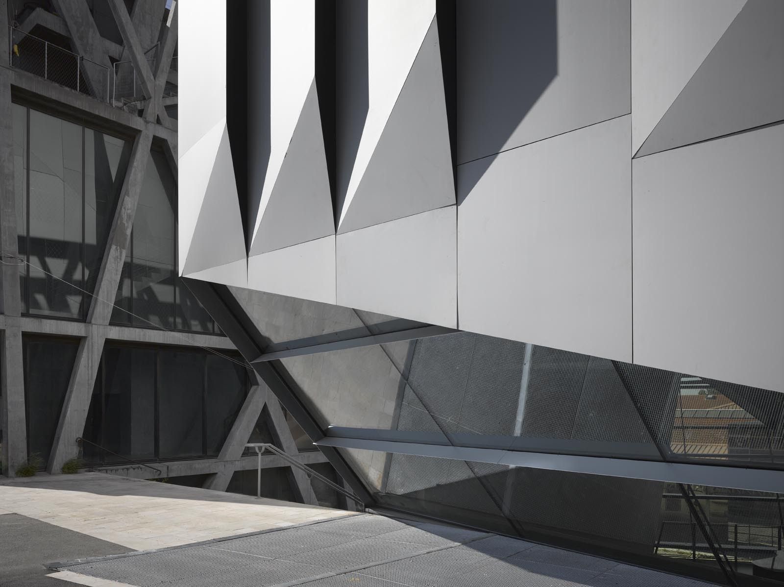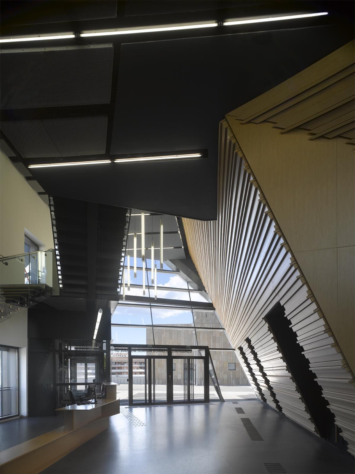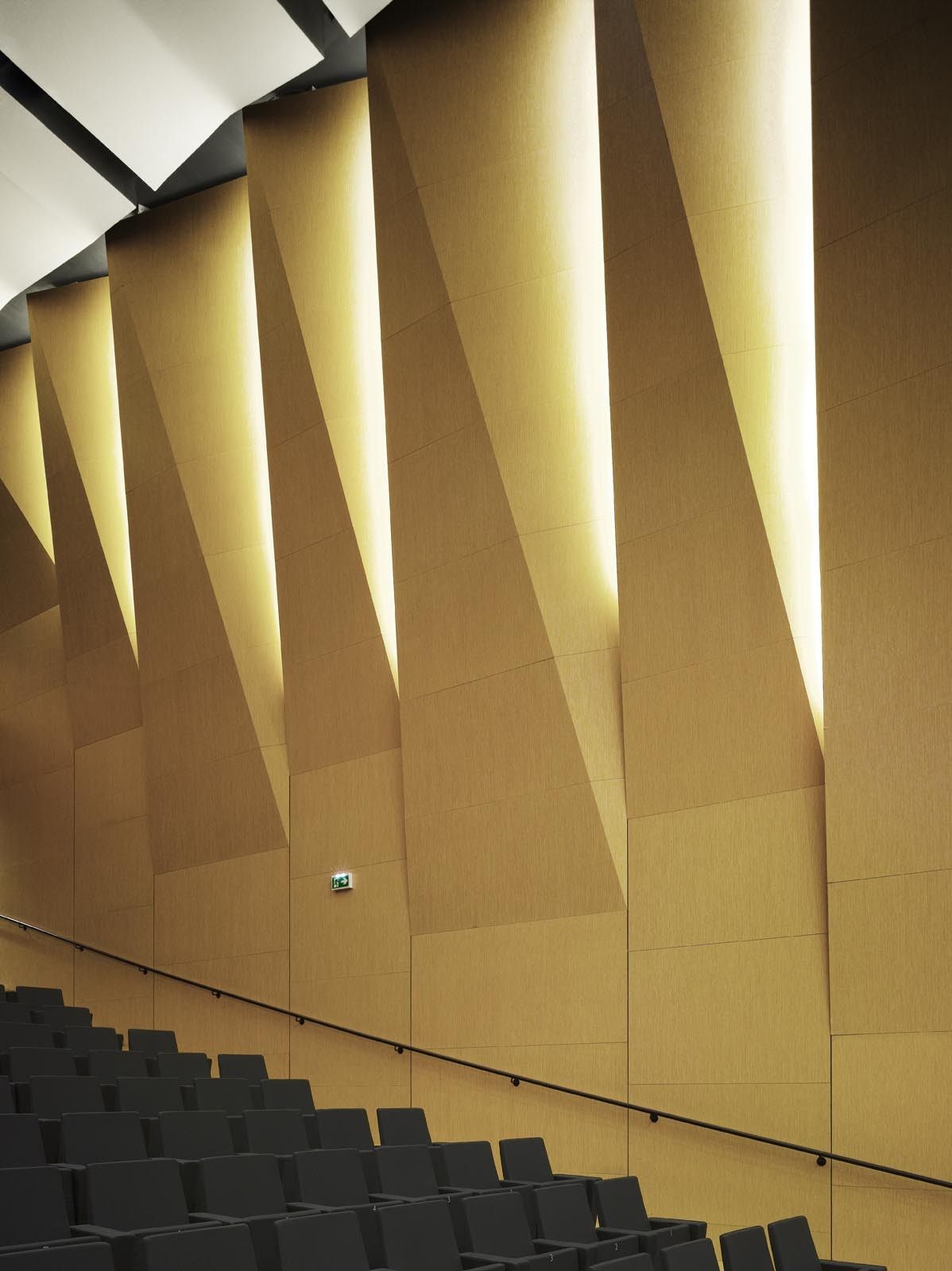 The exterior skin of the building is made out of folded aluminium which imitates these inspiring rhythms and lines of the surrounding environment. A visual play of light and shadow is created through the visualisation of a constant rhythm throughout the day. Origami paper folding has been used as a reference in folding the flexible aluminium in creating beautiful geometric forms. This is an example and an architectural lesson that building materials are not always tangible. In this case, light and shadow are the main building materials of this unusually attractive facade. Triangular forms wrap the building while going on the interior to replicate a similar effect. This form takes shapes from walls and ceilings to furniture and light fittings. The shade of grey colour is also replicated from the exterior to the interior spaces of the 62 teaching spaces. The rest of the interior spaces, such as the entrance hall, public staircase, auditorium hall and rehearsal rooms follow the same geometric forms but they are coloured in a light yellow colour, perhaps replicating the colour of light.