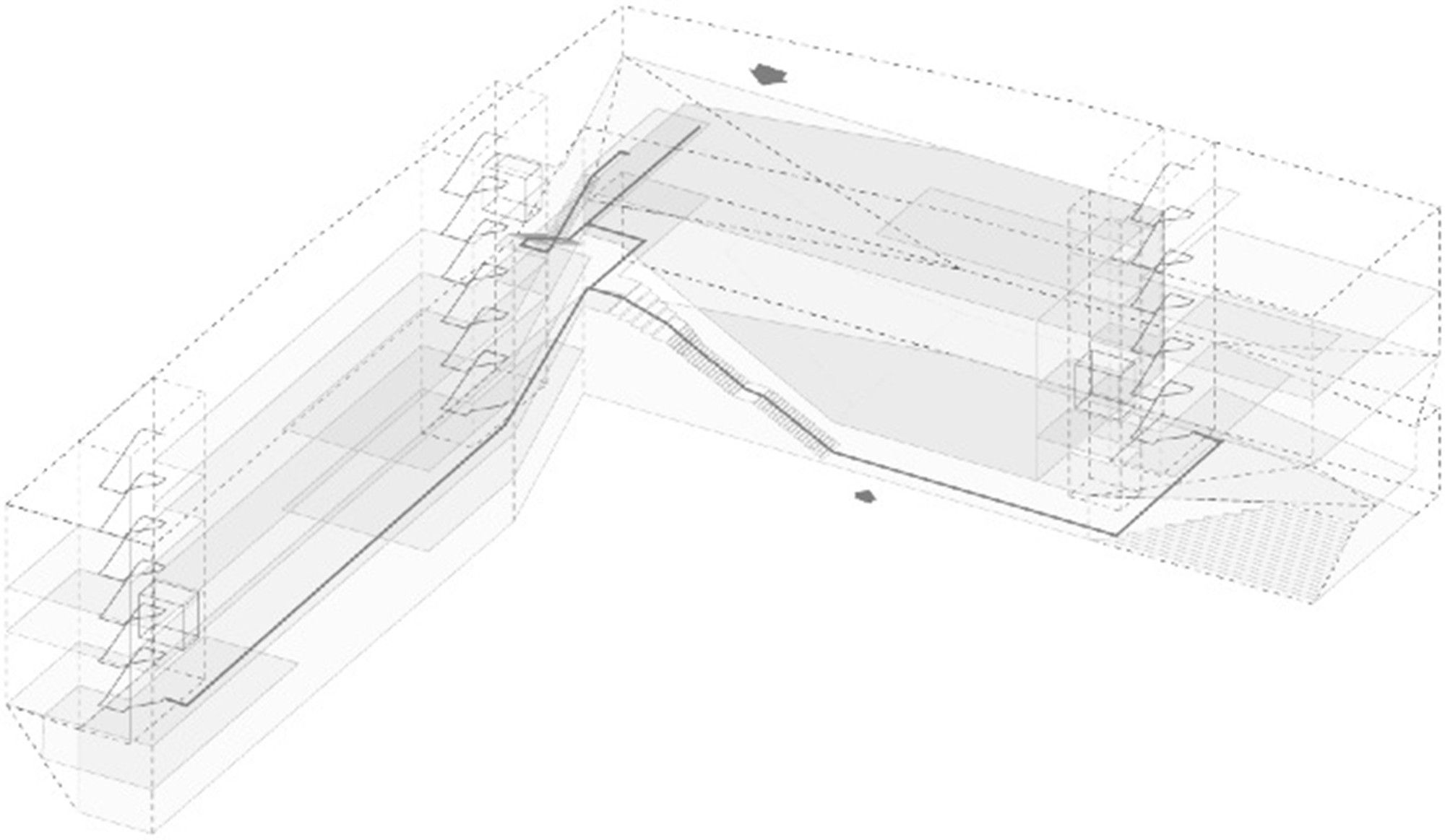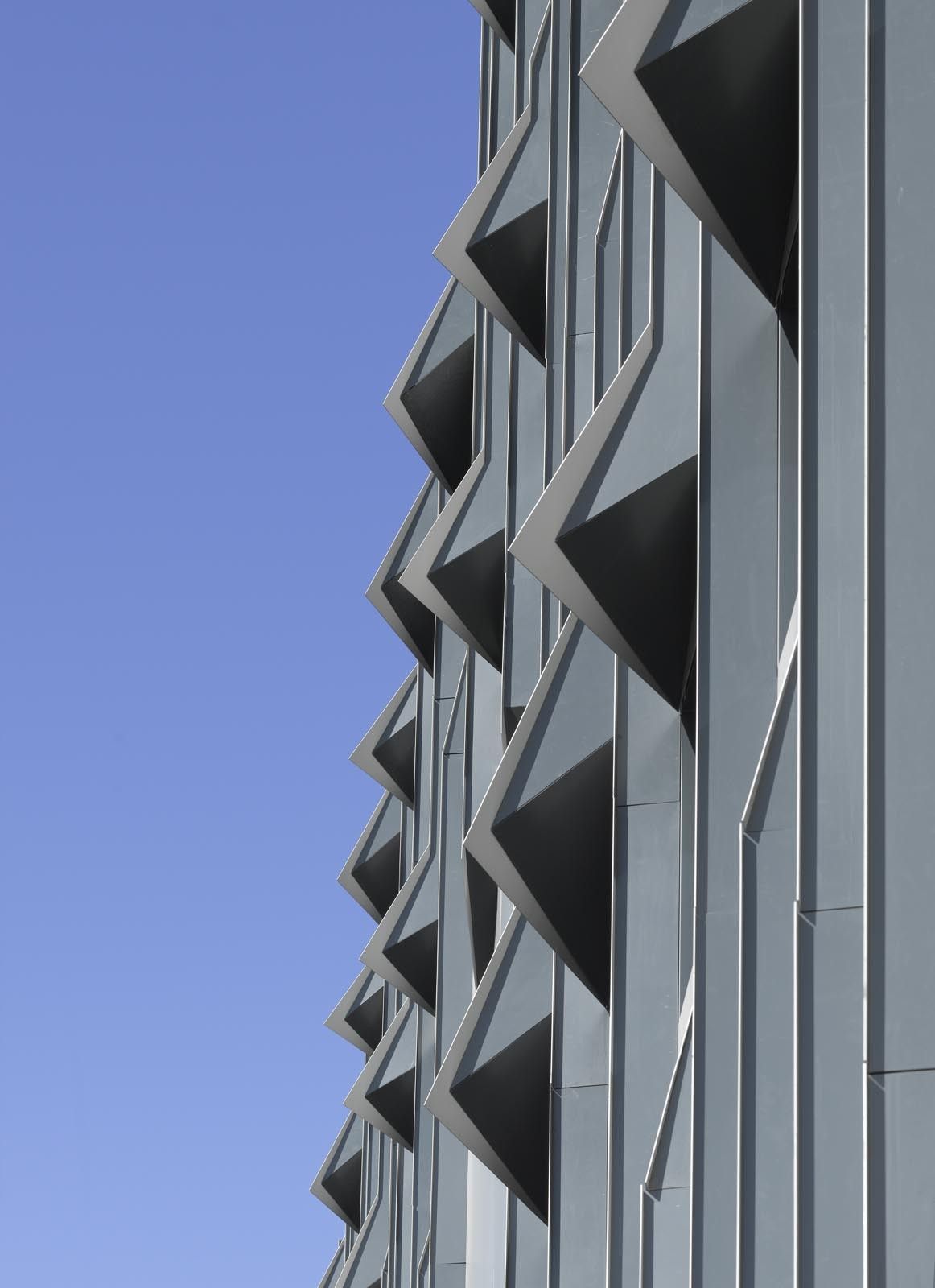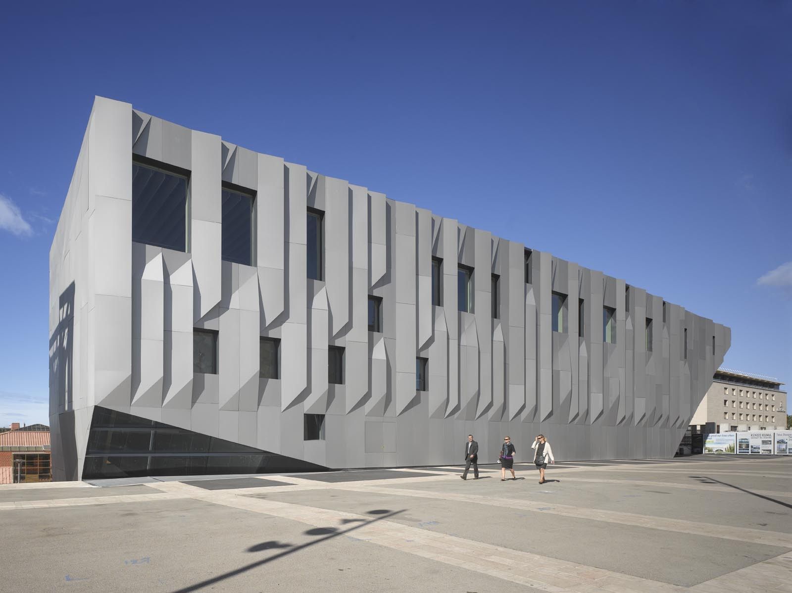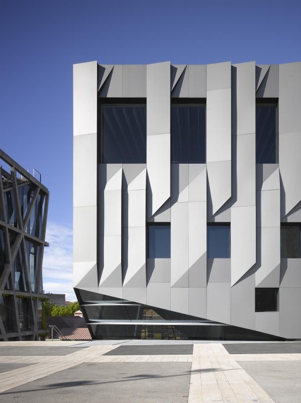 The exterior skin of the building is made out of folded aluminium which imitates these inspiring rhythms and lines of the surrounding environment. A visual play of light and shadow is created through the visualisation of a constant rhythm throughout the day. Origami paper folding has been used as a reference in folding the flexible aluminium in creating beautiful geometric forms. This is an example and an architectural lesson that building materials are not always tangible. In this case, light and shadow are the main building materials of this unusually attractive facade. Triangular forms wrap the building while going on the interior to replicate a similar effect. This form takes shapes from walls and ceilings to furniture and light fittings. The shade of grey colour is also replicated from the exterior to the interior spaces of the 62 teaching spaces. The rest of the interior spaces, such as the entrance hall, public staircase, auditorium hall and rehearsal rooms follow the same geometric forms but they are coloured in a light yellow colour, perhaps replicating the colour of light.