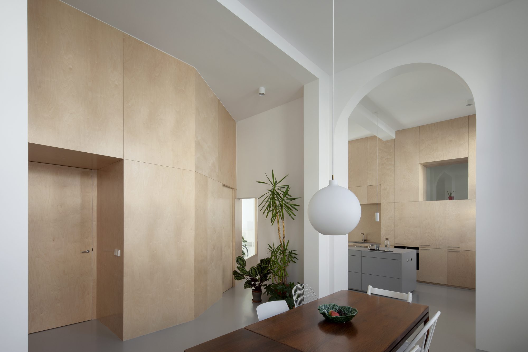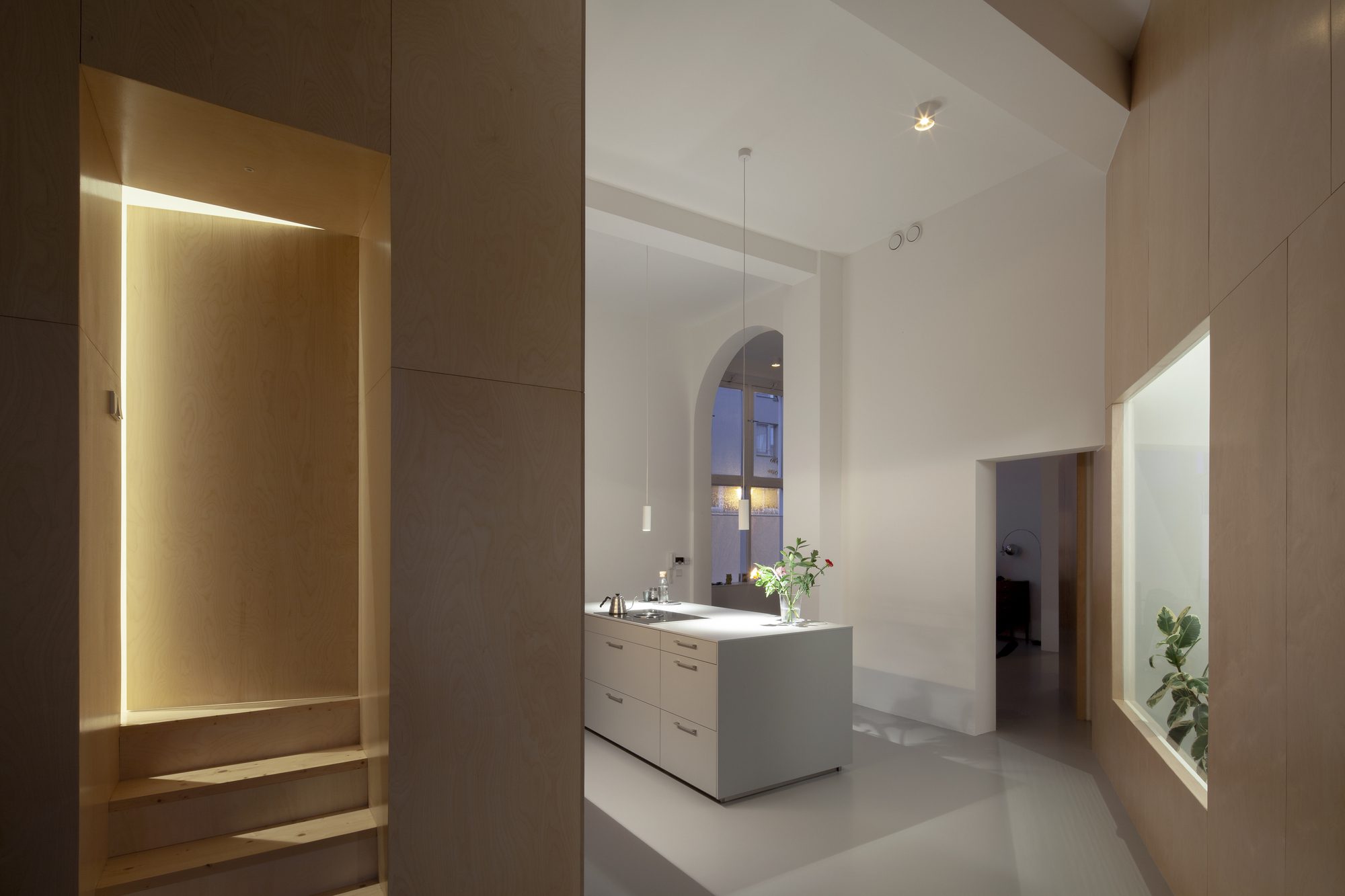 The newly added volumes which intersect the white walls were cladded with birch plywood. In this way the various interactions between the old and the new elements are made more extreme. This material also made interesting sculptural forms possible, such as the porch with stairs leading to the master bedroom, and the niche at the entrance, which works as a buffer between the entrance and the dining room.