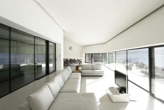 Although the volume is of an modernist aesthetic, it manages to immerse itself into the landscape. The south side is remarkable from the road and it looks like it’s floating above the valley; the northwest side is almost completely buried in the ground. The three volumes of the house are of different heights, which gives the opportunity for organizing open space interiors. The house plan is ”C” shaped, with the three sides containing a large terrace, that is continued on the north side by the hill’s slope. Every room has wide windows, which create the connection between the landscape and the living areas inside the house even stronger