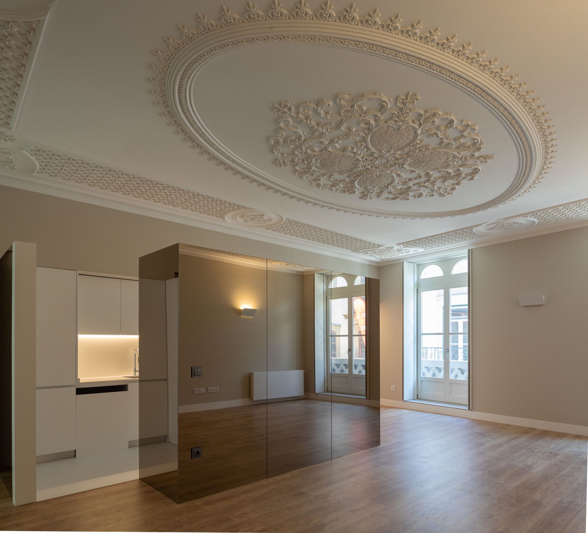 We use materials and construction techniques compatible and coherent with the historical moment and character of the buildings, with the entire construction system of the existing building being made of wood and the ceilings and skylights made of decorative plaster.