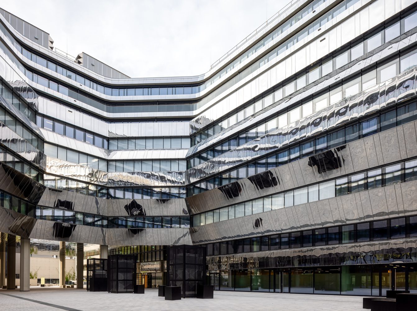 Study and analysis of the existing building — The new design was preceded by an extensive reading and understanding of the existing building from the 1970s. Using historical plans and documents, DMAA and JWA analyzed and internalized the initial ideas of the original architect, Karl Schwanzer to make a fundamental decision between demolition and conversion. With the help of BIM (Building Information Modeling), a digital twin of the existing building was created, which enabled comprehensive studies of the concrete cubature and the consequences of possible adaptations. The potential of the existing building with its economically optimized reinforced concrete structure, which was exceptional for the 1970s, was thoroughly examined in terms of statics, noise, and fire protection, as well as suitability in terms of building physics. Characteristics of the existing building in its function as the headquarters of Bank Austria were the mirrored façade and a striking, expansive, but almost unused staircase. The mirrored façade emphasized the hermetic nature of the building, while the monumental gesture of the external staircase dominated the area of Julius-Tandler-Platz. The remodeling allowed these outdated stylistic elements to be removed.