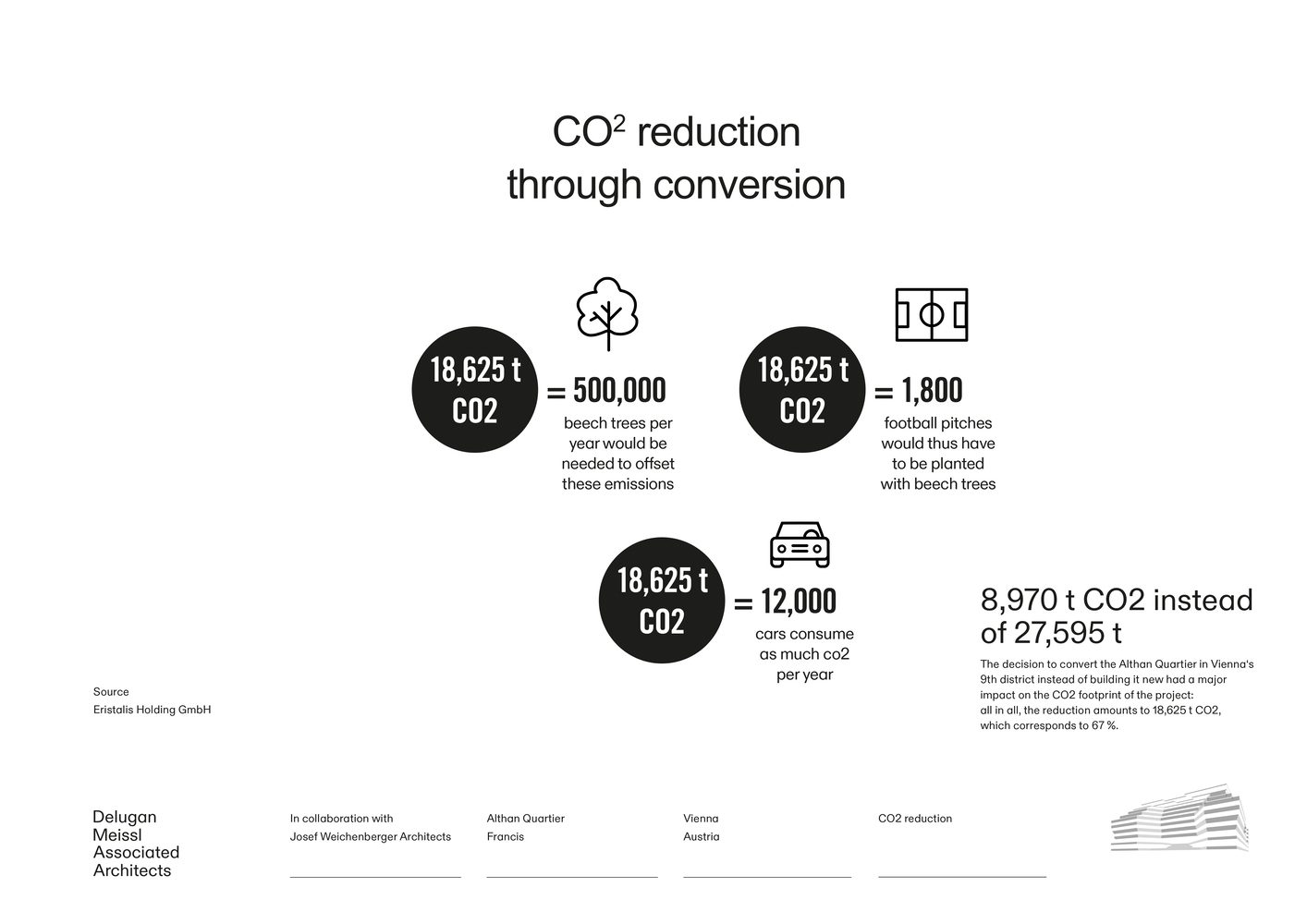 Conversion or the beauty of chances — The project illustrates the potential for urban development and the environment that lies in the transformation of existing buildings. Particularly in times of land and resource scarcity, the preservation and further development of valuable existing structures is worthwhile. As a large proportion of the so-called grey emissions is bound up in the steel and concrete supporting structure, conversion in the case of Francis means enormous ecological benefits: instead of 27,595 tonnes of CO2 for demolition and new construction, the value for conversion is 8,970 tonnes of CO2 – a saving of 67 percent. According to the results of a study by sustainability expert, architect, and civil engineer Werner Sobek, 122,480 tonnes of concrete and 10,944 tonnes of steel were saved, which is groundbreaking regarding the shortage of raw materials and climate change. In addition, the quality of life of local residents was maintained during the renovation – an estimated 10,000 lorry journeys were avoided by not demolishing and rebuilding the existing. Necessary dismantling work, removal, and recycling were carried out inside the building and in the underground loading yard, minimizing dust, noise, and construction site traffic.