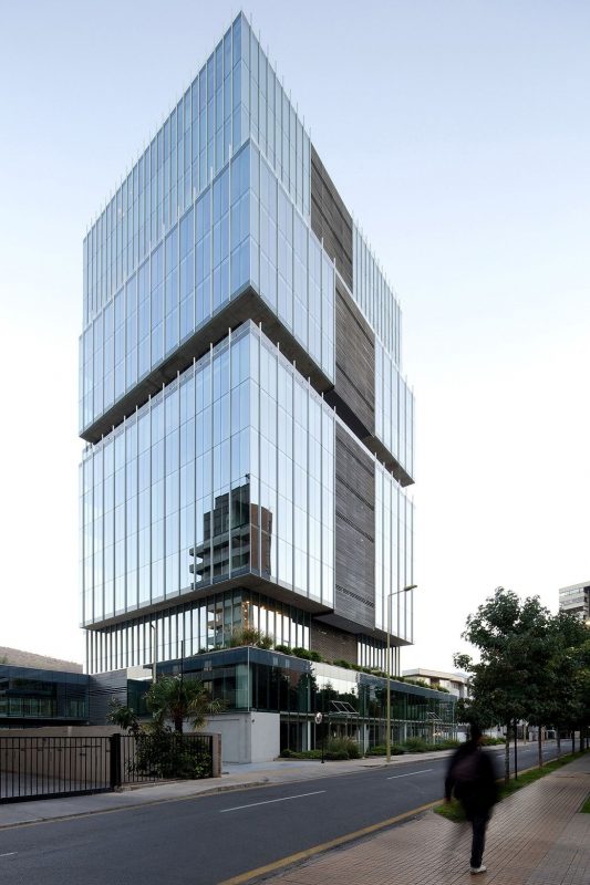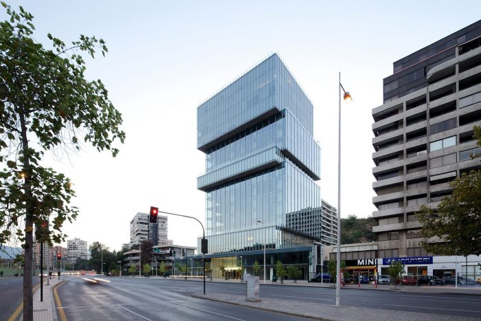 Designed by Handel Architects, Alto El Golf is a 312,000 sq. ft. (29,000 m²) office building, recently completed in the El Golf section of Santiago. For this project, we strove to rethink the standard office typology. Santiago has a mild climate and the Chileans embrace nature and the outdoors. In addition, the site is surrounded by streets on three of its sides, generating an idle condition with ideal sun and visual exposures.