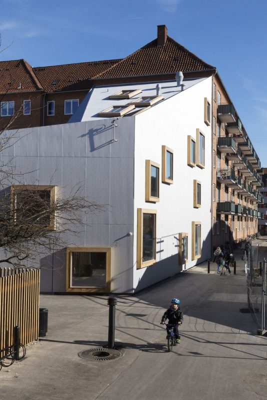 Designed by Dorte Mandrup Arkitekter, The Children’s Culture House mediates the varying scales of adjacent buildings through extruding and cutting their forms. The joint of the building, where the extended lines of the existing buildings meet, is low- ered to allow maximum sunlight to reach the neighboring courtyard. The expression of the Children’s Culture House is surprising and imaginative: the roof and facades are treated the same, and the House does not have a “start” and “end” as ordinary houses do.