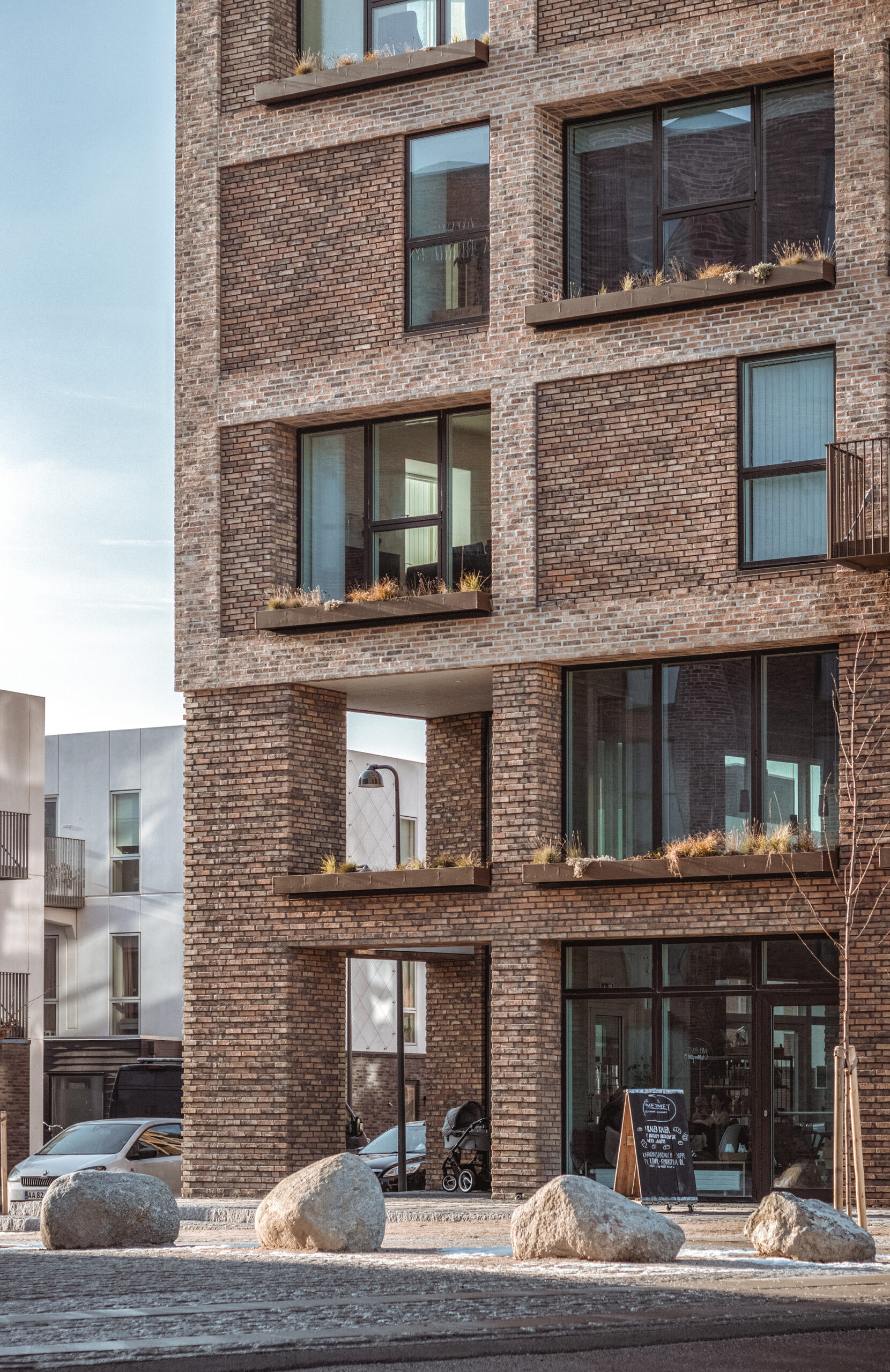 When the last wholesalers left the area, the architectural environment was in a state of disrepair. Tegnestuen LOKAL chose to expand the frame of reference to include the nearby industrial complexes of Carlsberg and F. L. Smidth, where the buildings have stood the test of time. A palette of red/brown bricks grounded the new residential area with Copenhagen’s history and a special emphasis was put on detailing the brickwork of the new buildings. The tower and building body integrate the history of the vegetable market with the buildings by creating a vernacular of clear-cut, well-detailed volumes of bricks and plants.
