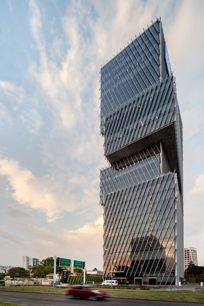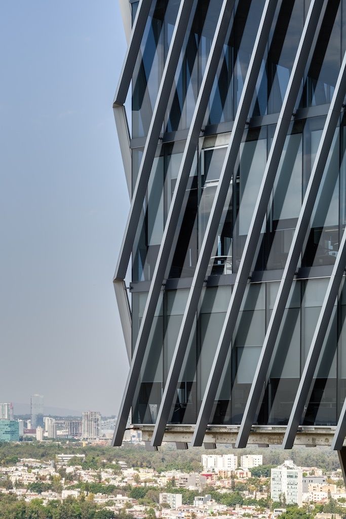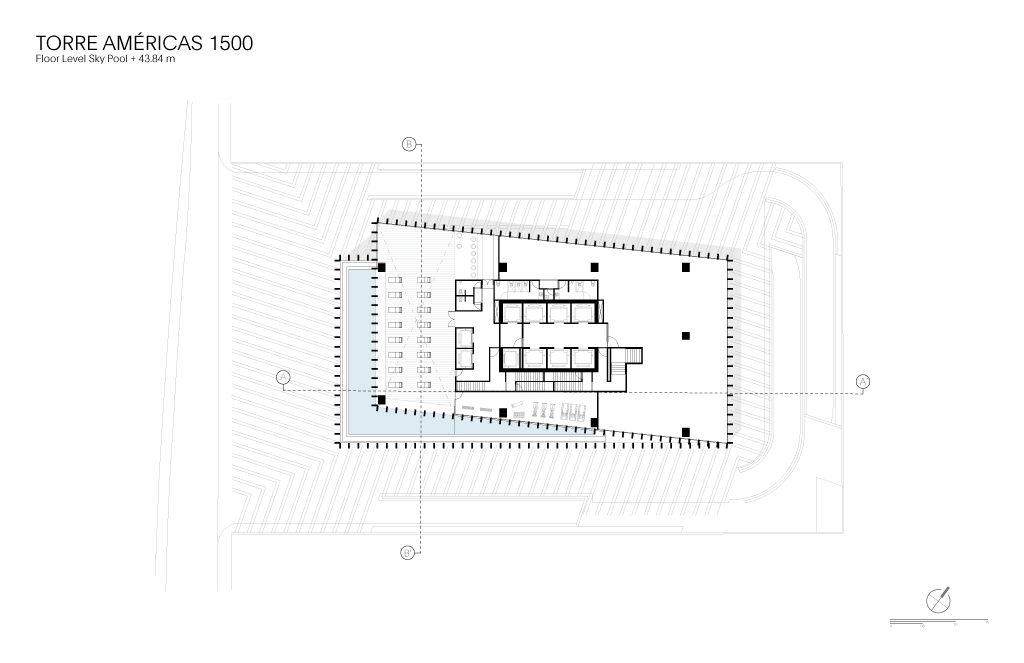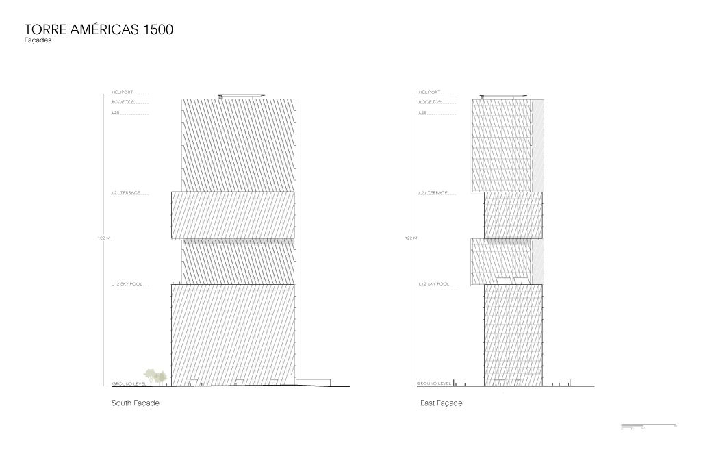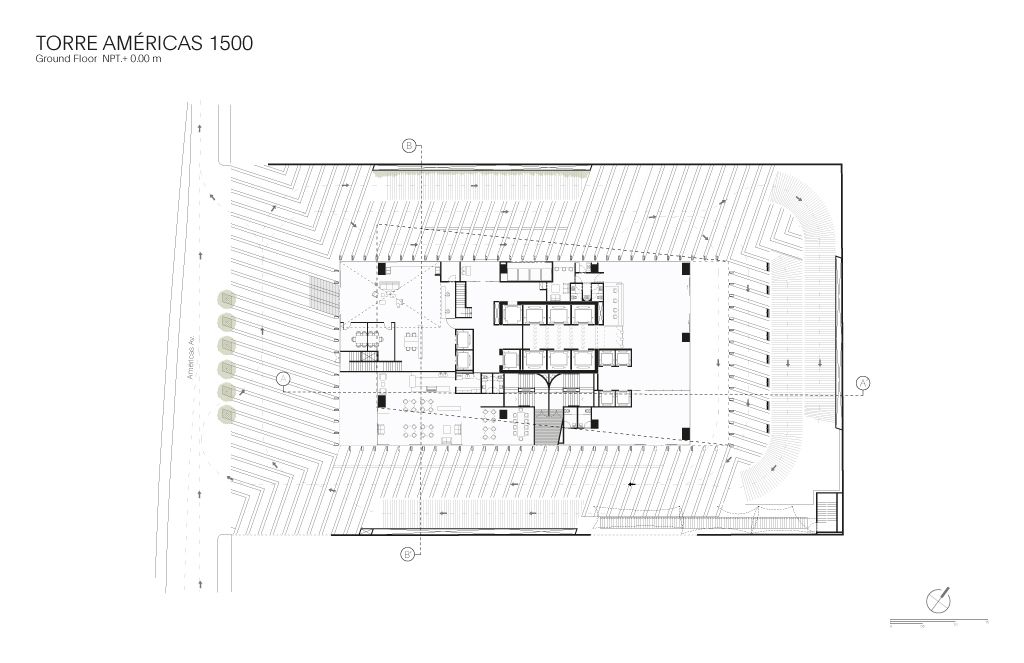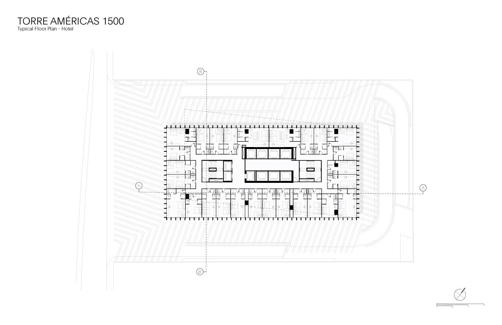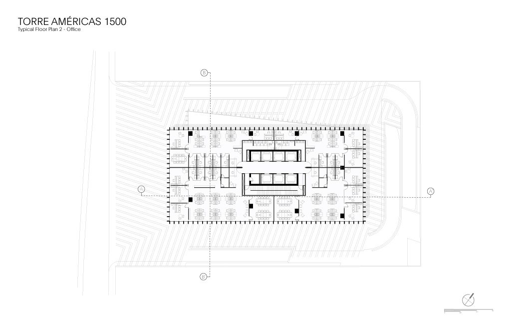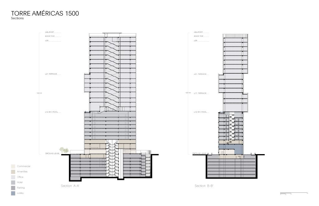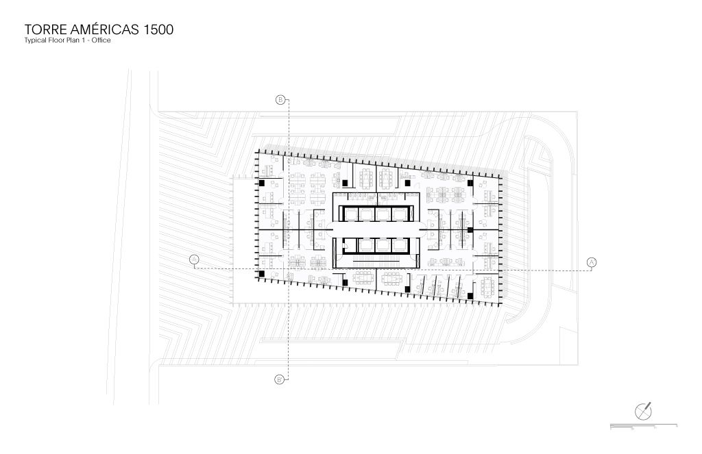 Torre Américas 1500 is the first stage of development of a whole complex. This first stage is located on a site measuring 4,116 m², with a built area of 29,461 m² distributed over 26 floors from the ground floor to the last office level, below the heliport. There are 7 basement levels covering a total of 28,509 m². The structural design is based on post-tensioned concrete slabs and a central circulation core.