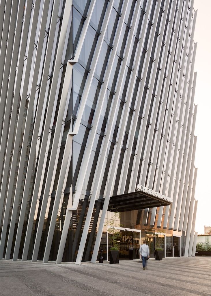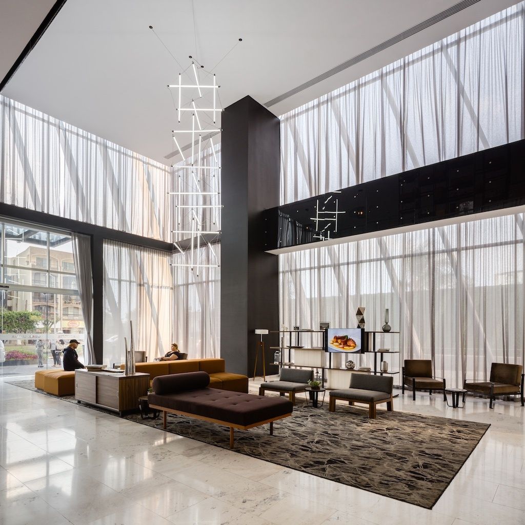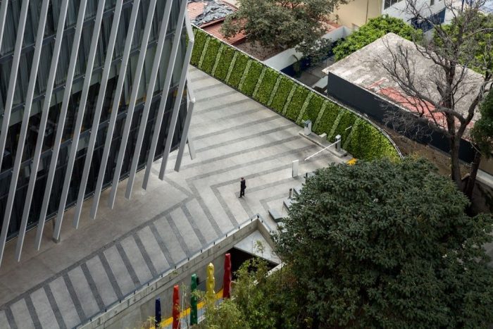 The ground floor is conceived as a plaza, a large public space, providing access and transit for the building’s various uses. A triple elevator core facilitates the operation of the hotel, offices, parking lot, and services. The vehicular and pedestrian entrances are set in a large plaza with textures and vegetation giving pedestrians priority over cars. The dominant textures used in the floor surface are natural limestone, which continues the geometry of the façade across the ground, with randomly-placed areas of paving.