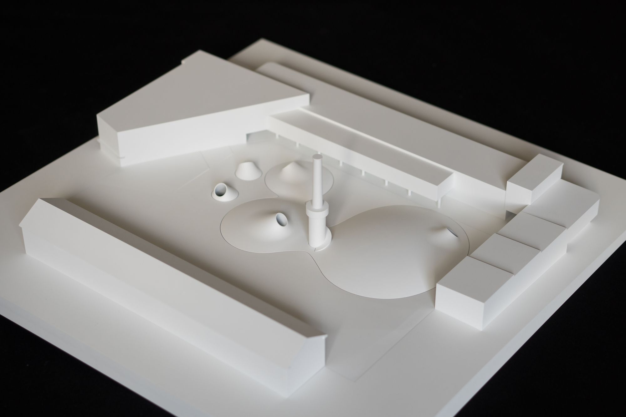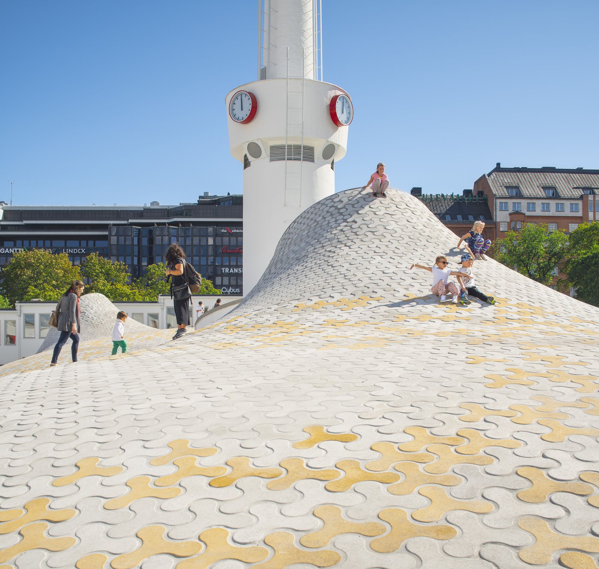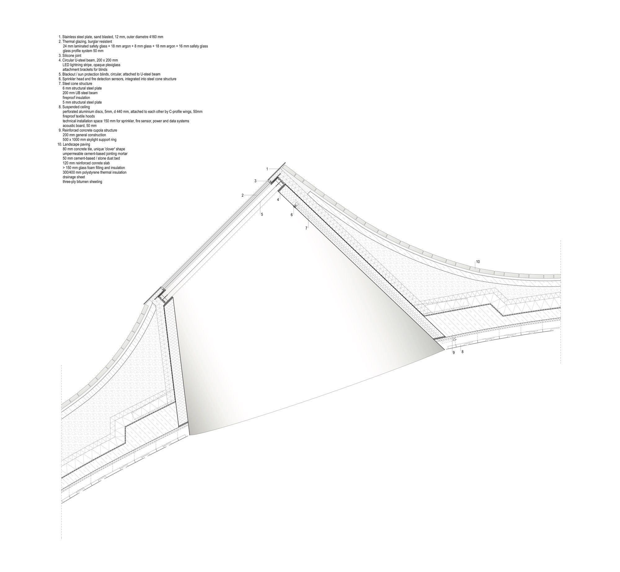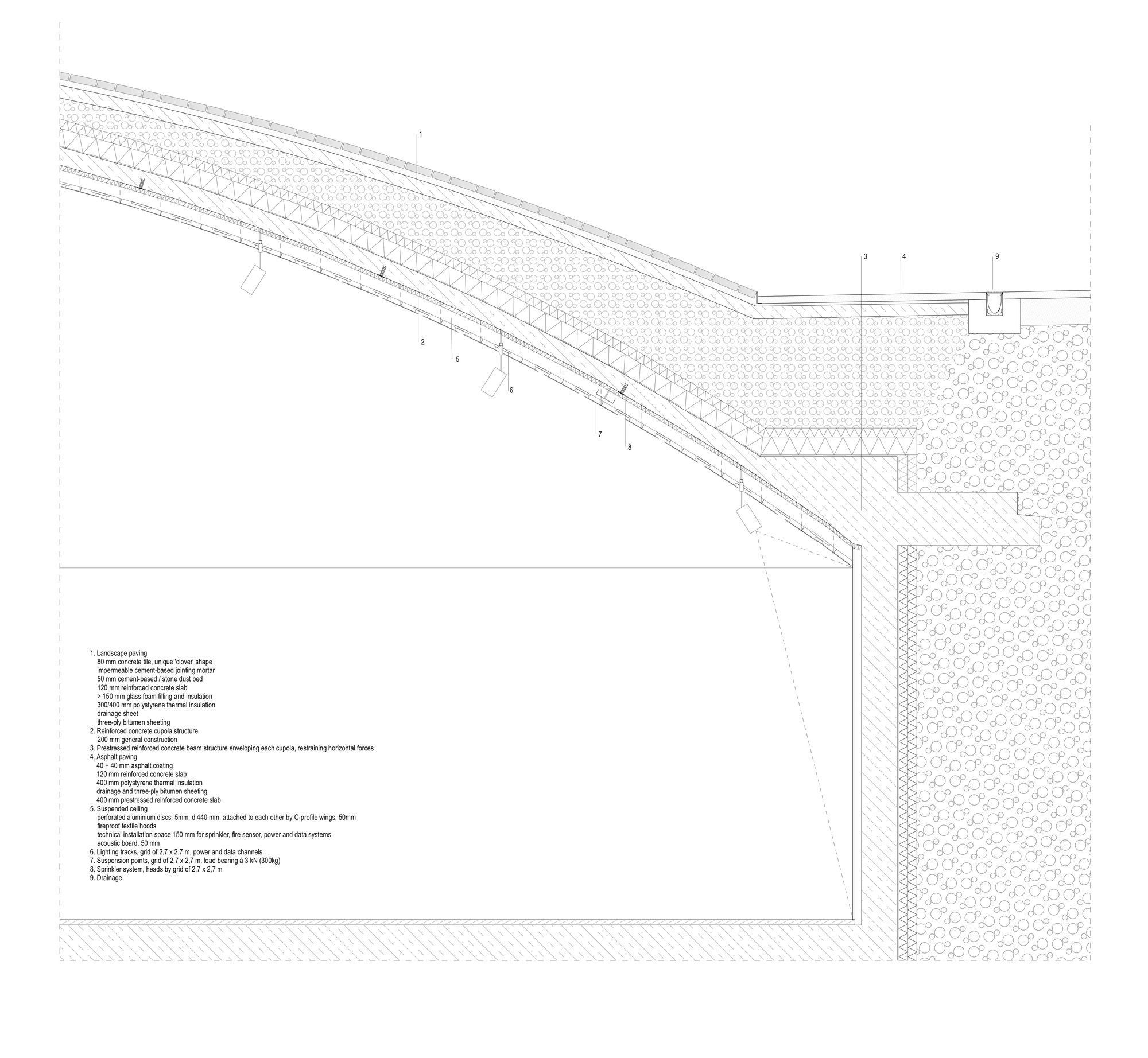 From the foyer of the refurbished Lasipalatsi, visitors descend a staircase past a picture window that affords views over the public square, into the underground museum. The roof of the new gallery is formed by a series of domes with angled roof lights that frame views of the surrounding buildings and allow exhibitions to be lit with natural light if the curators choose. The shape of the domes is expressed in the topography of the newly landscaped public square which sits above the galleries, as a series of gently rolling forms clad in concrete tiles.