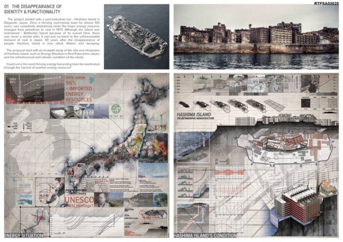 Once a thriving coal-mining town for almost 100 years, Hashima Island was completely abandoned when the major energy resource changed from petroleum to coal in 1974. Although the island was nicknamed – Battleship Island because of its overall form, there was never a master plan. It was just accident to the unforeseeable demand of coal in Japan. 40 years after the disappearance of people, homes, offices and factories, were cracking and subsiding, as if nature has taken over. Rather than following the usual trajectory of preservation, the proposal is a creative intervention that anticipates the process of decay and harvests energies and by-products.