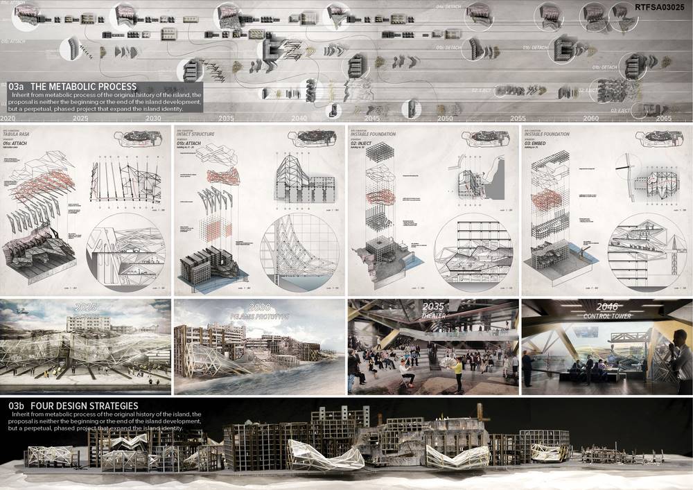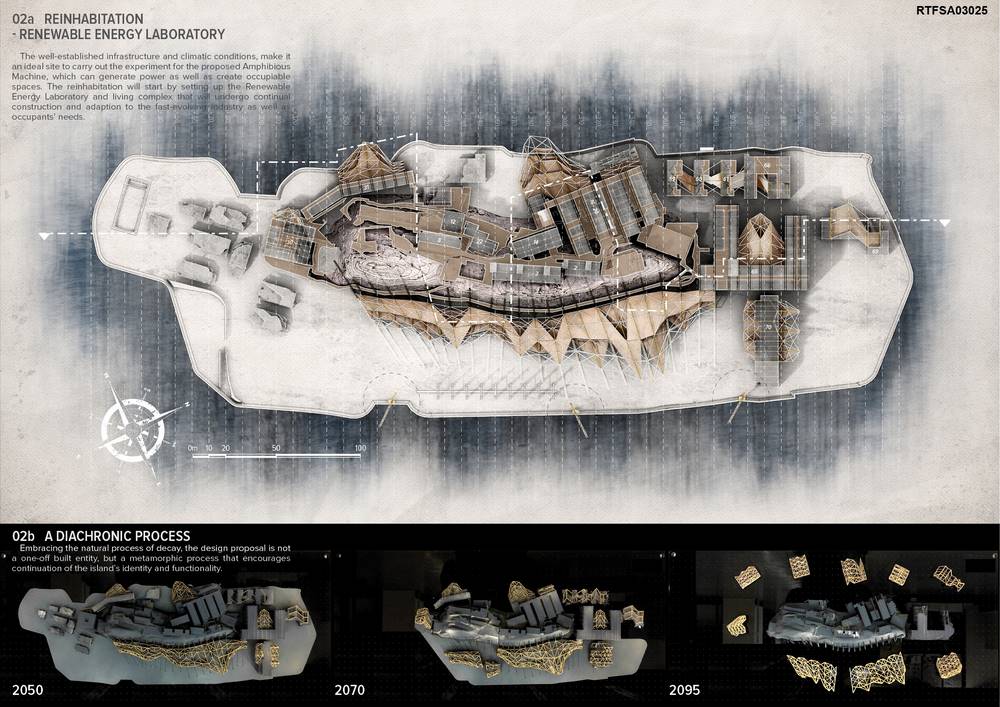 With the well-established infrastructure and climatic conditions, the re-inhabitation of the island will started through a renewable energy laboratory that will undergo continual construction and adaption to the fast-evolving energy industry as well as occupants’ needs. The proposal architectural system, entitled Amphibious Machine, was an inspiration from Amphibians which inhabit a wide range of habitats such as terrestrial and aquatic ecosystems. In a terrestrial mode, the Amphibious Machine is simply a static structure that allow the habitation of a community. While in the aquatic mode, the machine will become dynamic that it could either floats according to the wave motions, or absorbs seismic movement with its built-in mechanism, thus, mitigate certain threats caused by sea level rise.