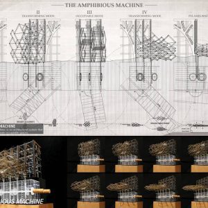 The Amphibious Machine is comprised of two major structural components. The primary structure in diagrid layout (for vertical loads), it acts with a scissor-like mechanism through the rotatable joint at each intersection. The secondary structure (for lateral loads) is composed of a hydraulic system which could extend and shrink. Both of these structural elements shall be made out of hollowed steel tubes, therefore, could float on water in any cases.
