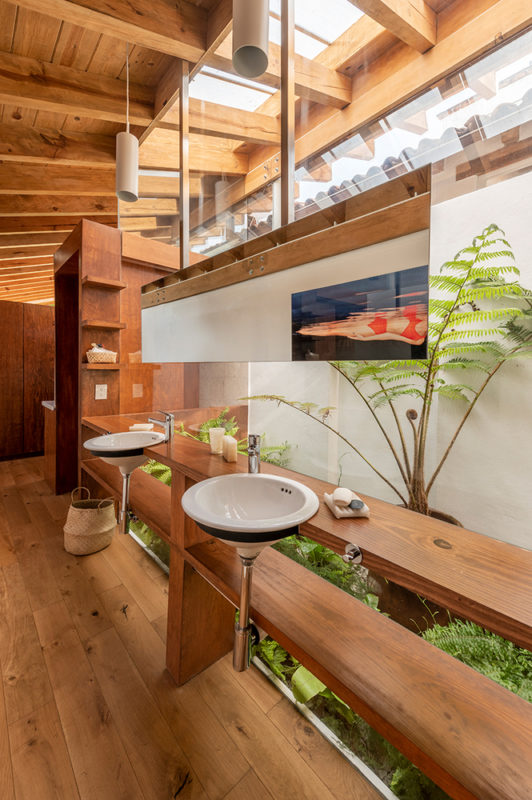 Ampliación Valle has a bedroom that overlooks a field, a study area, an extended terrace, a full bathroom, a kitchenette, a laundry room, and a walk-in closet. The bathroom and dressing room were specifically designed for the comfort of the retired couple. They incorporated an inner courtyard to provide natural ventilation and lighting, and to bring the outdoor landscape into the bedroom.