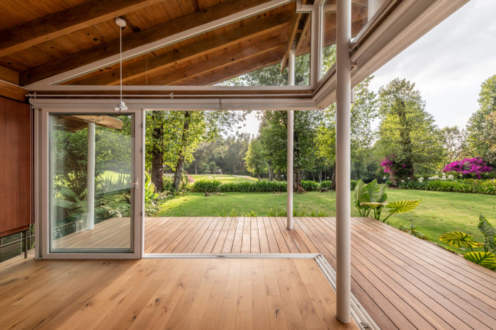 The “Ampliación Valle” project is situated in Valle de Bravo, Mexico, and features a unique French-style chalet house that was constructed in 1965. This house stands out due to its gabled roofs, wooden structure, and circular columns. It is also positioned in a picturesque setting that offers views of a golf course.