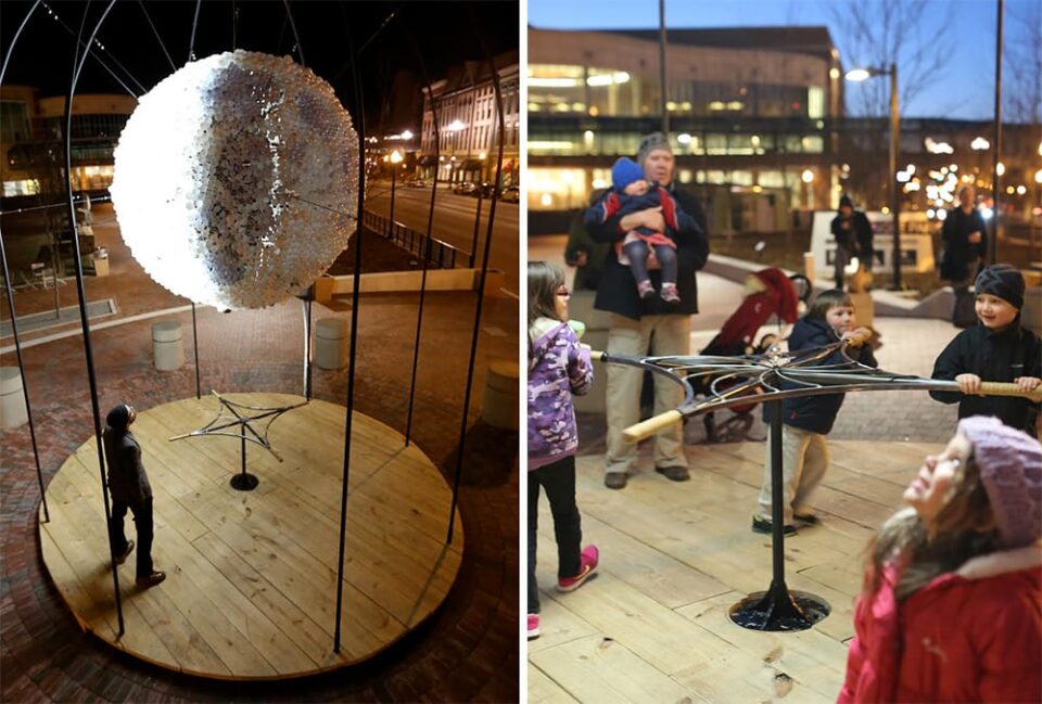 As children and adults start taking part in this art piece they begin to engage with one another, creating a very playful and fun public atmosphere. The wheel of the installation says “turn me”, inviting people to engage with the art; as they do so, they manipulate the direction of light being produced, mimicking the actual phases of the moon, as if they were controlling the passing of time.