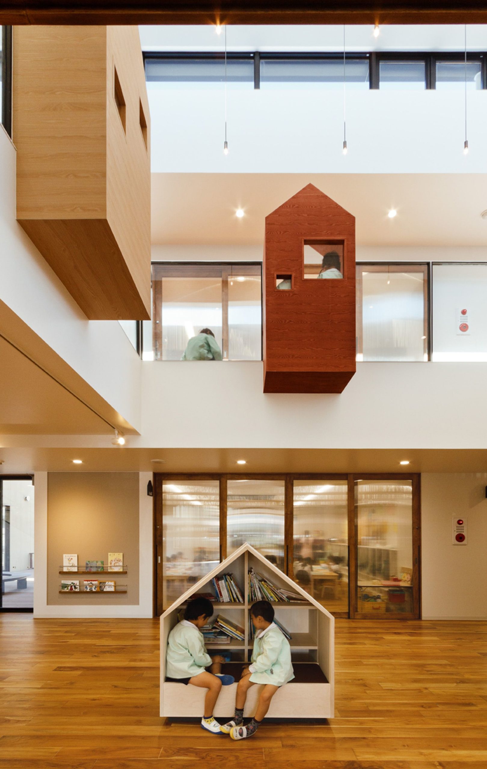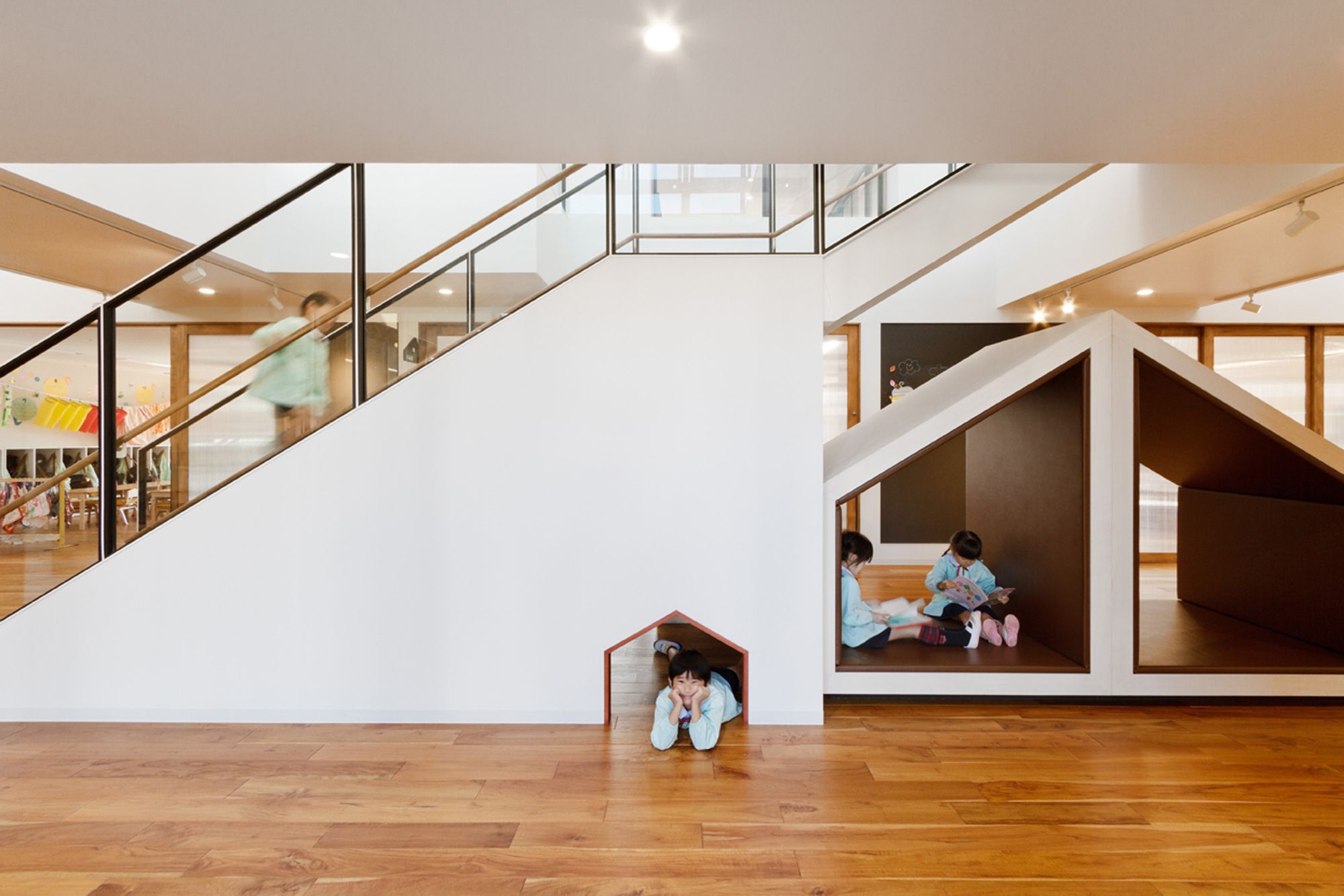 There is a small window in the hut, and it produces a new connection with children who are playing at downstairs. The hut under the stairs looks like a hole in a large tree, and a soft cushion is spread in whole space. By this, the children lie and lean in the tree where they can relax and read a book.