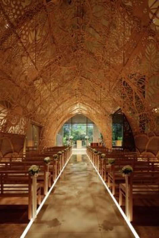 A large tree is the motif of the wooden panel design, called the Power of Flower, which carries the theme of ancestral roots and the prosperity of future generations. Through collaboration with a kimono designer, we were able to associate the various flowers and plants in the design with these concepts by using traditional patterns found in Japanese kimonos. Each wooden panel unit of the chapel measures 2m×1m, and 100 units were used. The 15mm-thick Japanese cypress panels were intricately carved by hand to show the cutwork pattern. Such meticulous labor has made this a wooden dome chapel of an unprecedented scale even within Japan. Lighting filtering through the dome’s wooden cutwork casts shadows on the aisle of the chapel like sunlight through the trees, creating an illusion that the couple are being blessed in a sun-dappled forest.