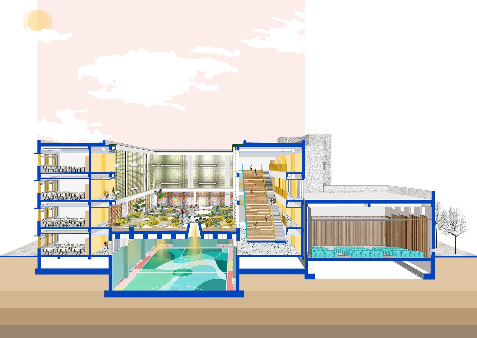 A dynamic central staircase doubles as an open auditorium, encouraging daily social interaction and hosting occasional group events. This feature, illuminated by the courtyard’s southern exposure, is the primary vertical circulation element, connecting all floors. Beneath the courtyard, the sports hall—visible through a translucent volume rising to the ground floor—becomes an integral, highly visible part of the building.