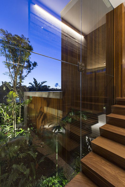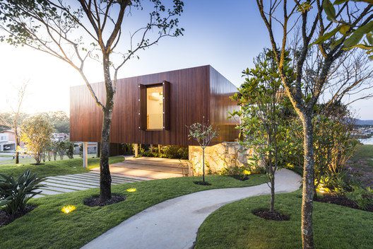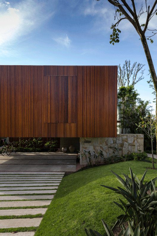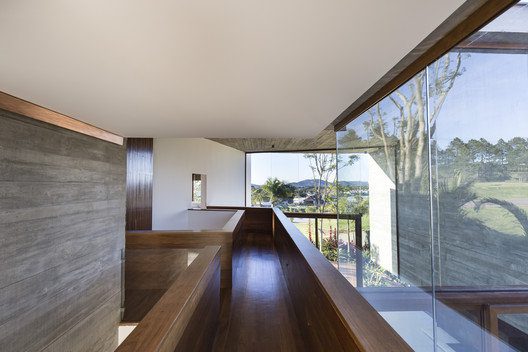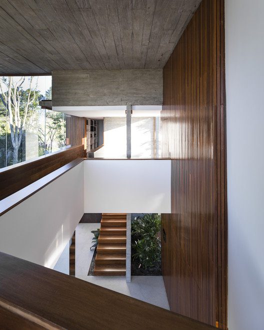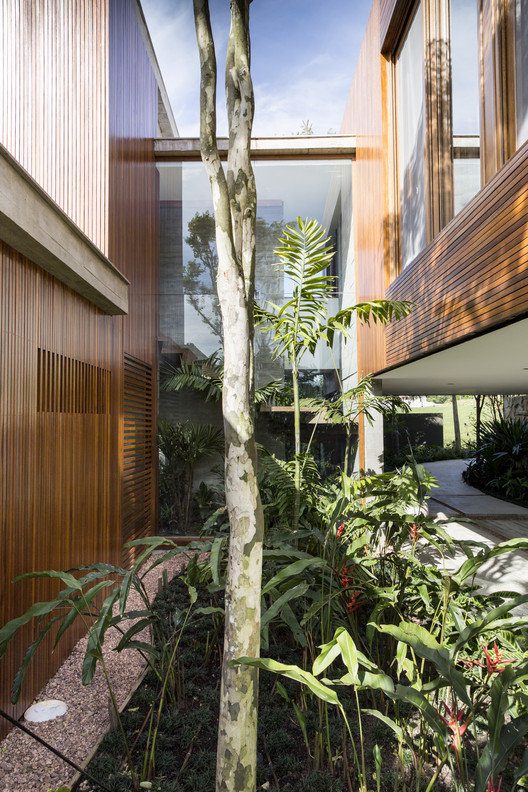 Angular House designed by Stemmer Rodrigues Arquitetura, On a raised lot overlooking a lake, the feeling of privacy and seclusion was the starting point of this 487m2 project. The wish list was specific: the resident sought references to send her back to her homeland in Napa Valley, California. Among items, a bedroom that invites to stay in bed late, cars kept in the background and an inner walkway surrounded by forest.
