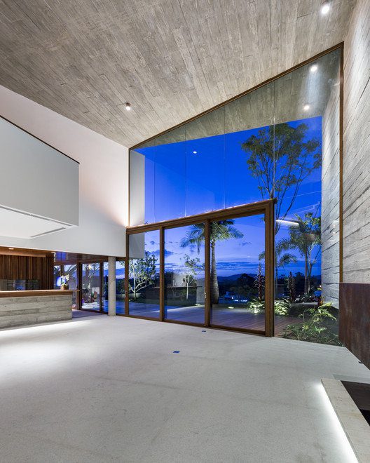 The social space is understood from the entrance into another imposing block, the second, whose side wall and ceiling are in apparent concrete, with a texture that mixes the strength of the material with the smoothness of the wood shafts printed on it. The whole space is permeated by large glass panels that extend through the total height of the ensemble, revealing a unique view of the landscape and the trees of the garden surrounding the property.