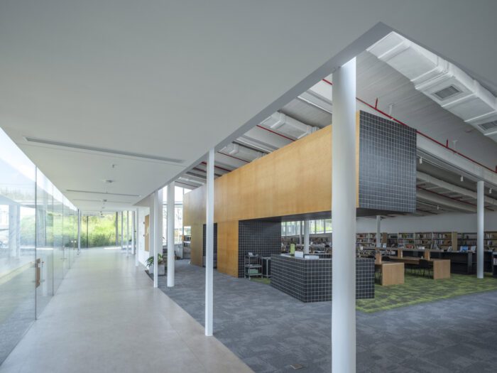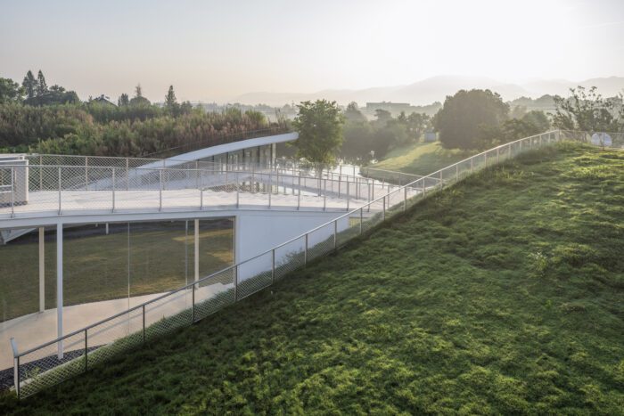 Anji Creative & Design Center, Situated in Xilong Township of Anji County, Zhejiang Province—an area renowned as one of China’s premier white tea-producing regions—the project occupies a previously unused plot on the edge of the tea fields near the town center. Originally, the site was designated for the construction of a White Tea Museum, as well as a museum for the nearby Paleolithic archaeological site of Shangmakan. In response, the building was conceived as two courtyard-based clusters extending between tea fields and a natural pond, with green roofs designed to merge the architecture seamlessly into the surrounding agricultural landscape.