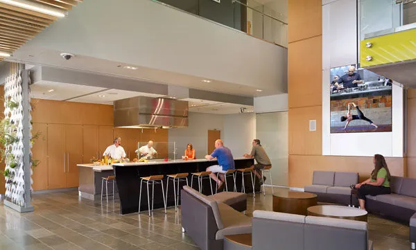 A dynamic two-story lobby, demonstration kitchen, nutrition lab with bistro, and a fitness center anchor the ground floor of the facility. Upstairs, a clinical trials center linked to research overlaps with the lobby experience and the third and fourth floors are dedicated to collaborative office spaced connected by a common wellness lounge. The wellness lounge adjoins a roof garden featuring mountain views of the Colorado range.