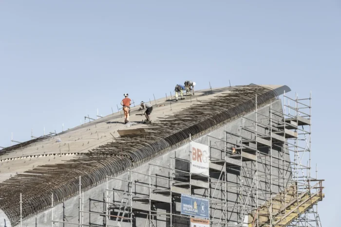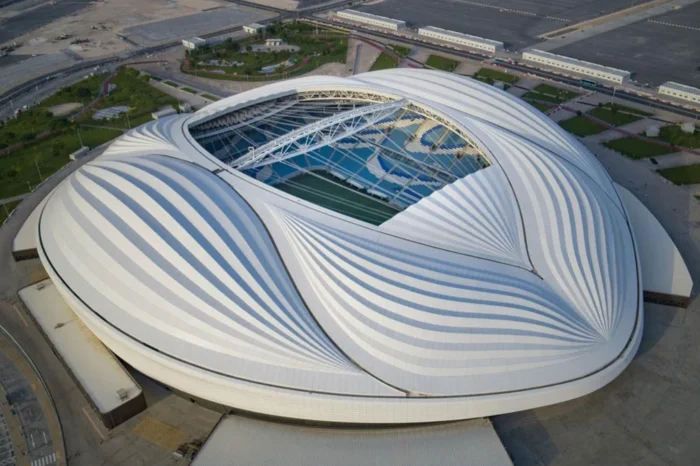 The stadium have a retractable roof that will be able to close in approximately 30 minutes. a light sleeve, made of steel wires brought together at an oculus, will also provide shade to the entire pitch and contribute to the efficiency of the cooling system before the match. resembling curved hockey sticks, a series of 540-tonne pillars are the main support for the arena’s retractable roof. the roof steel elements for the columns originated in China and were fabricated in Italy and later shipped to Qatar.