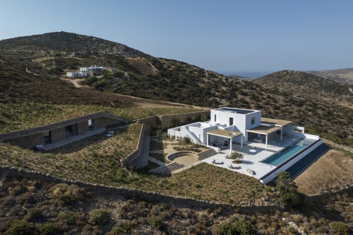 Antiparos Village, Perched on the hills surrounding Antiparos Islands’ caves, this seasonal residence boasts expansive views of the Cycladic archipelago from the island of Tinos as far south as Sikinos. The sloping property is dotted with three building clusters – a white house and two subterranean slits on the mountainside – giving the project the name ‘Antiparos Village.’ Between these volumes, a sensitive landscaping of trees and shrubbery reveals organic pathways through a terraced garden, which connect the distinct buildings into an intimate, yet quietly private, whole.