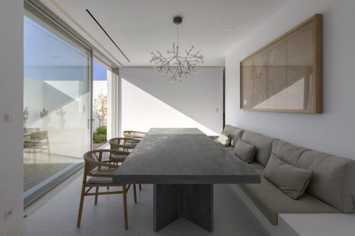 Together with the simple geometric forms of the architecture, these natural materials and subtle color tones create a modest home which focuses one on the uniqueness and breathtaking beauty of the island, with its sweeping views of deep blue and the sounds of its relentless August wind. As a tribute to the nature that makes this island special, Antiparos Village is designed as an off-the-grid residence, powered by solar energy and fed by groundwater found on site. Paired with a smart home system that optimizes their use, these natural resources on-site provide the necessary energy for the functioning of the house, with any excess power stored in an array of batteries.
