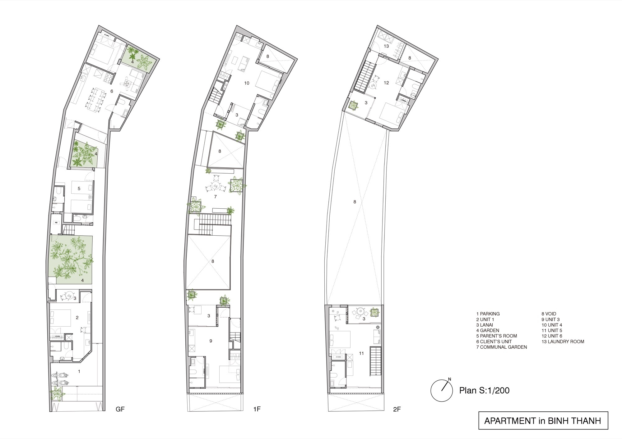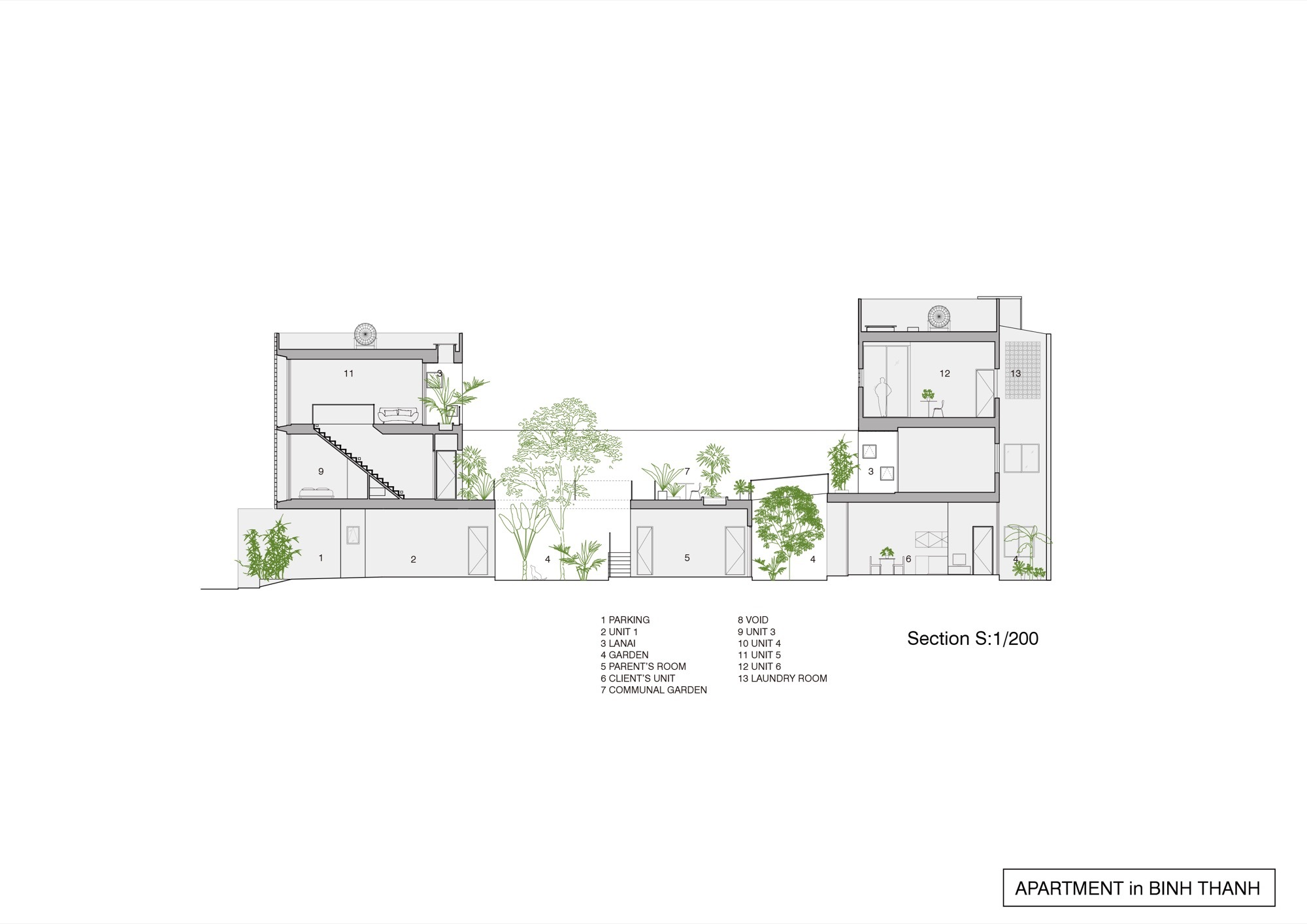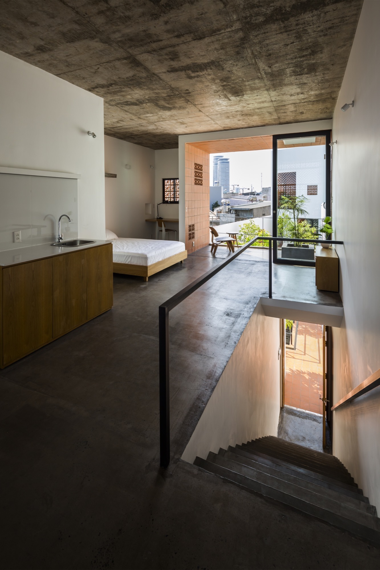 Apartment in Binh Thanh is about a small apartment with seven rooms in Binh Thanh District, a nearly central area in Ho Chi Minh City. The site has unique slightly curved shape by merging several plots of different sizes with the total length of around 40 meters. It is located in a high density area surrounded by two or three-storey buildings. On initial inspection of the site, we felt that there is much potential due to: “remaining urban open space / void created haphazardly in the crowded city”. Therefore, on careful consideration, we concluded that this open ‘urban’ space can be utilized to design both an attractive and well-designed open spaced building harnessing the natural daylight and wind.